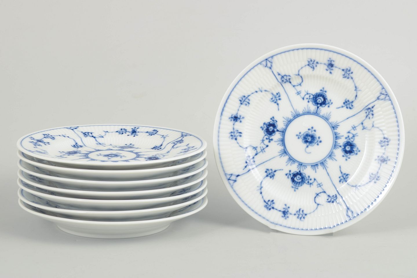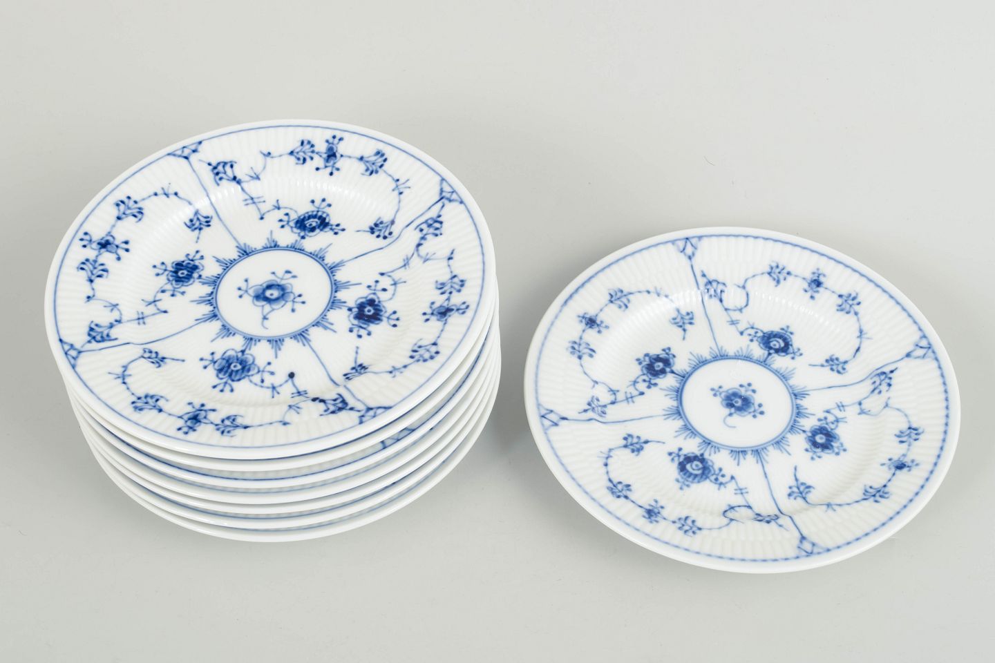 Royal Copenhagen, Musselmalet riflet, sæt på otte kagetallerkener.Beschreibung: