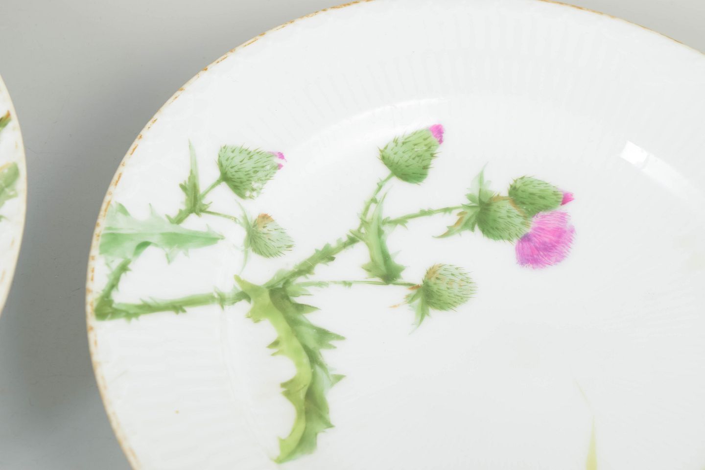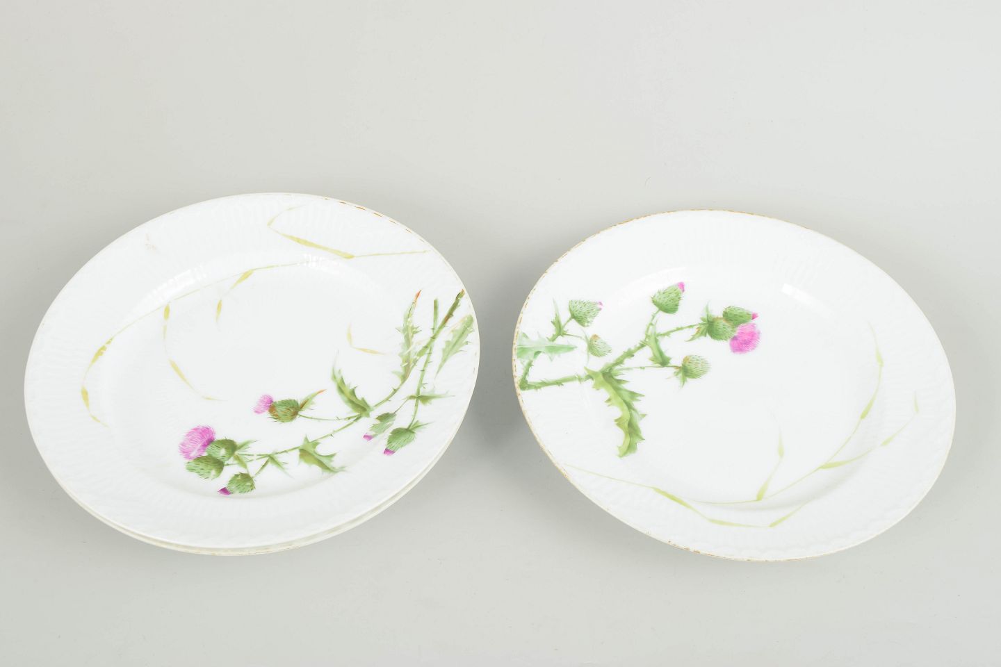 Royal Copenhagen, sæt af 3 antikke frokosttallerkener.Håndmalede porcelænstallerkener med naturalistisk dekoration med tidselmotiv og forgyldt rand. Tallerkenerne har let riflet overflade og viser det høje håndværksmæssige niveau, som kendetegner Royal Copenhagens produktion i anden halvdel af 1800-tallet.