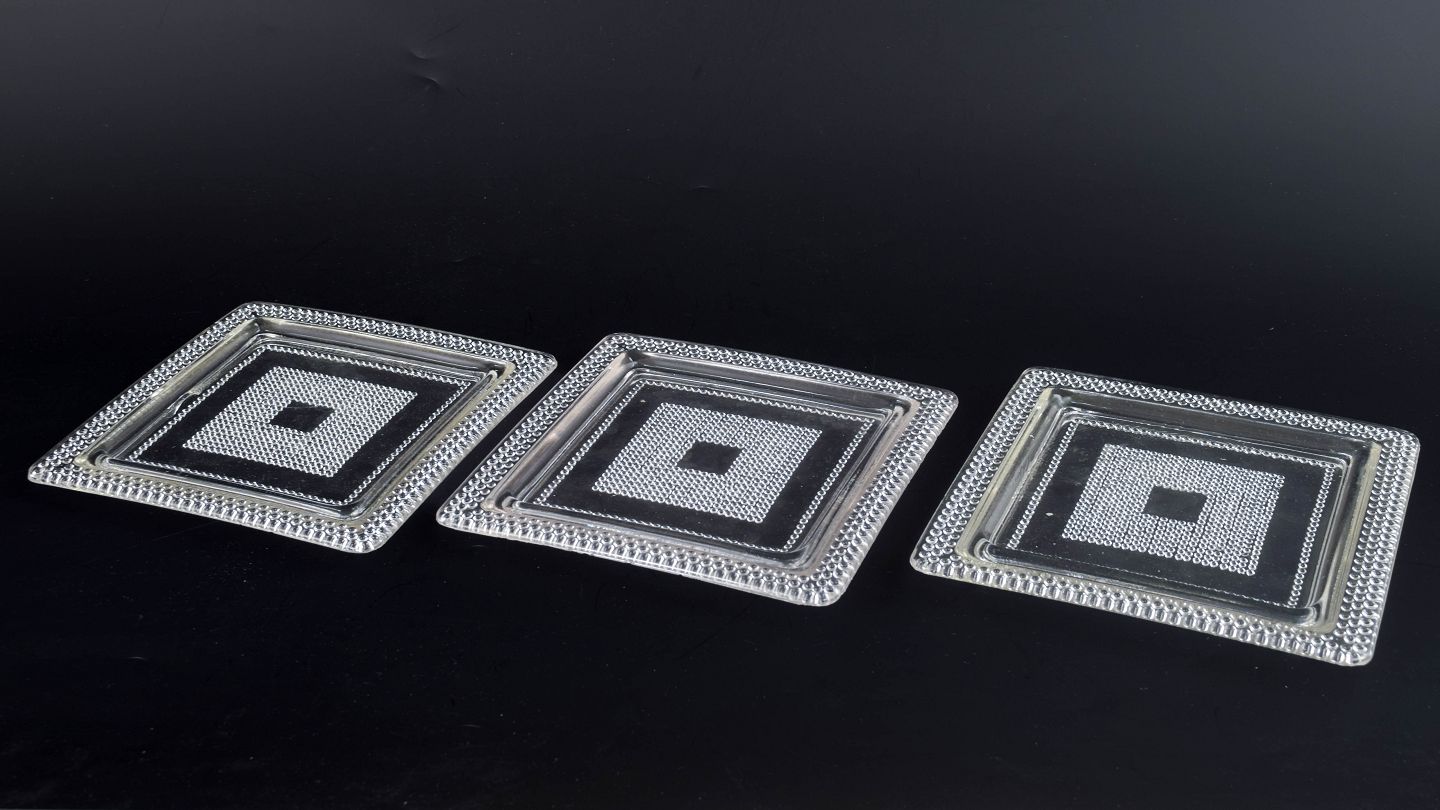 Oiva Toikka for Nuutajärvi, sæt på 3 tallerkener.Sæt på tre kvadratiske tallerkener i klart kunstglas med geometrisk relief og markeret midterfelt. Fremstillet i presset glas.