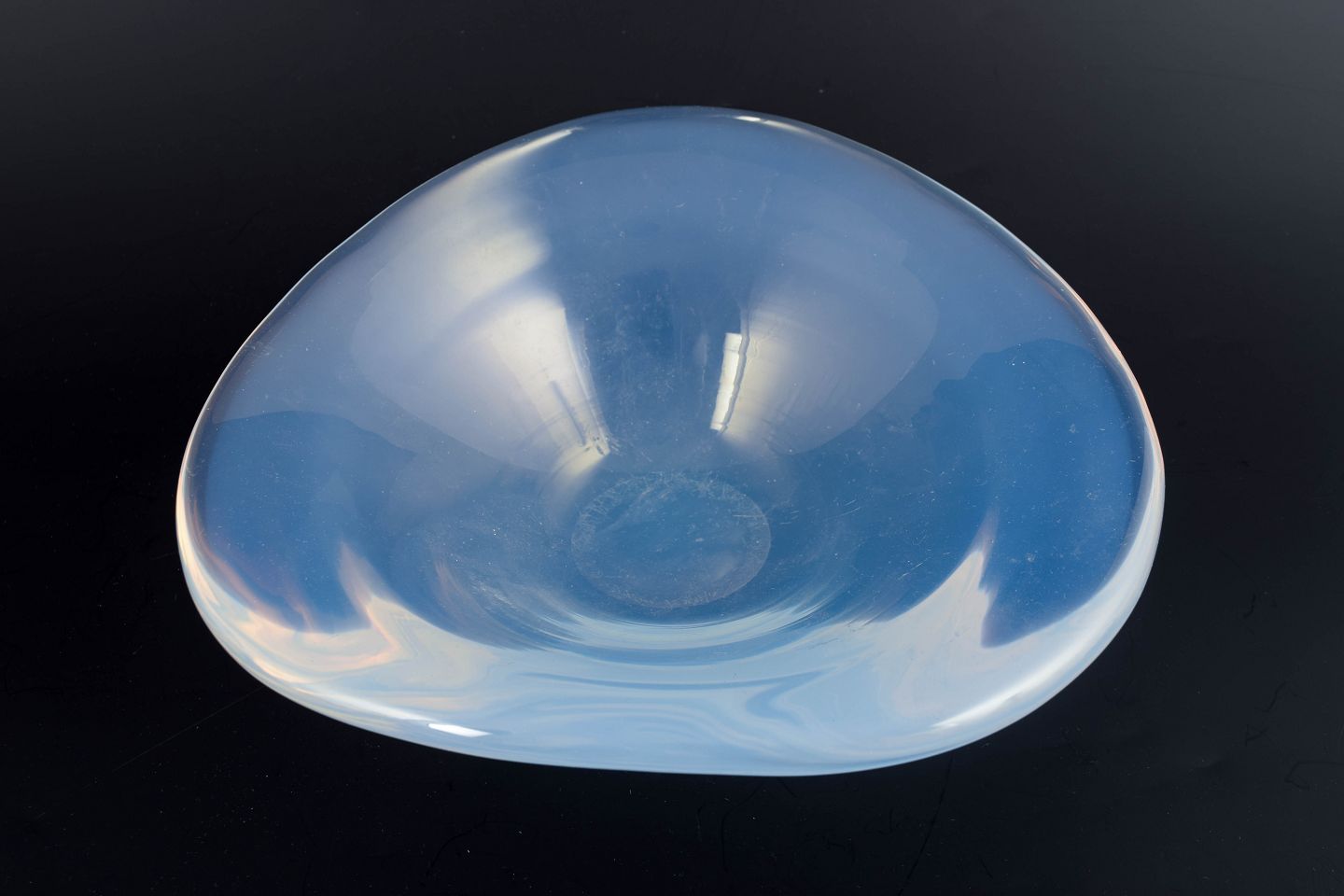 Sven Palmqvist for Orrefors, "Opak" glasskål.Organisk formet kunstglasskål i opakt lyseblåt glas med bløde, bølgende linjer. Udført i Orrefors’ opakserie. Model 3090/13, signeret.