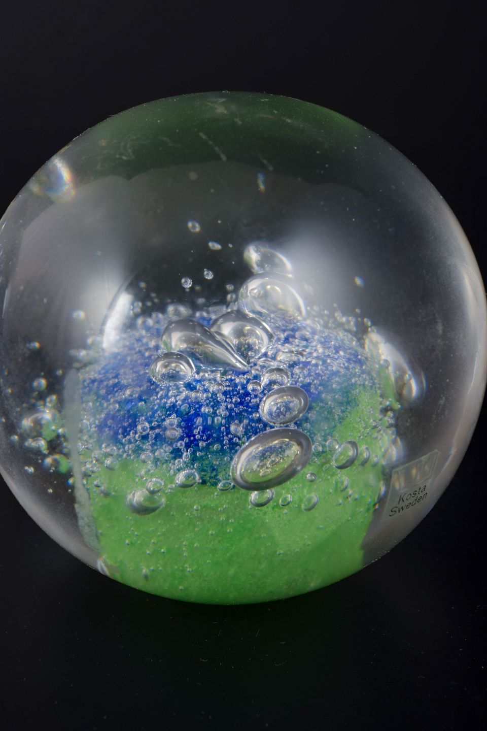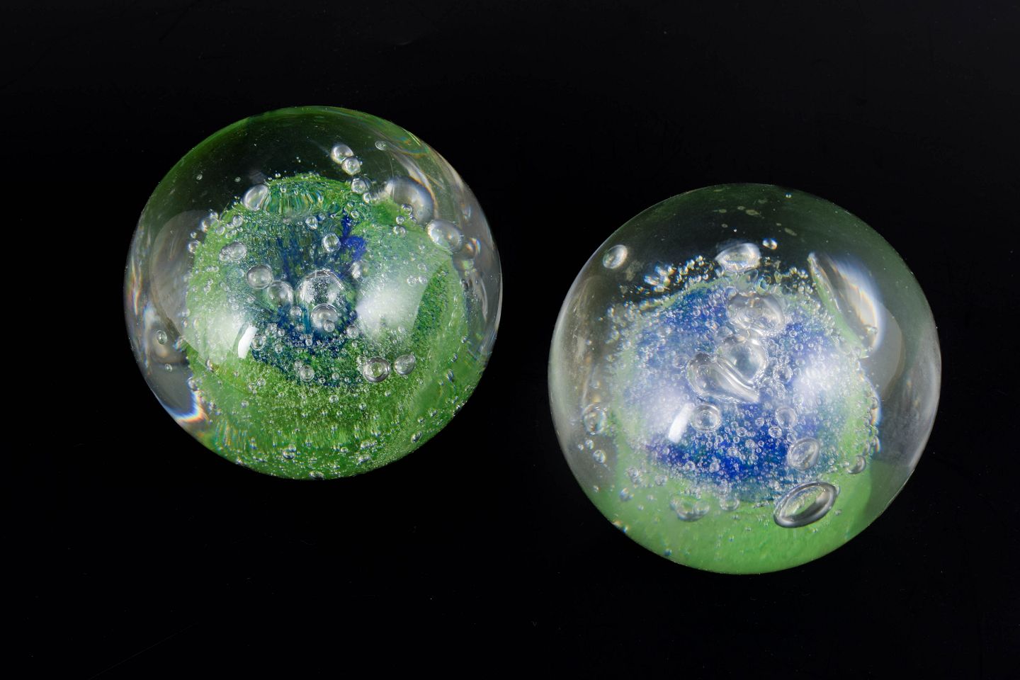 Göran Wärff for Kosta Boda, brevpressere.To Kugleformede brevpressere i klart kunstglas med indkapslede grønne og blå farvefelter samt kontrollerede luftbobler.