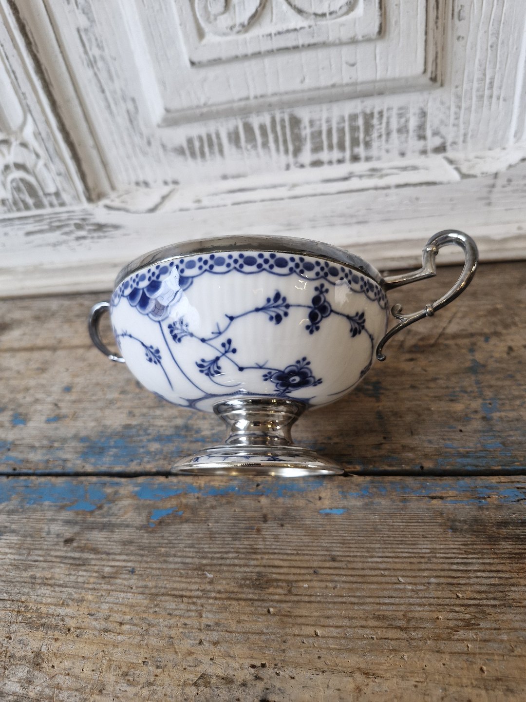Royal Copenhagen Musselmalet halvblonde sukkerskål med forsølvet montering.