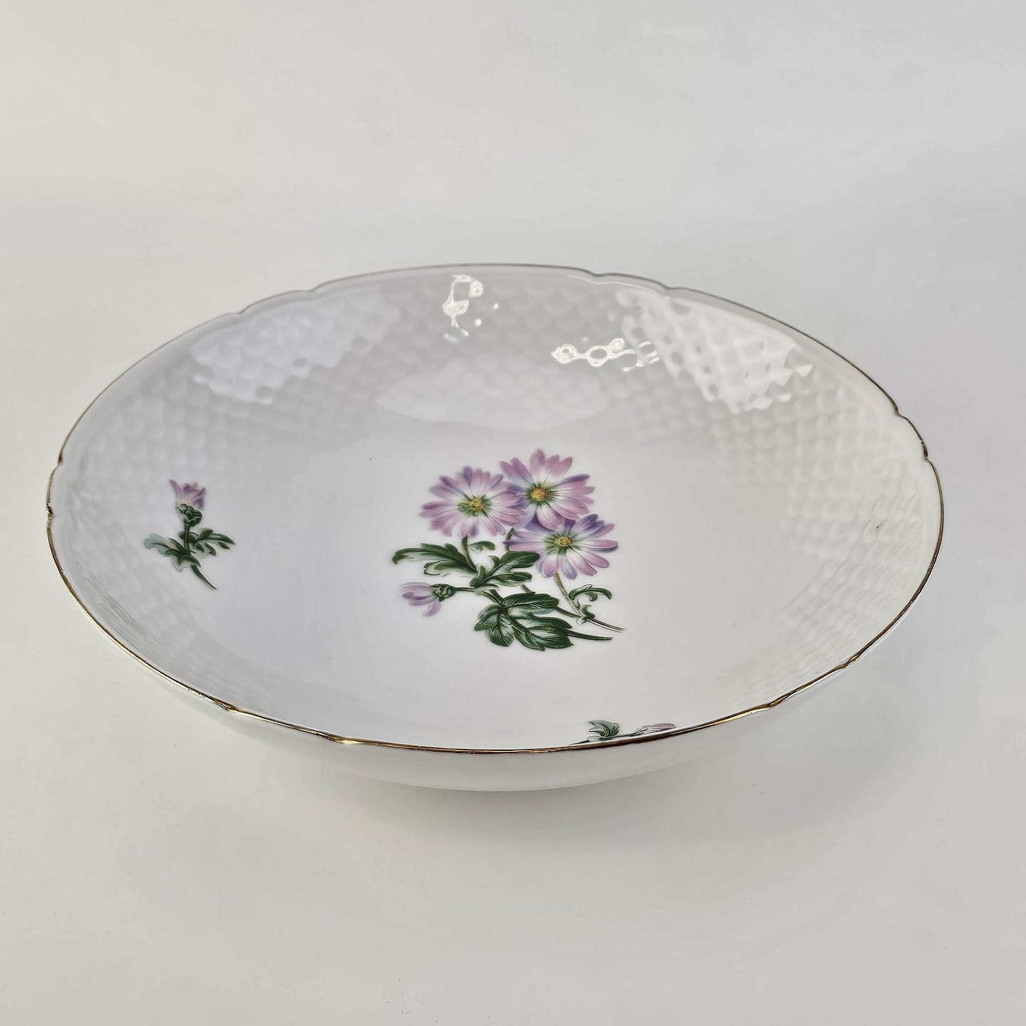Krysantemum er hvidt porcelæn dekoreret med lys lilla blomst, grønne blade og guldkant.