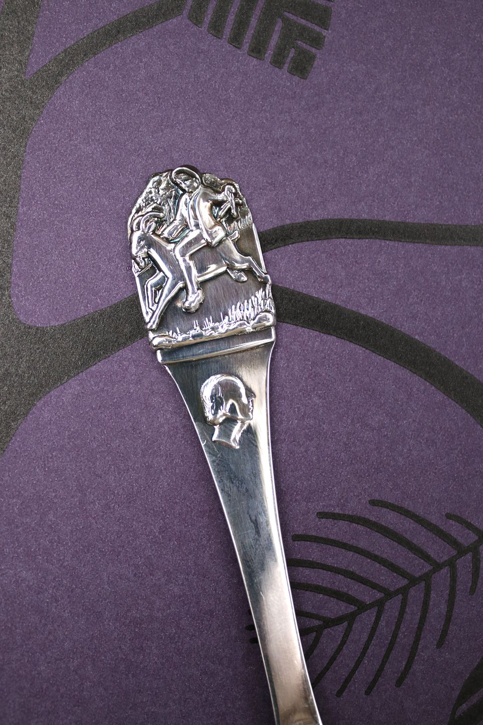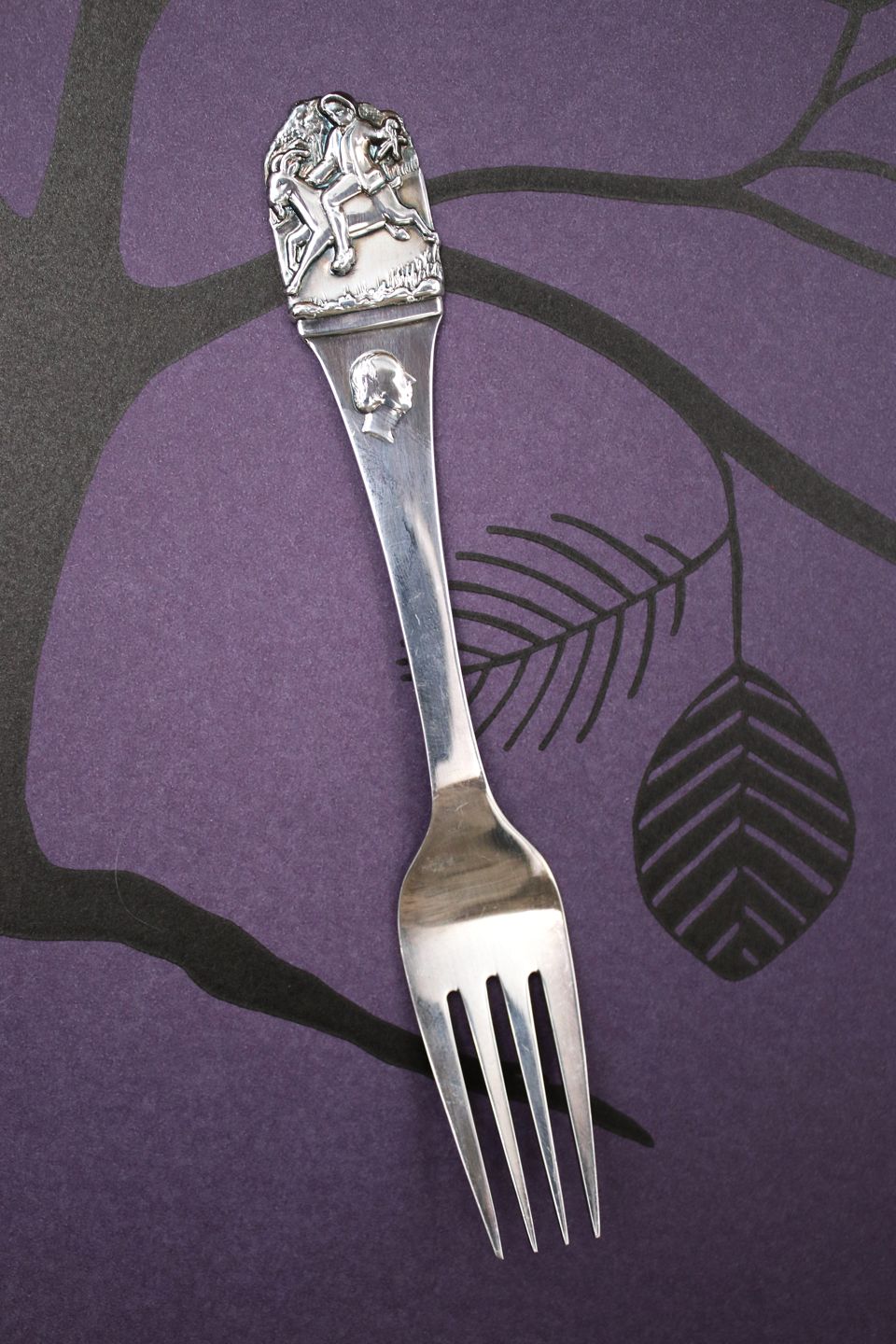 Barnegaffel i sølv (stemplet) med børnemotiver på skaftet af H. C. Andersen eventyret " klodshans "