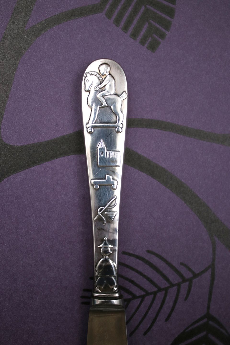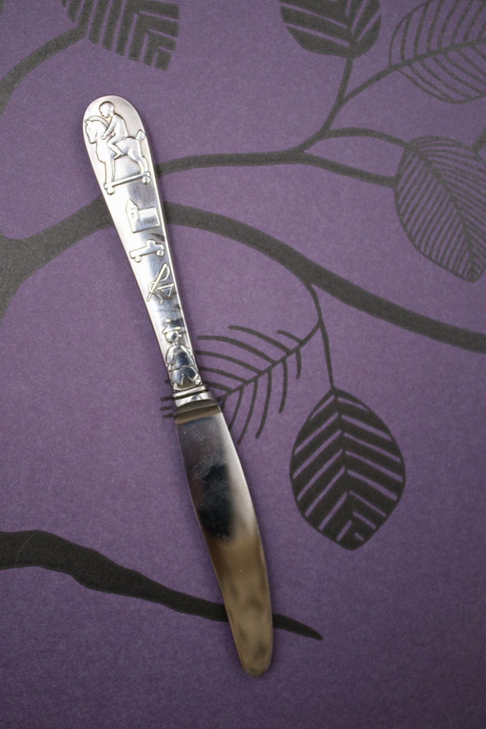 Børnekniv i sølv (stemplet) med børnemotiver på skaftet.Længde: 16,3cm.