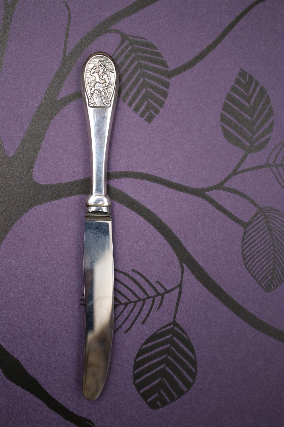 Børnekniv i sølv (stemplet) med børnemotiver på skaftet af H. C. Andersen eventyret " grantræet " Længde: 17cm.