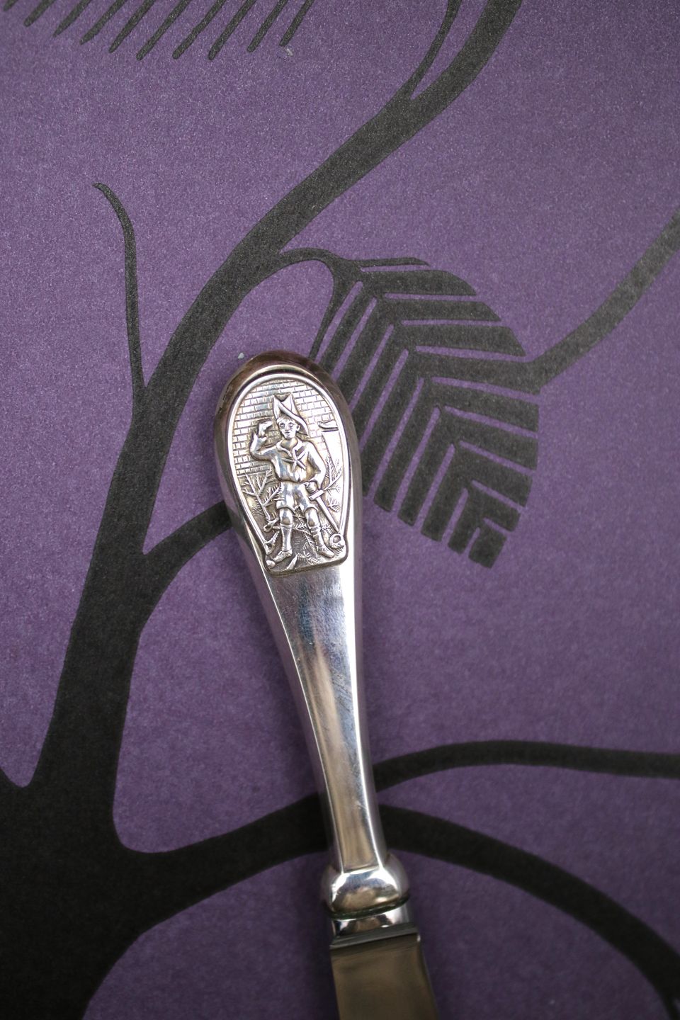 Børnekniv i sølv (stemplet) med børnemotiver på skaftet af H. C. Andersen eventyret " grantræet "