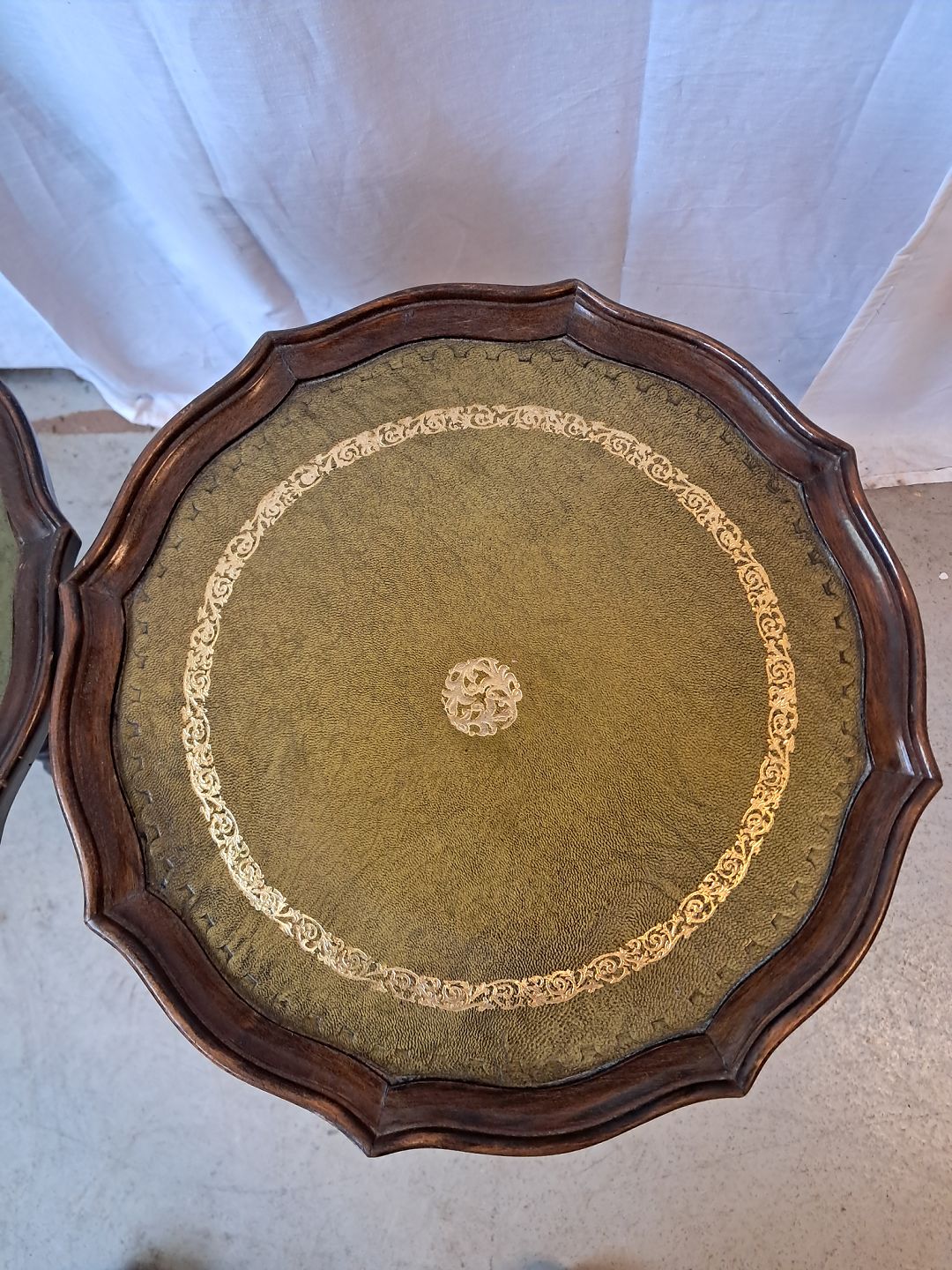 2 Pynteborde i bøgetræ med kunst læder indlæg, fra 1990erne.De har brugsspor.