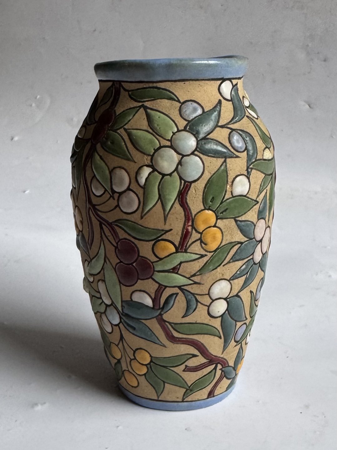Arguado Toledo vase i keramik med farverig emalje blad og bær dekoration rundt om vasen. Grundlæggeren af dette produkt José Aguado Villalba (1919-2007) havde en mangeårig produktion af keramik i lignende stil fra midten af 1960’erne til i slutningen af 1980’erne i Toledo i Spanien. Vasen er 10,7 cm høj.