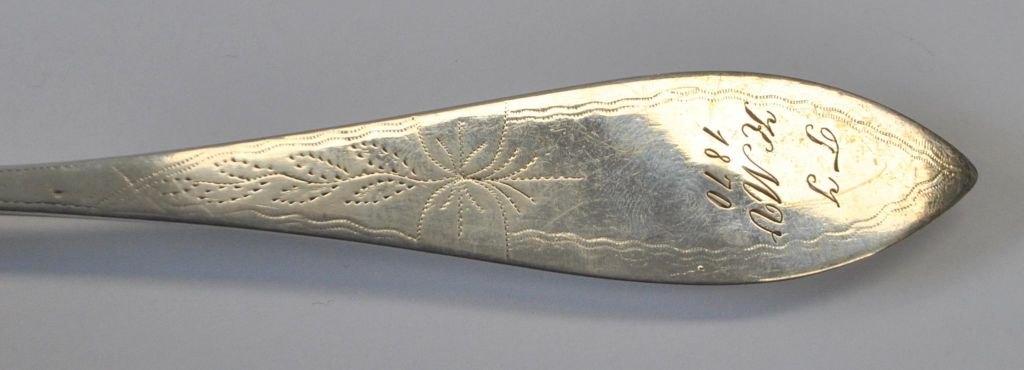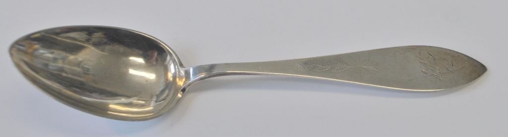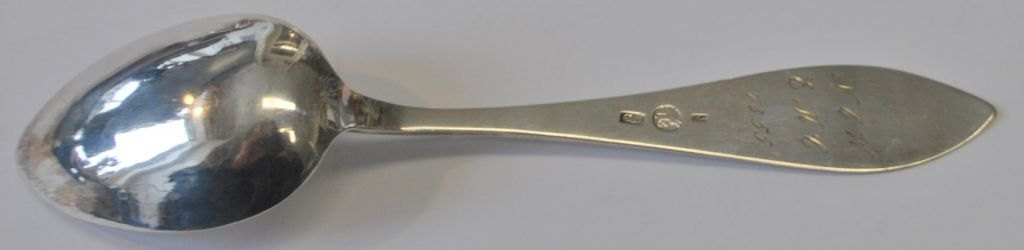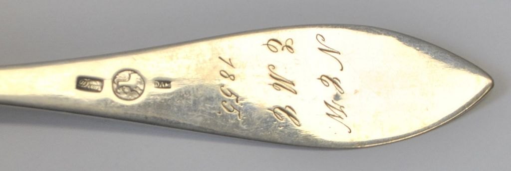 Niels Dam (1822–1873), Varde, Dänemark. Silberner Speiselöffel. Gestempelt mit Meistermarke und Stadtwappen. Länge: 21 cm. Mit verschiedenen Inschriften.Bestellnummer: 29014