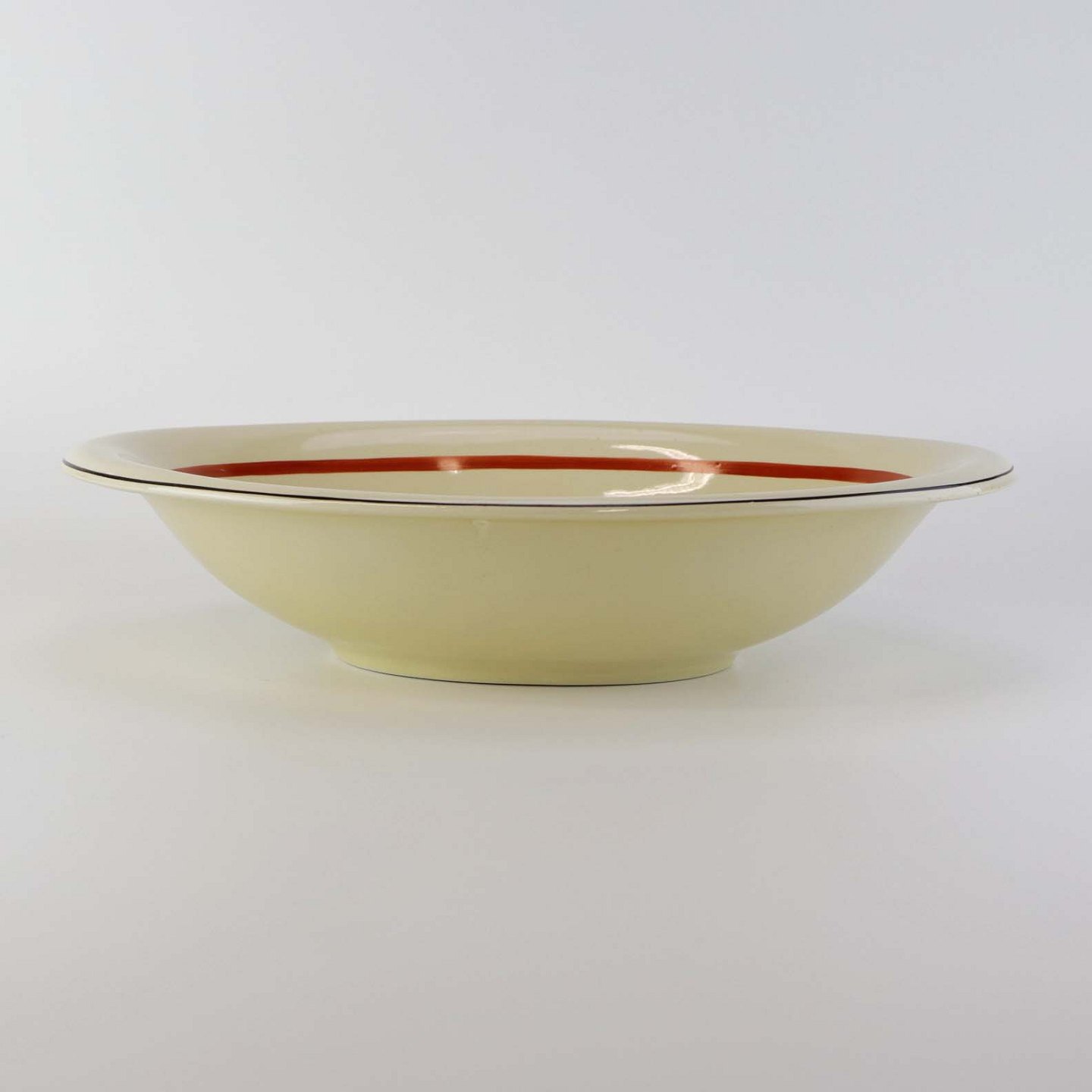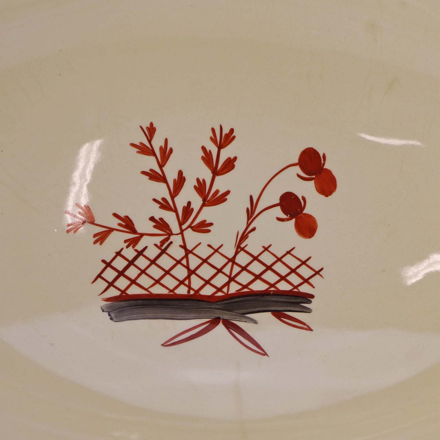 Fajancestel med dekoration af blomsterkurv på gullig baggrund med orangerød kant stribe.