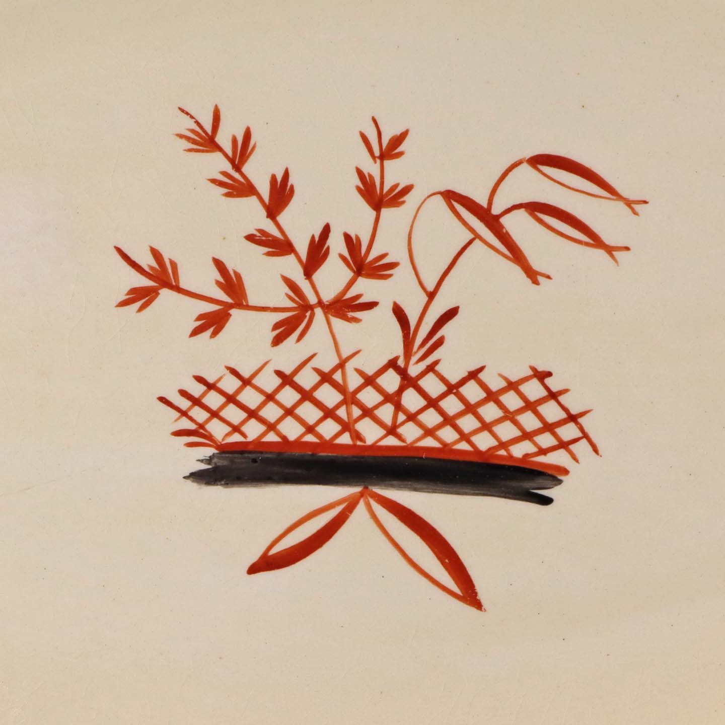 Fajancestel med dekoration af blomsterkurv på gullig baggrund med orangerød kant stribe.