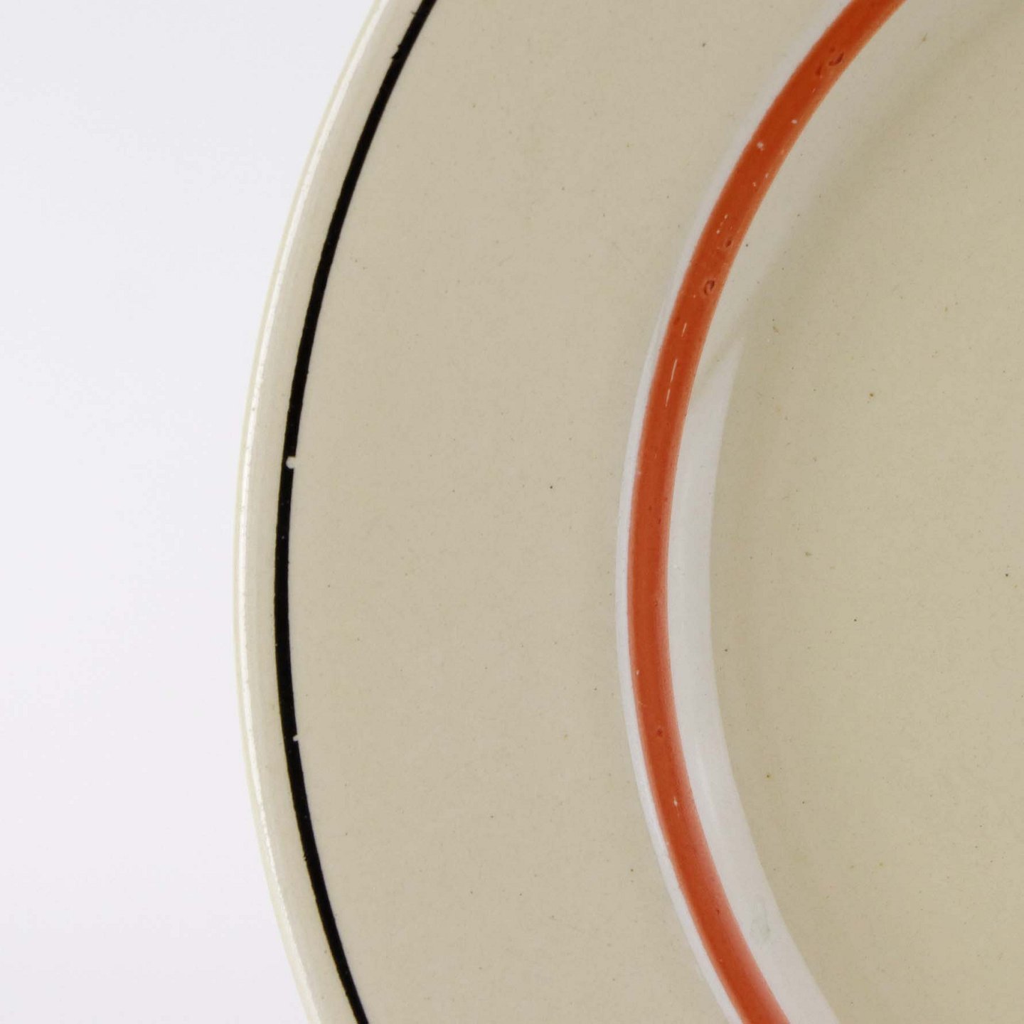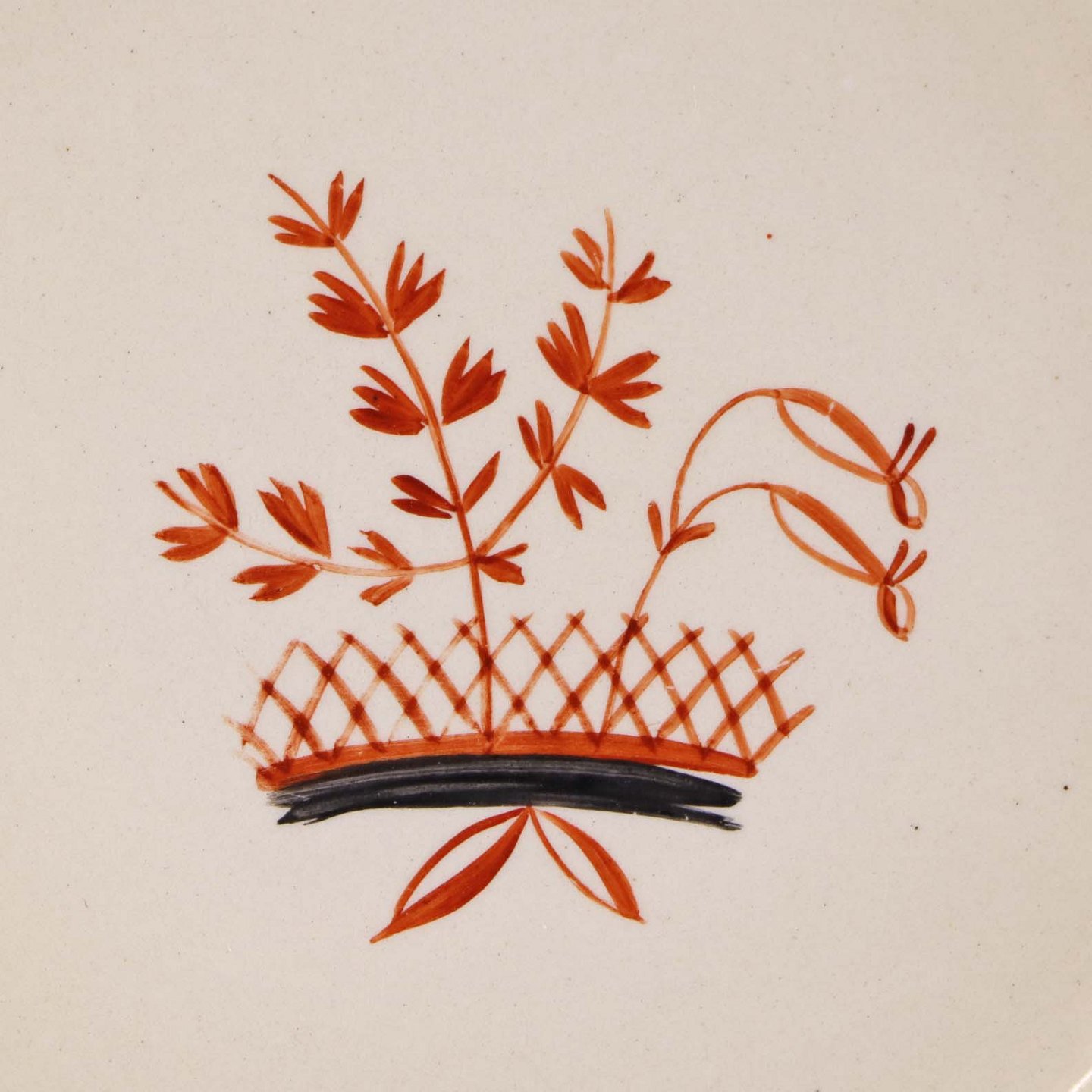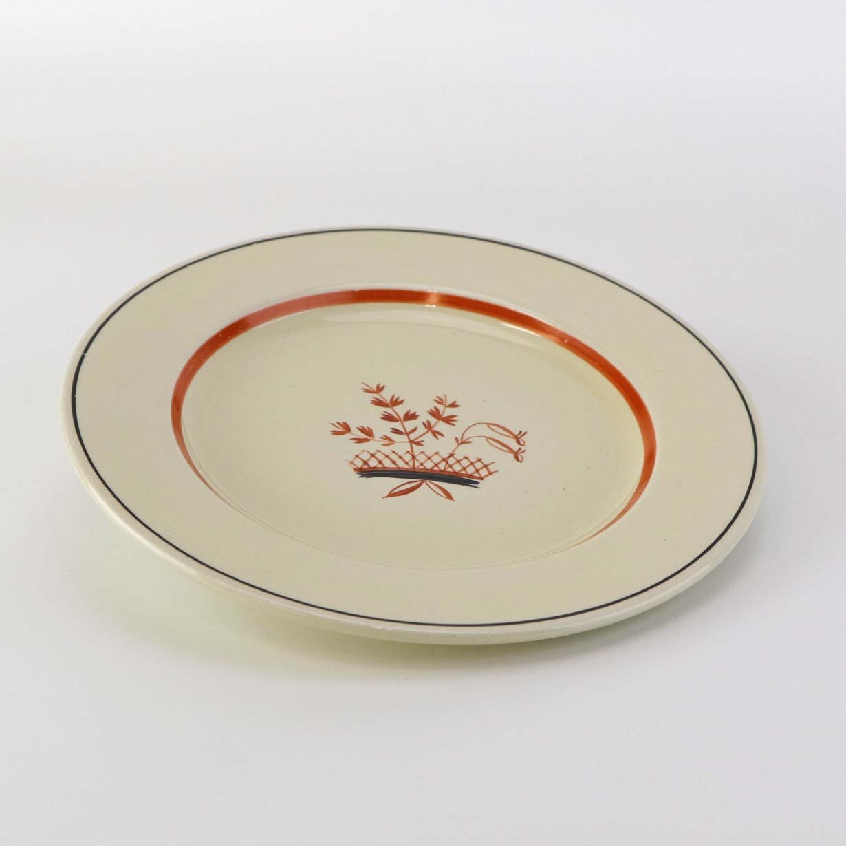 Fajancestel med dekoration af blomsterkurv på gullig baggrund med orangerød kant stribe.