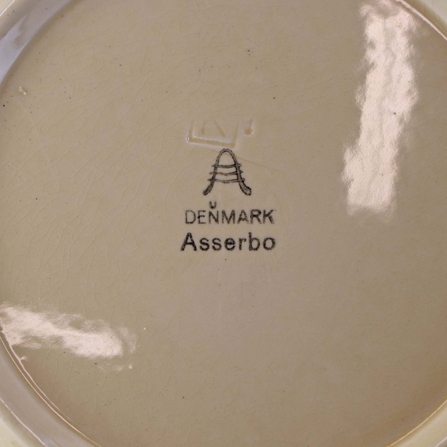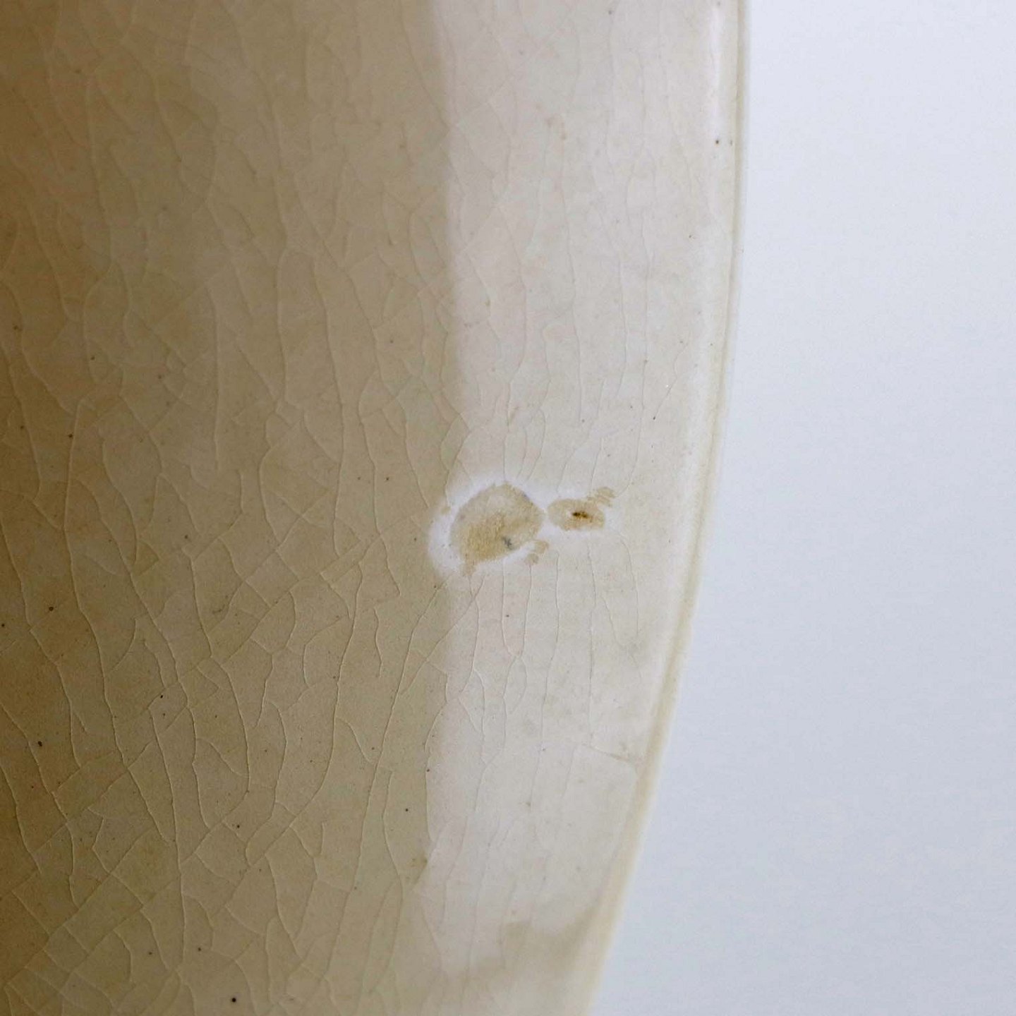 Fremstår med bruneringer under glasuren, krakkeleringer i glasuren og ujævnheder i glasurfarven på bagsiden.