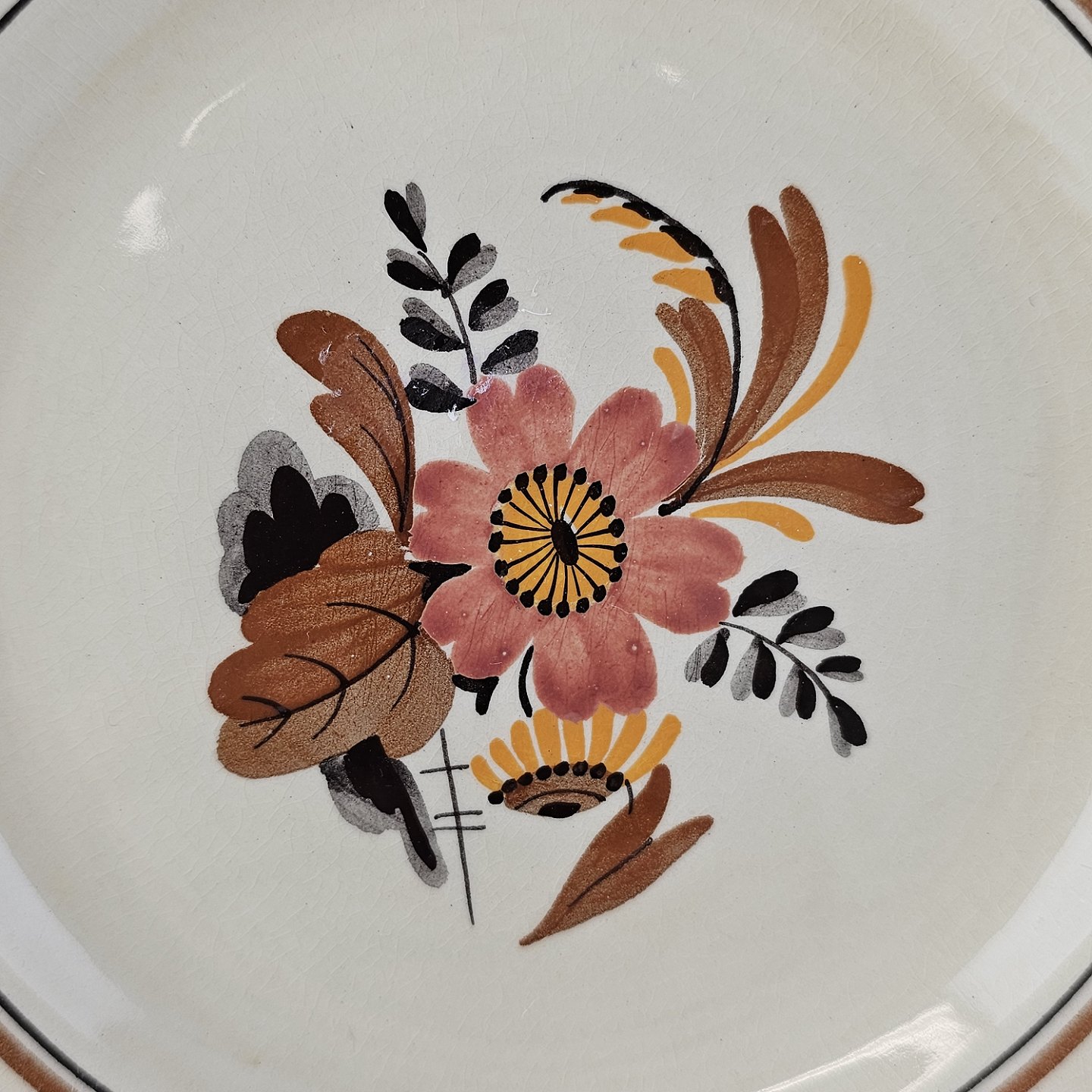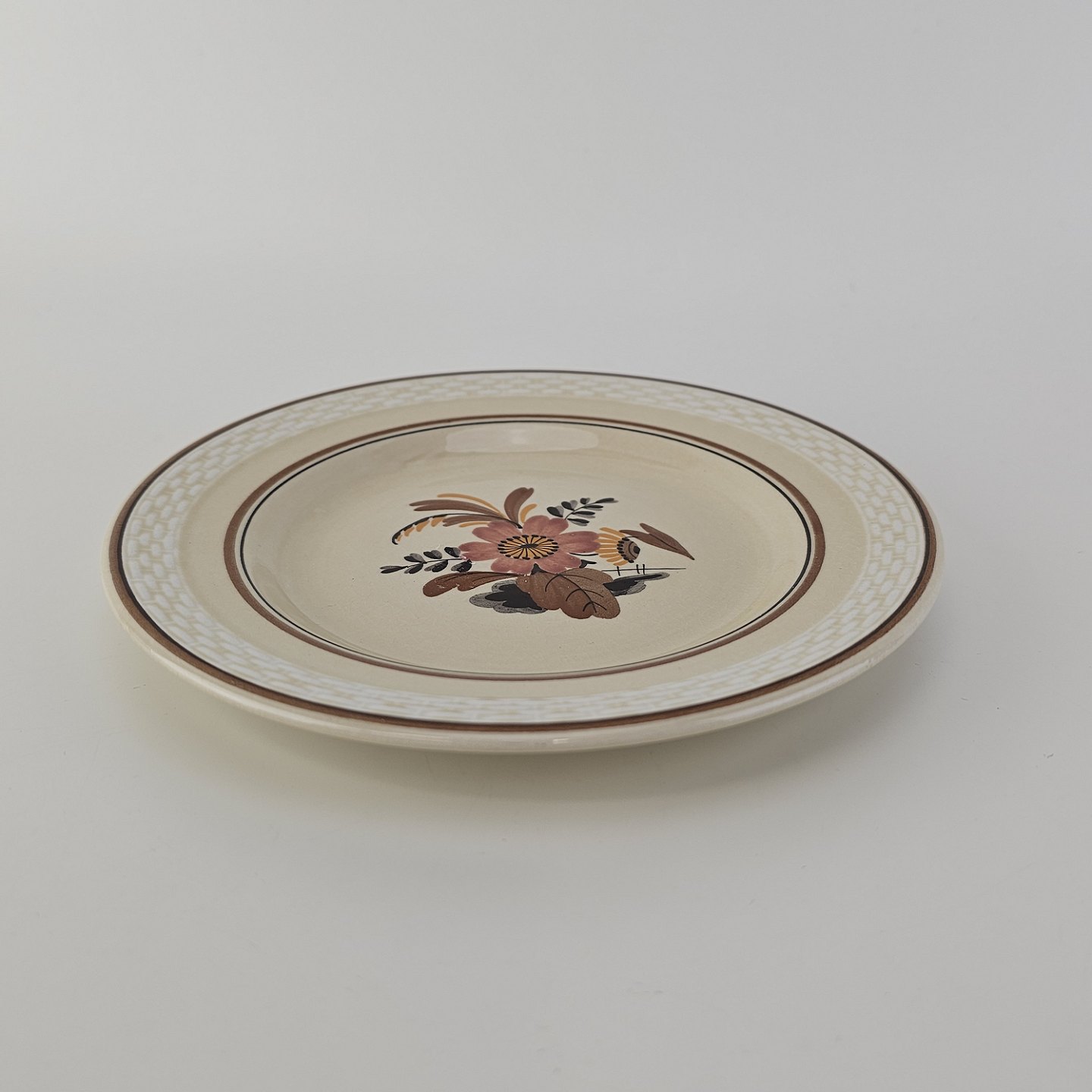 Knud er cremefarvet fajance dekoreret med flettet kant og brune og orange blomster. Stellet blev produceret i år 1934-1963.