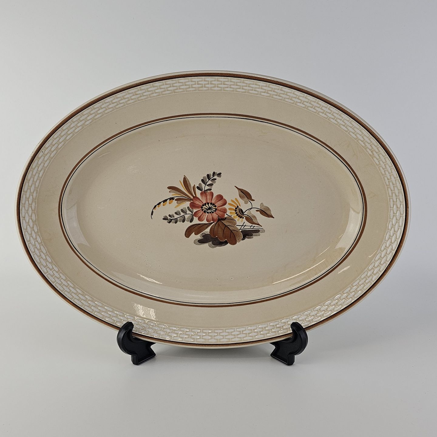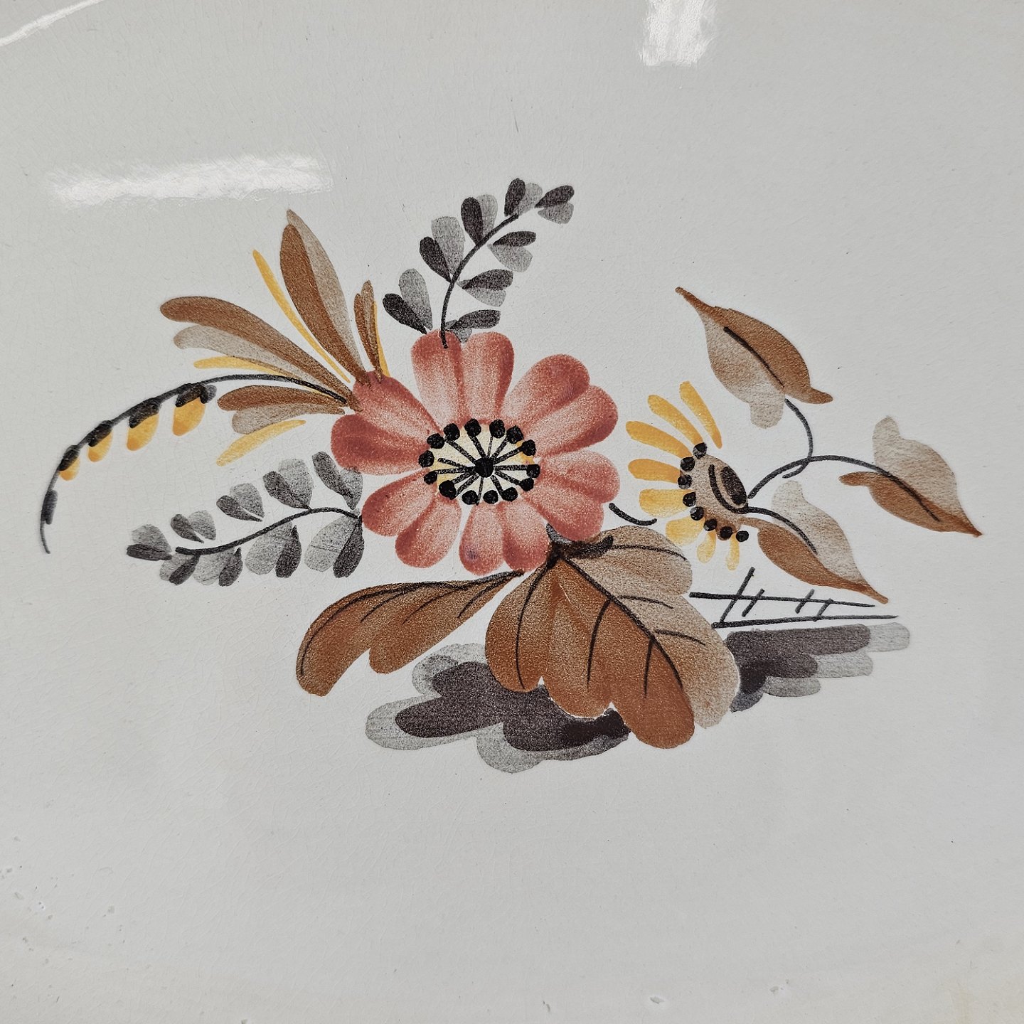 Knud er cremefarvet fajance dekoreret med flettet kant og brune og orange blomster. Stellet blev produceret i år 1934-1963.