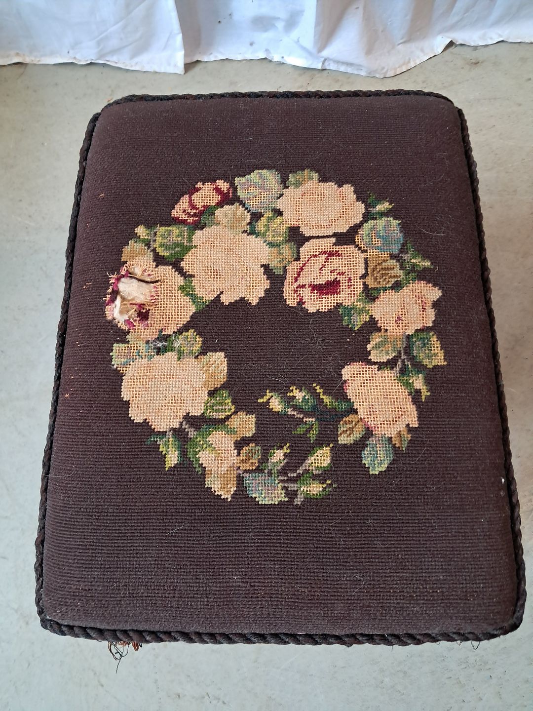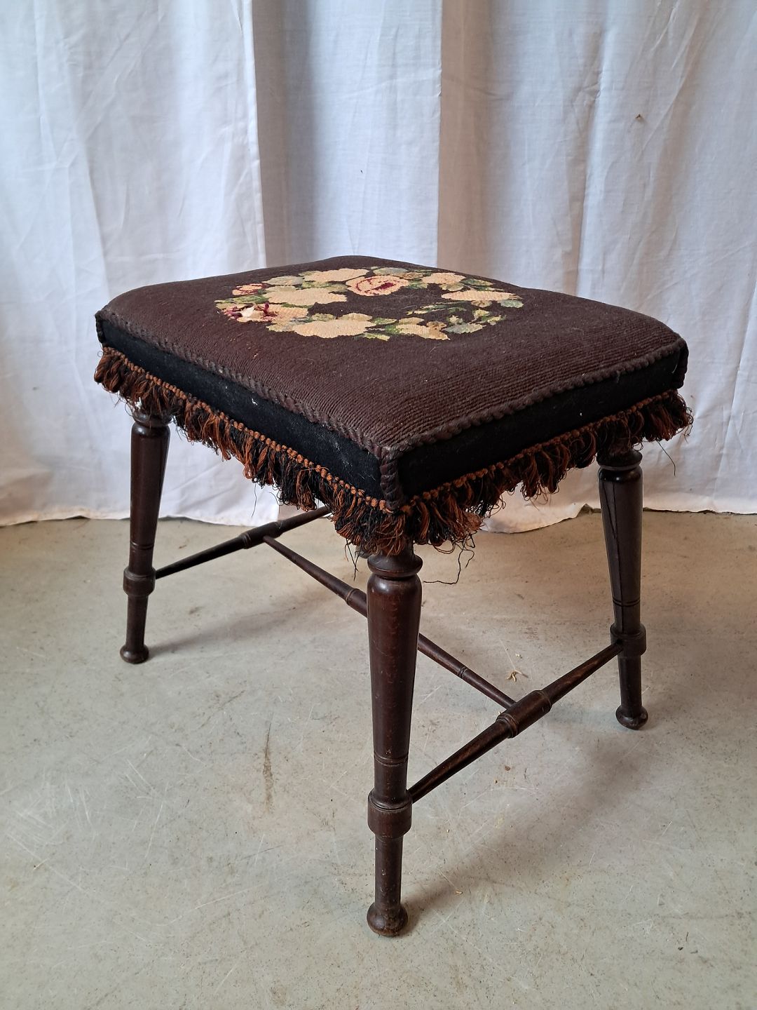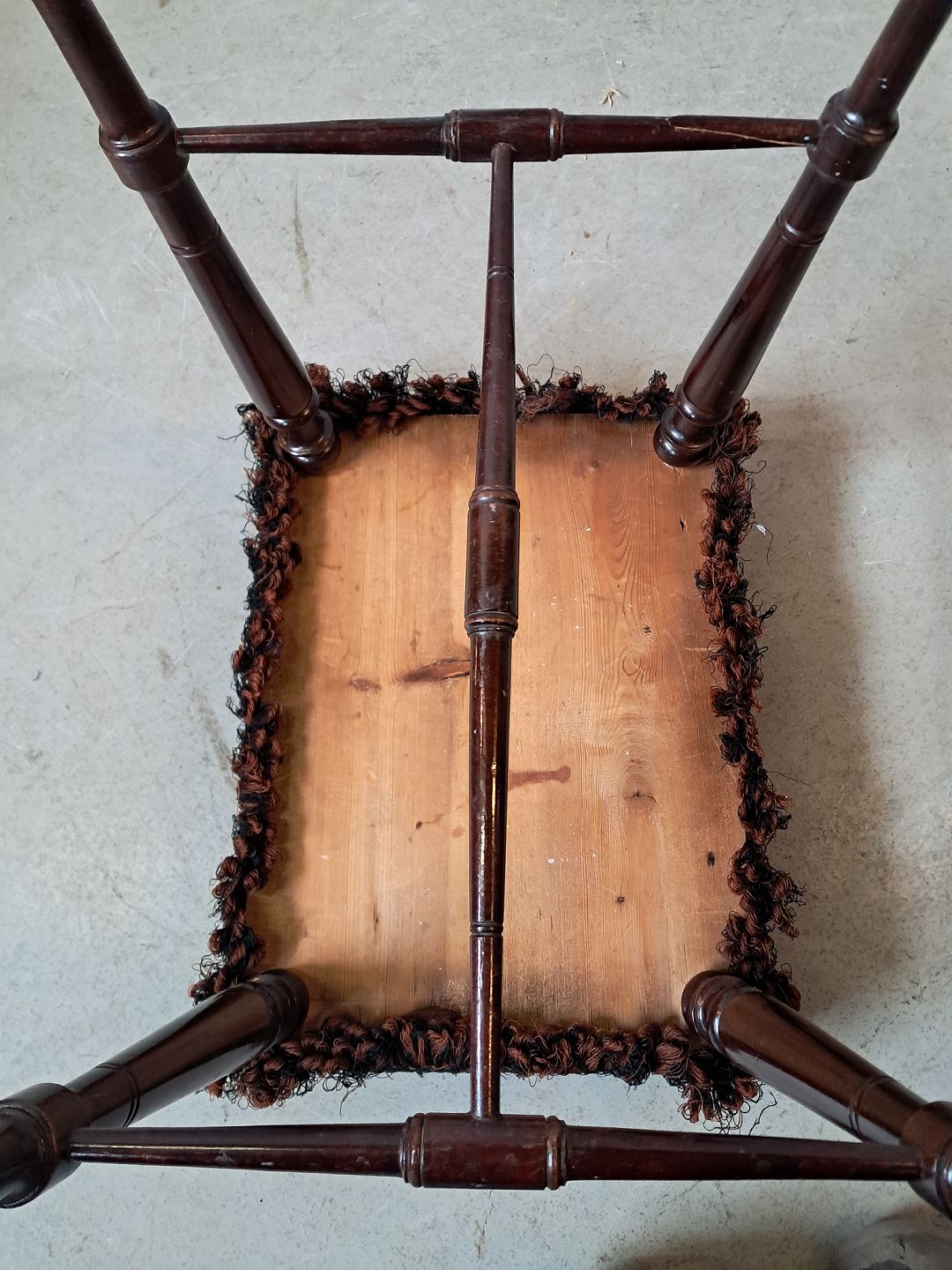 Skammel i mahogni, fra 1900erne.Den har defekt betræk.