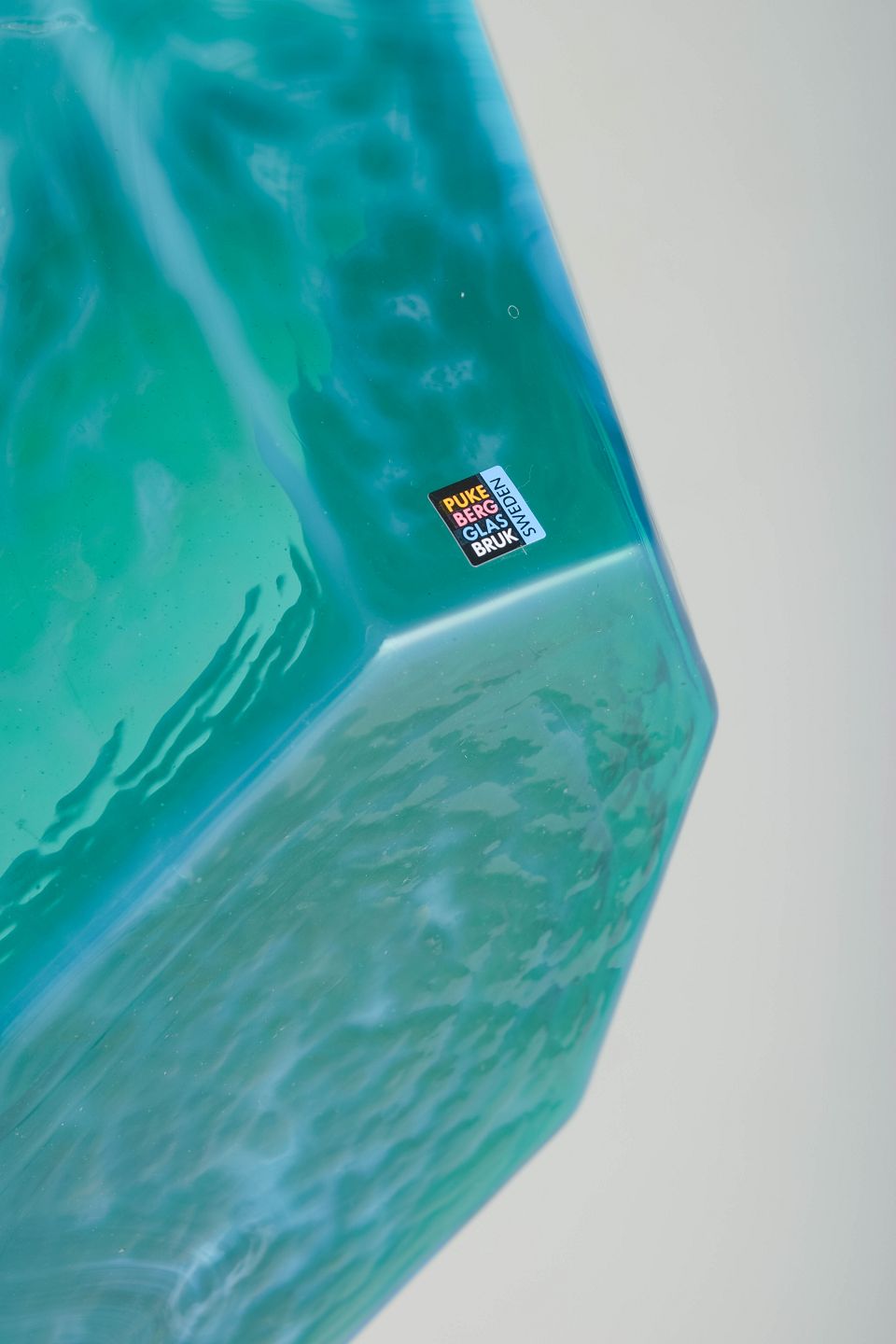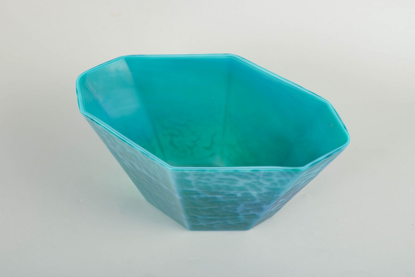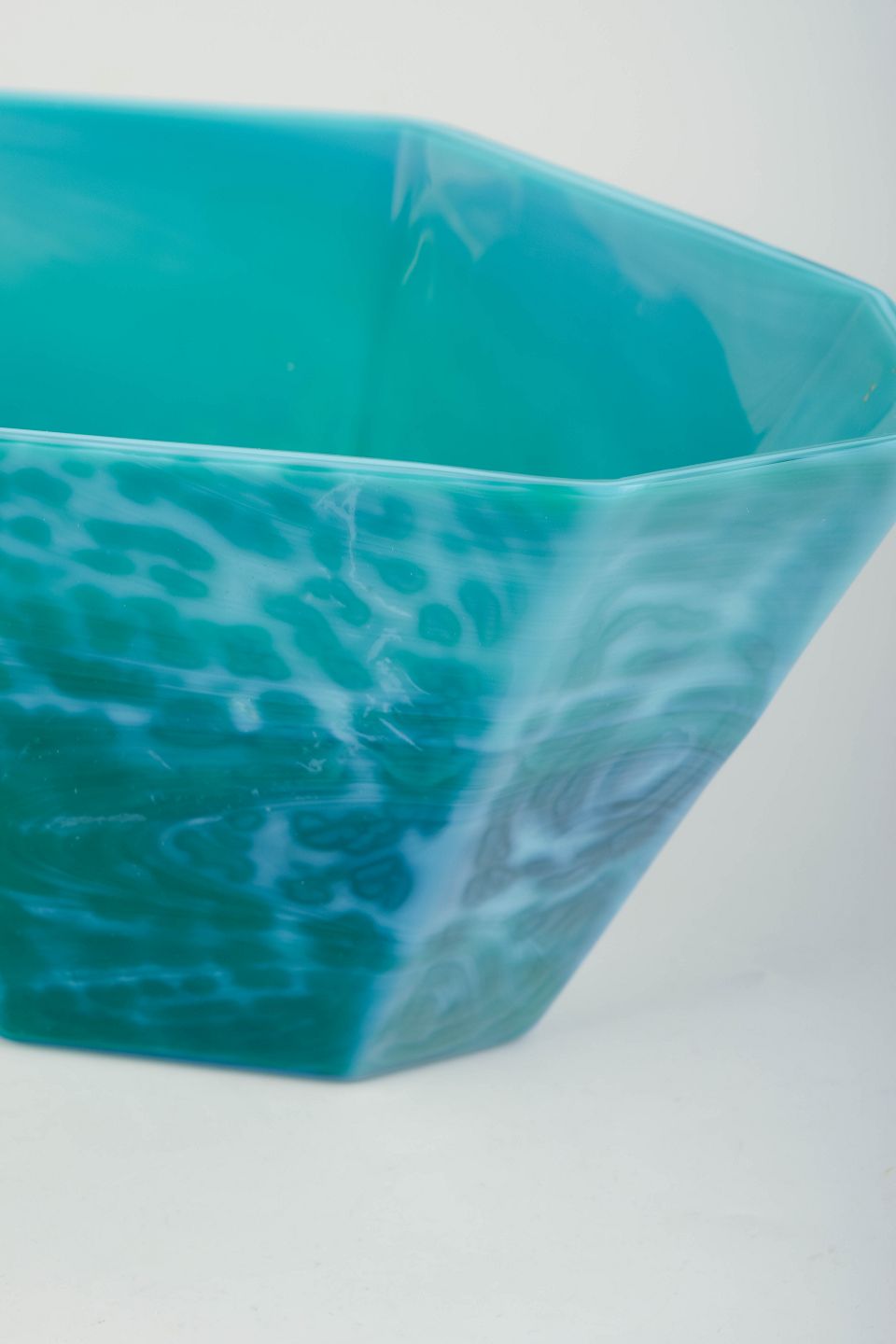 Pukeberg, stor ottekantet kunstglasskål.Stor ottekantet skål i kraftigt kunstglas med levende turkisblå nuancer og marmoreret struktur. Fremstillet hos Pukeberg Glasbruk og bevaret med original mærkat.