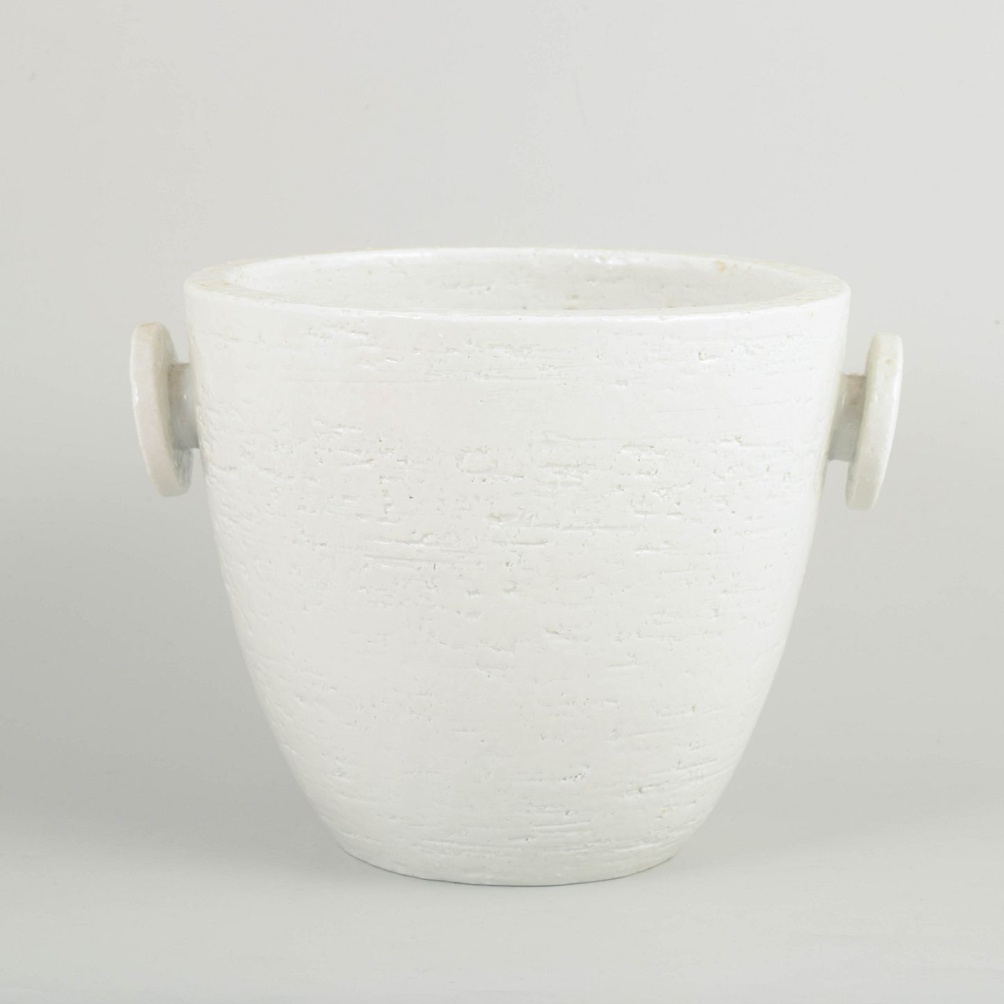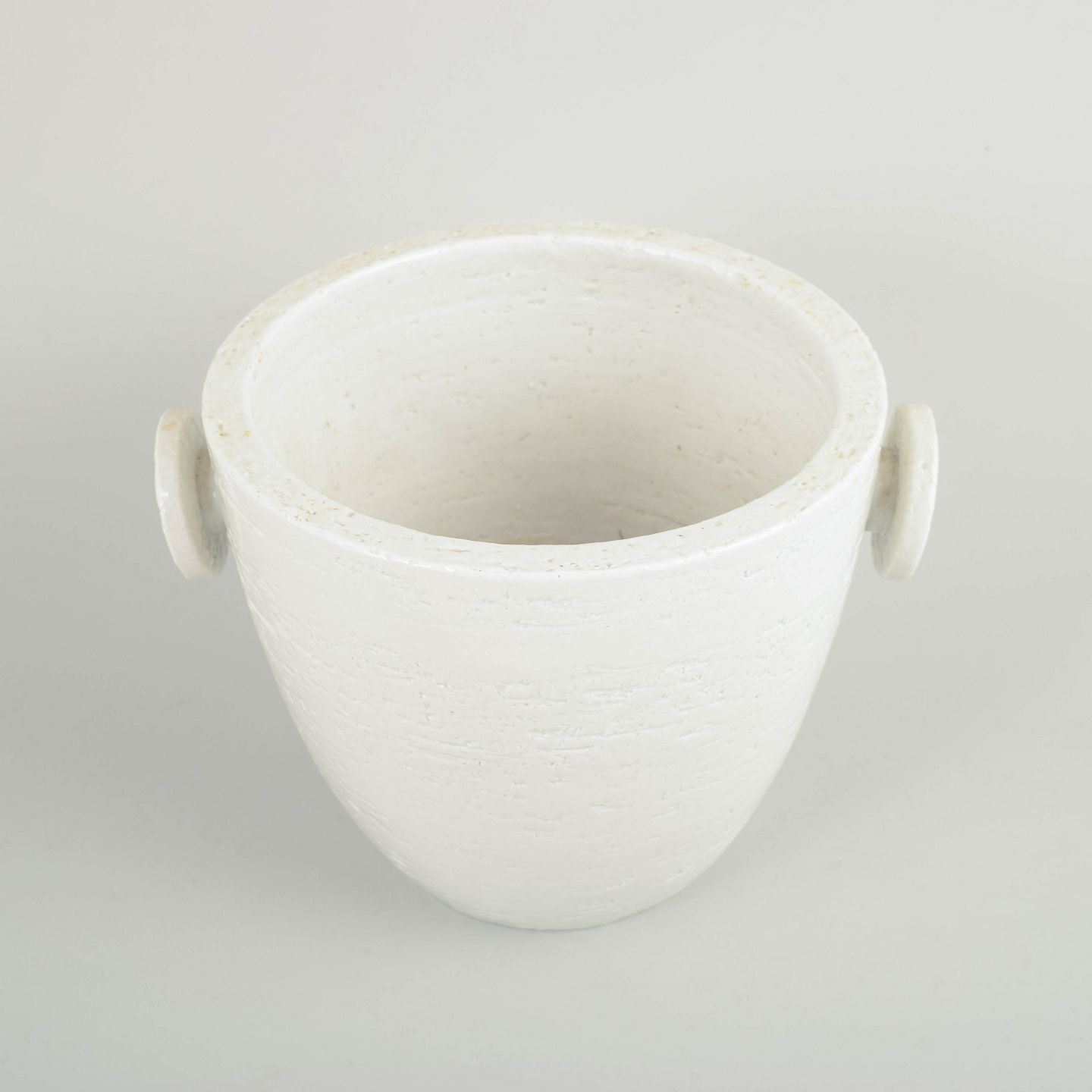 Gunnar Nylund for Rörstrand, stor champagnekøler.Stor cylindrisk champagnekøler/isspand i hvidglaseret stentøj med let konisk korpus og to markante sidehanke. Overfladen fremstår med diskret struktur og mat hvid glasur. Stemplet i bunden.