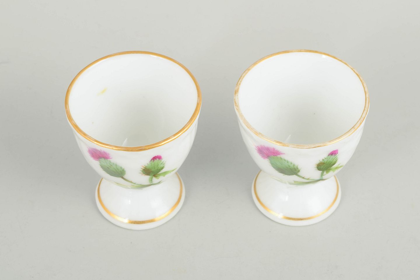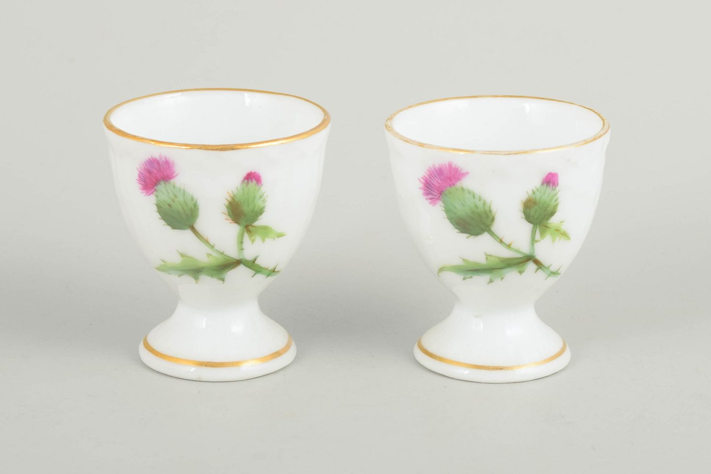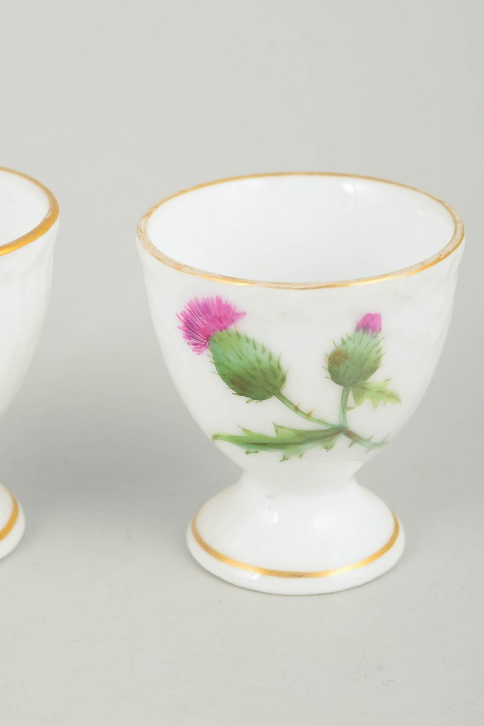Royal Copenhagen "Tidsel", 2 æggebægre.To æggebægre i håndmalet porcelæn med motiv fra Tidsel serien. Dekoreret med tidselblomst i grønne og rosa nuancer samt forgyldt kant. Første sortering.