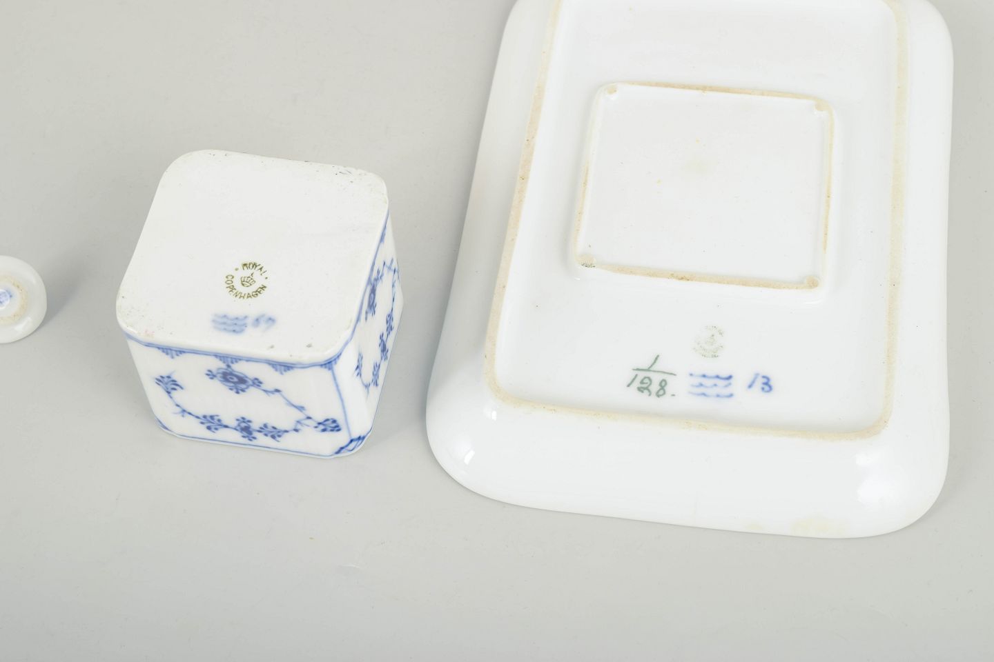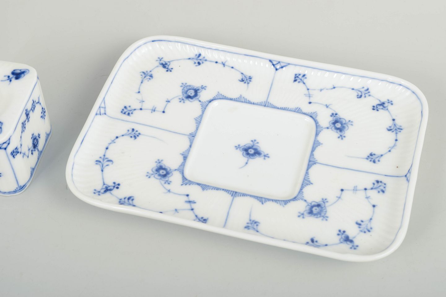 Royal Copenhagen blev grundlagt i 1775 og er en af Europas ældste porcelænsfabrikker. Musselmalet Riflet er fabrikkens mest ikoniske stel, introduceret i 1700-tallet og kendetegnet ved den riflede form og den håndmalede blå dekoration. Omkring år 1900 fremstillede fabrikken også skrivebordsgenstande som blækhuse i samme klassiske dekoration, udført med stor præcision og håndværksmæssig kvalitet.