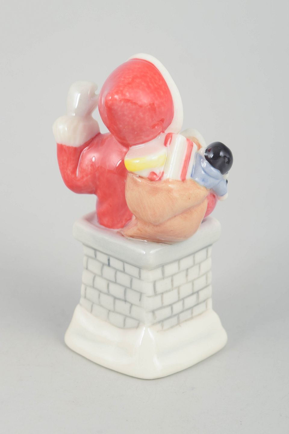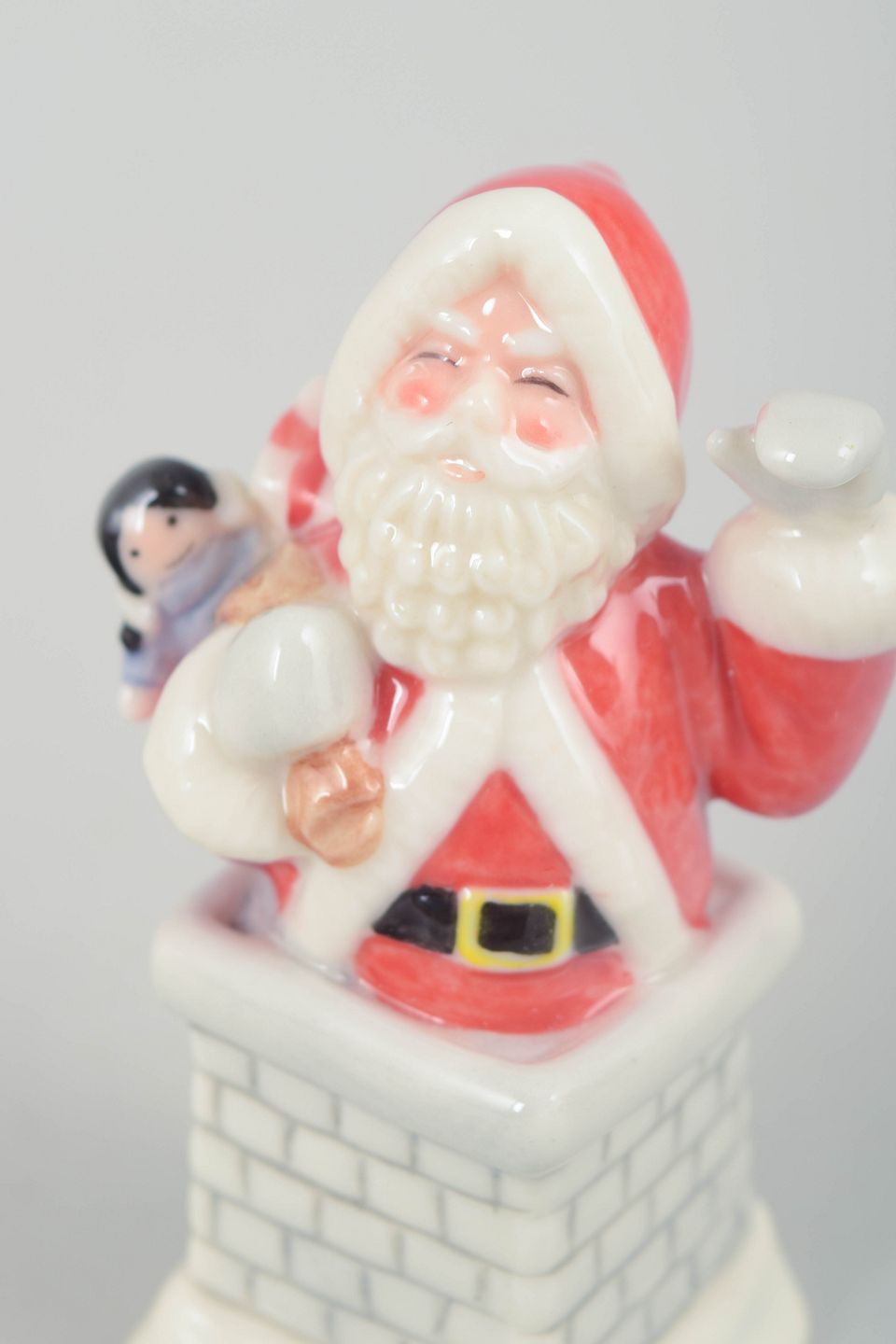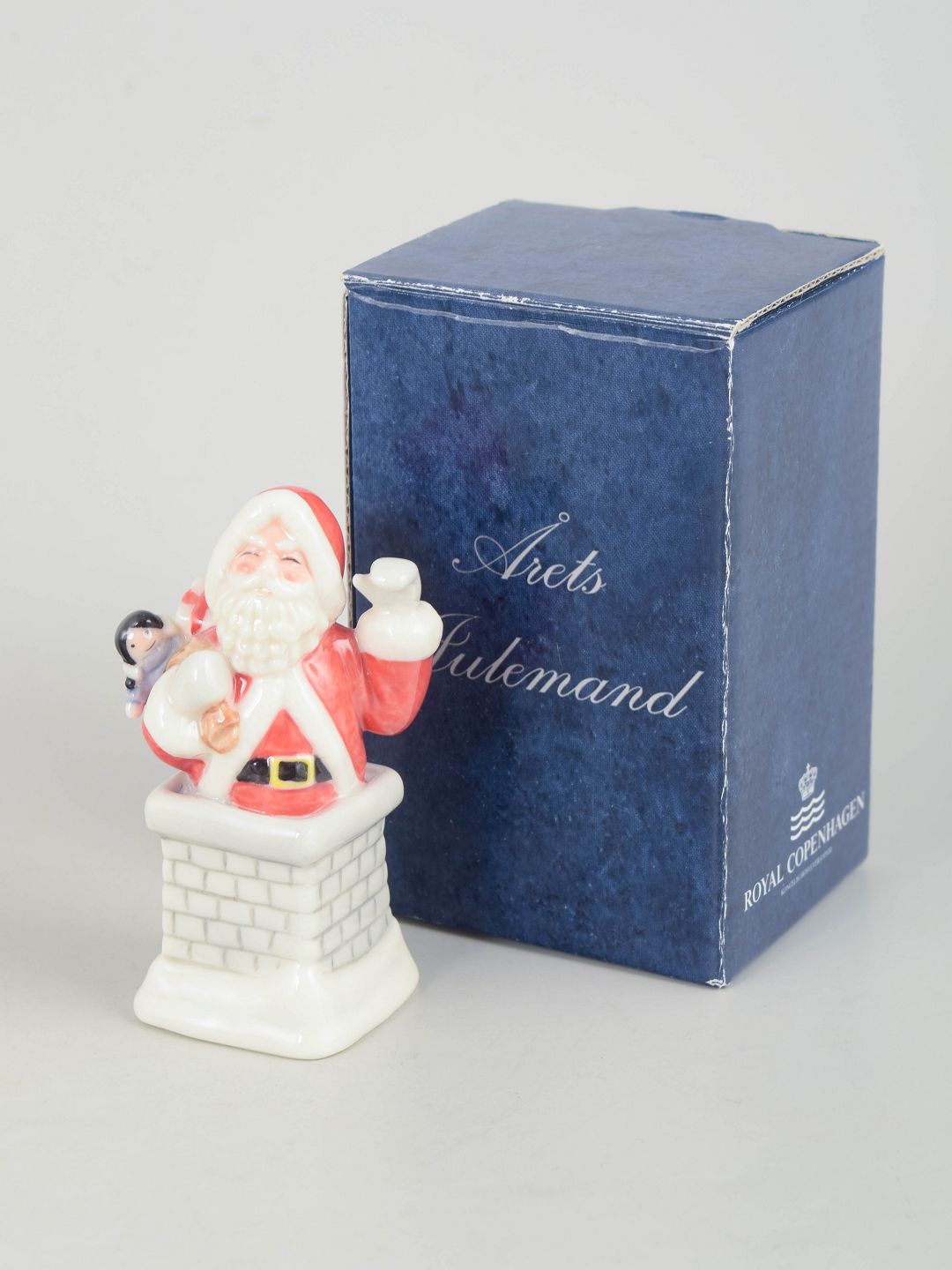Royal Copenhagen, julemand figur.Dekorativ julemand figur i håndmalet porcelæn fra 2004, udført stående i skorsten med lille dukke i hånden. Figuren er detaljeret modelleret med klassisk rød dragt, hvid pelskant og sort bælte. Leveres med original æske. Første sortering.