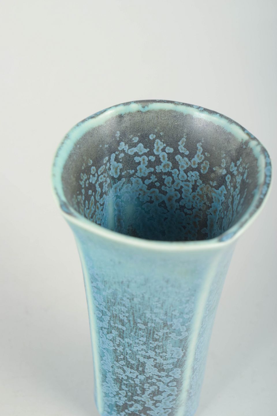 Berndt Friberg for Gustavsberg, "Selecta" vase.Elegant, høj vase i drejet stentøj med smukt løbende krystalglasur i lyse blå og turkise nuancer. Formen er slank med let udadbøjet rand. Stemplet Gustavsberg Selecta samt signeret BF under bunden.