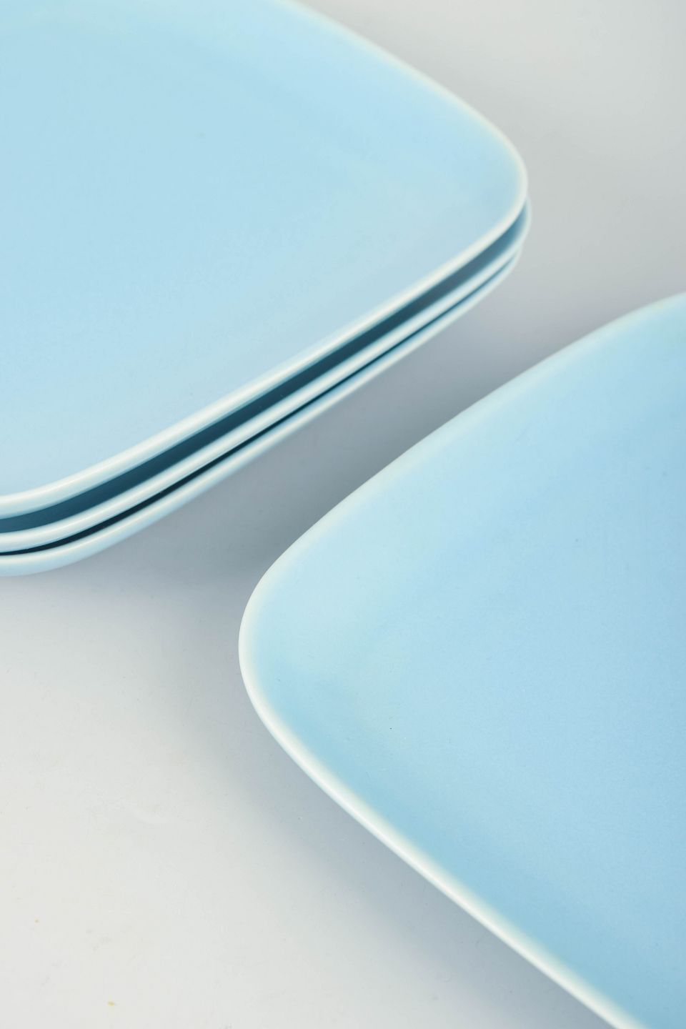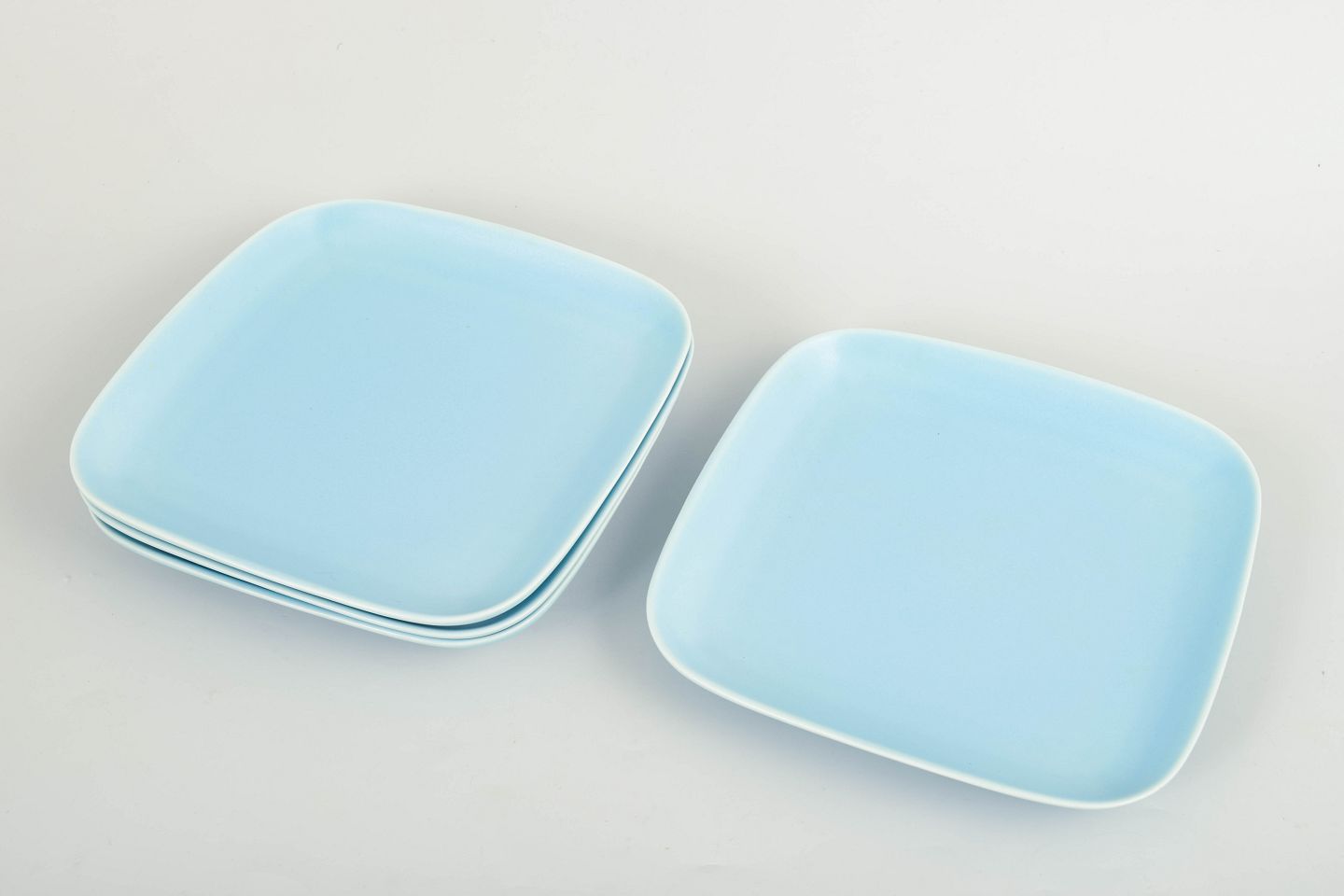 Höganäs Keramik, sæt af fire middagstallerkener i turkis glasur.Kvadratiske middagstallerkener i stentøj med afrundede hjørner og ensartet turkis glasur.