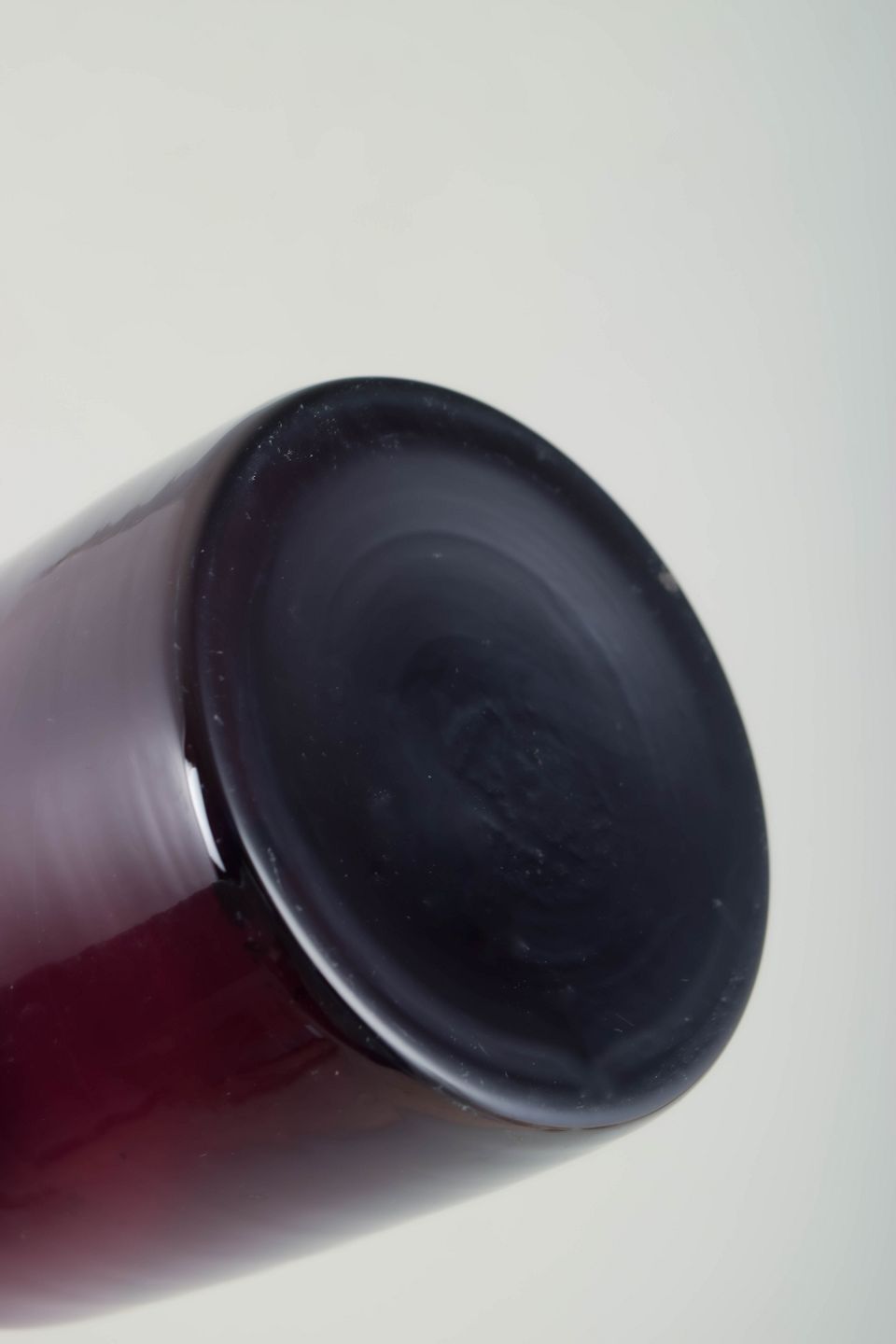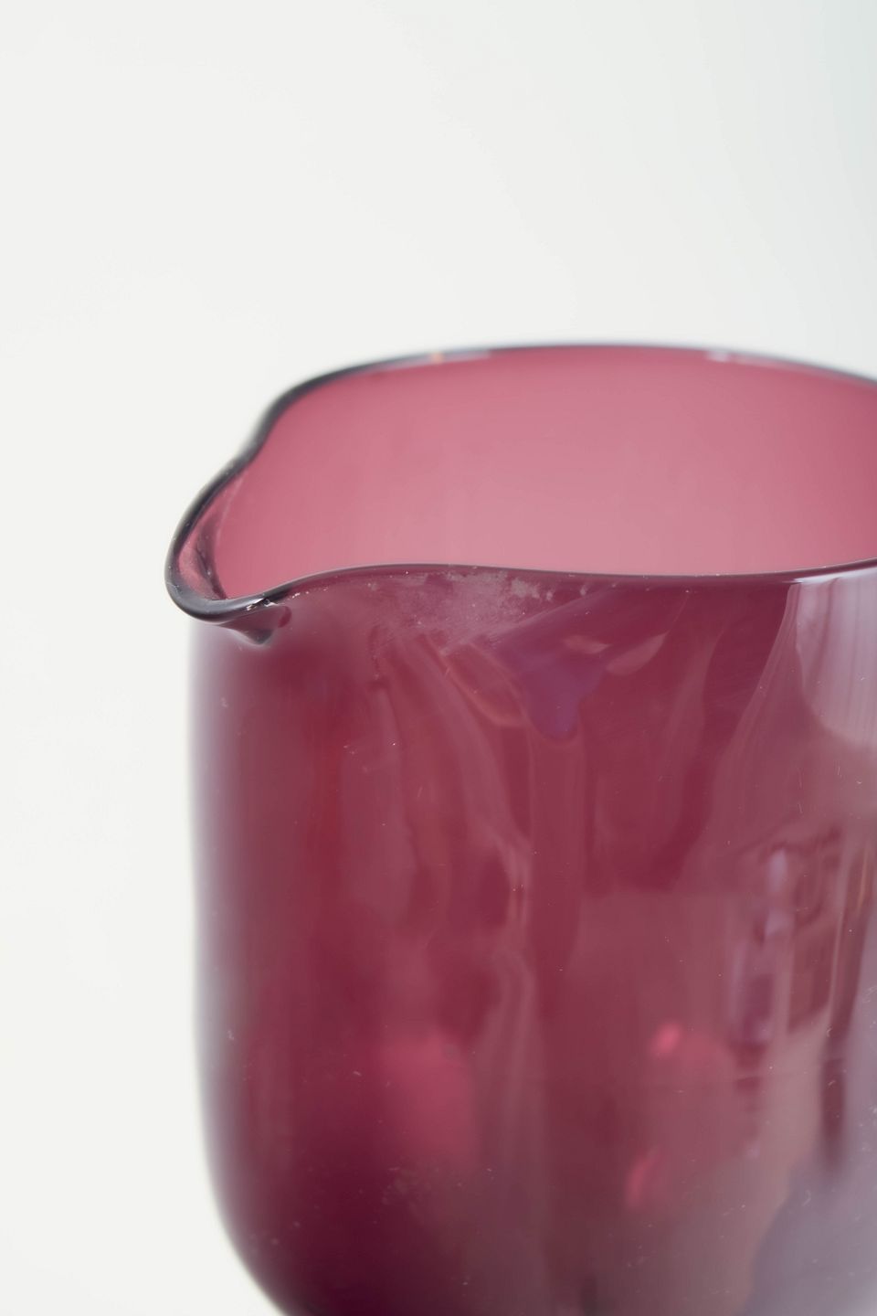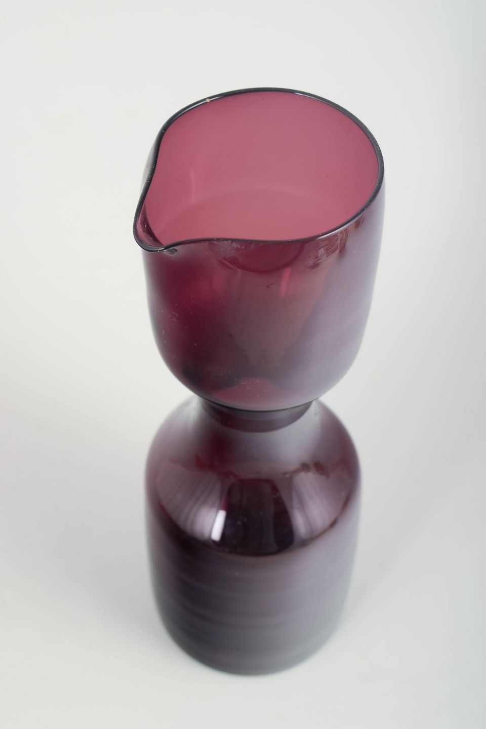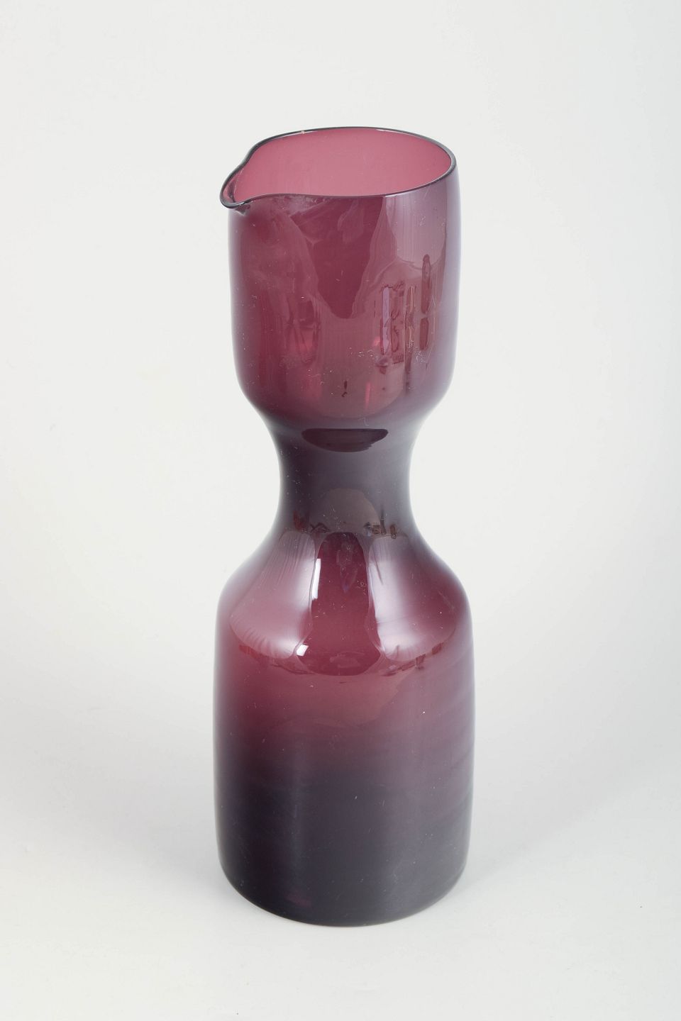 Kjell Blomberg for Gullaskruf, kande.Slank, timeglasformet kande i mundblæst glas med let indsvajet hals og diskret hældetud. Udført i transparent purpurfarvet tone med mørkere bundparti, karakteristisk for svensk glasdesign fra 1960’erne.