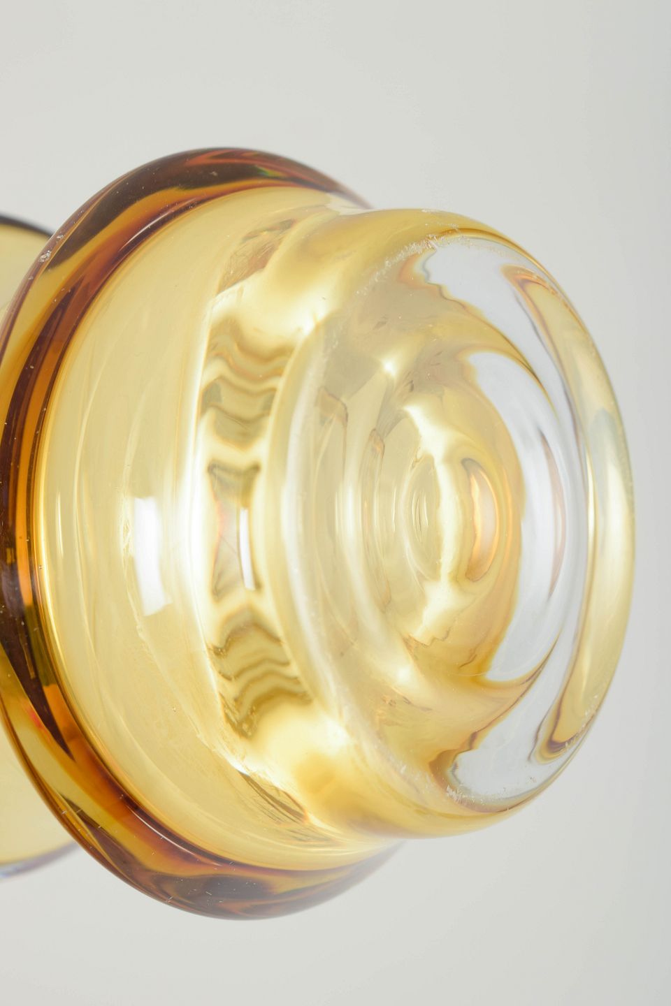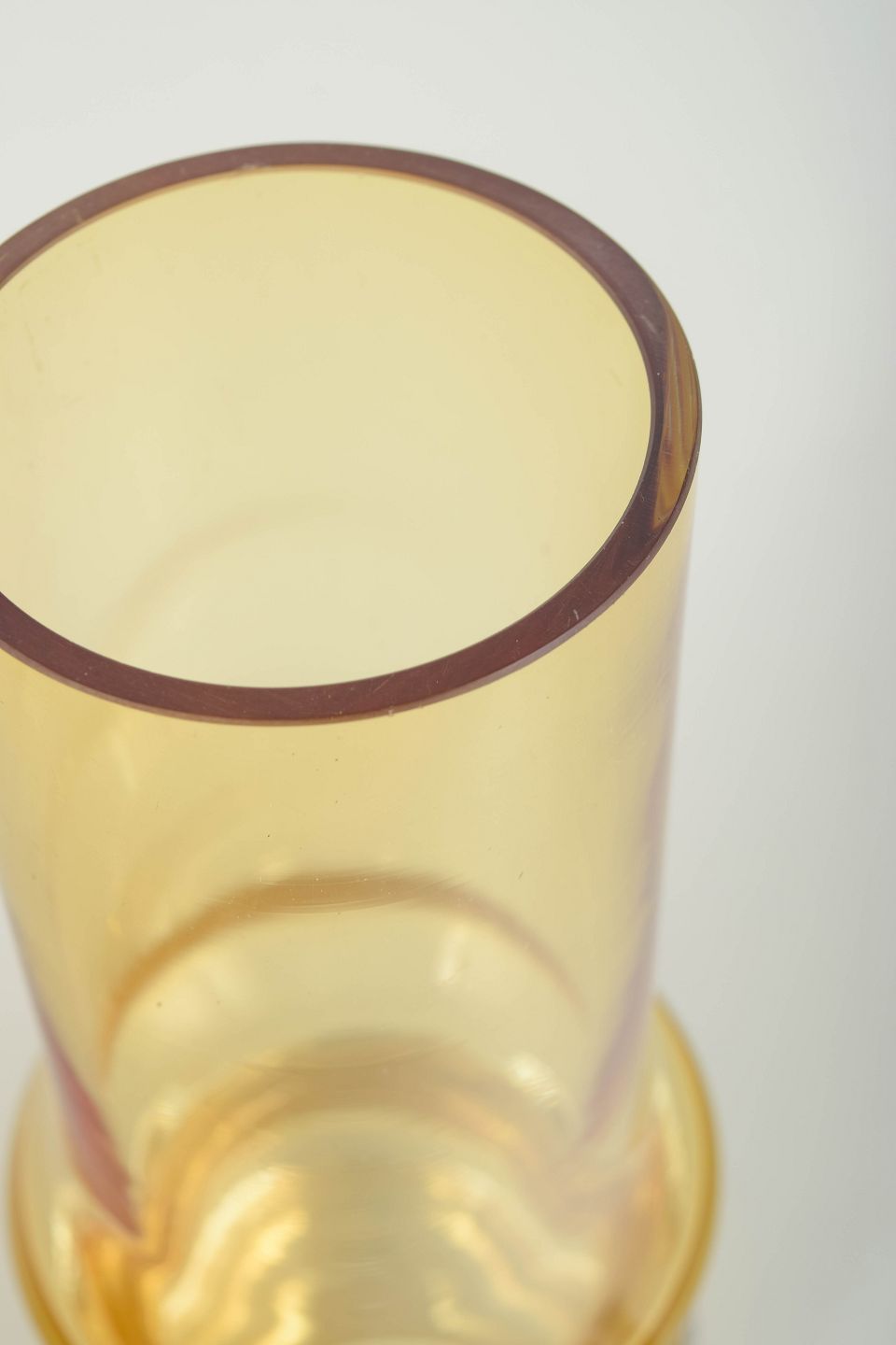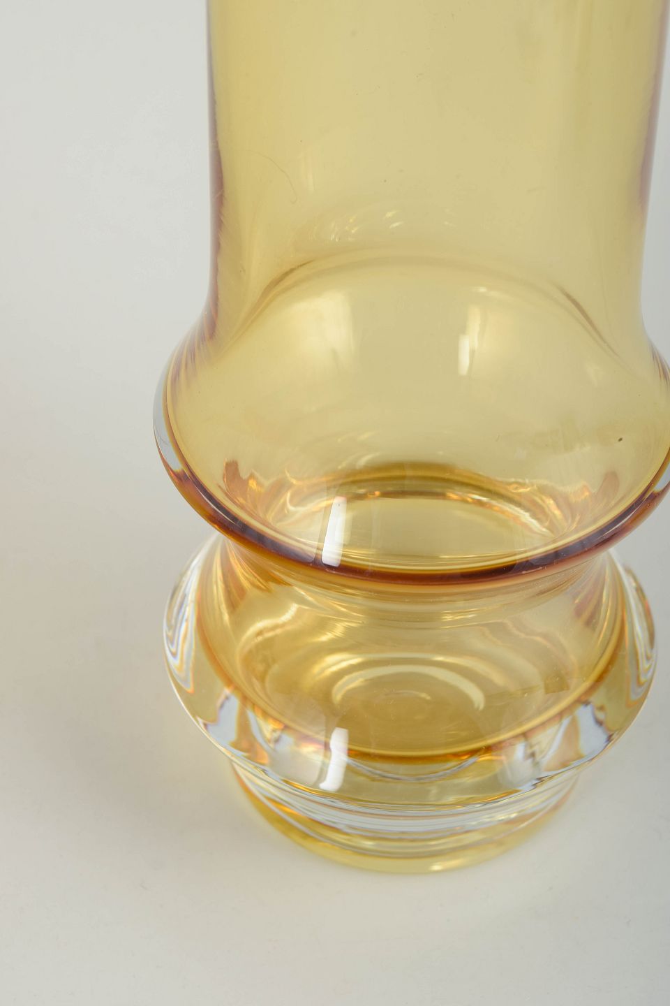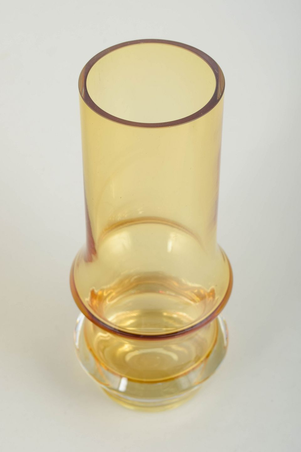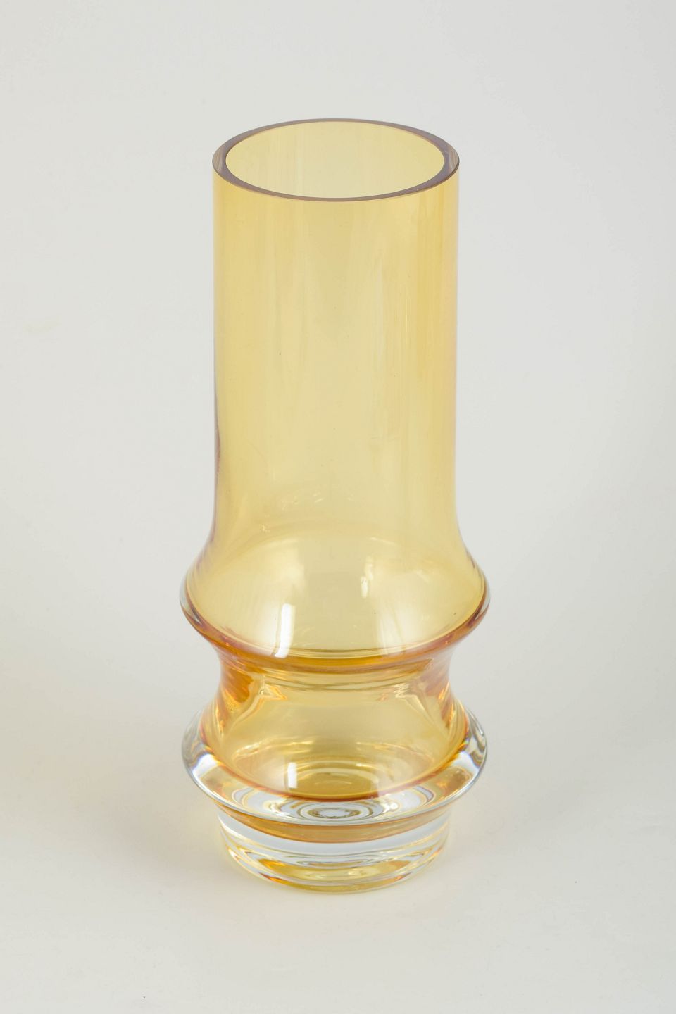 Tamara Aladin for Riihimäen Lasi, kunstglasvase.Høj cylindrisk vase i ravfarvet kunstglas med let udadbøjet munding og markant profileret fod. Udført i mundblæst glas med varm gylden tone og klar, massiv sokkel. Usigneret.