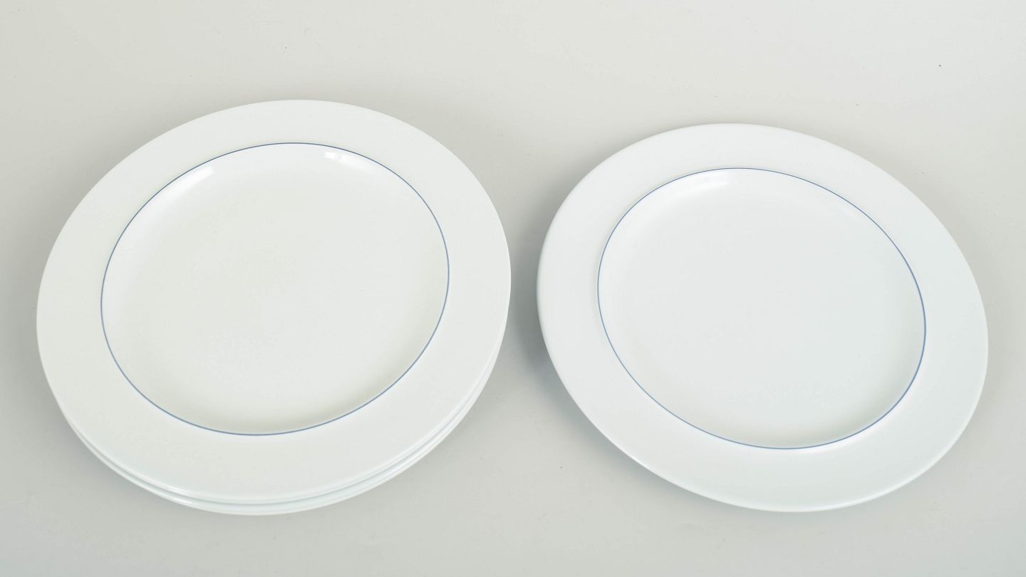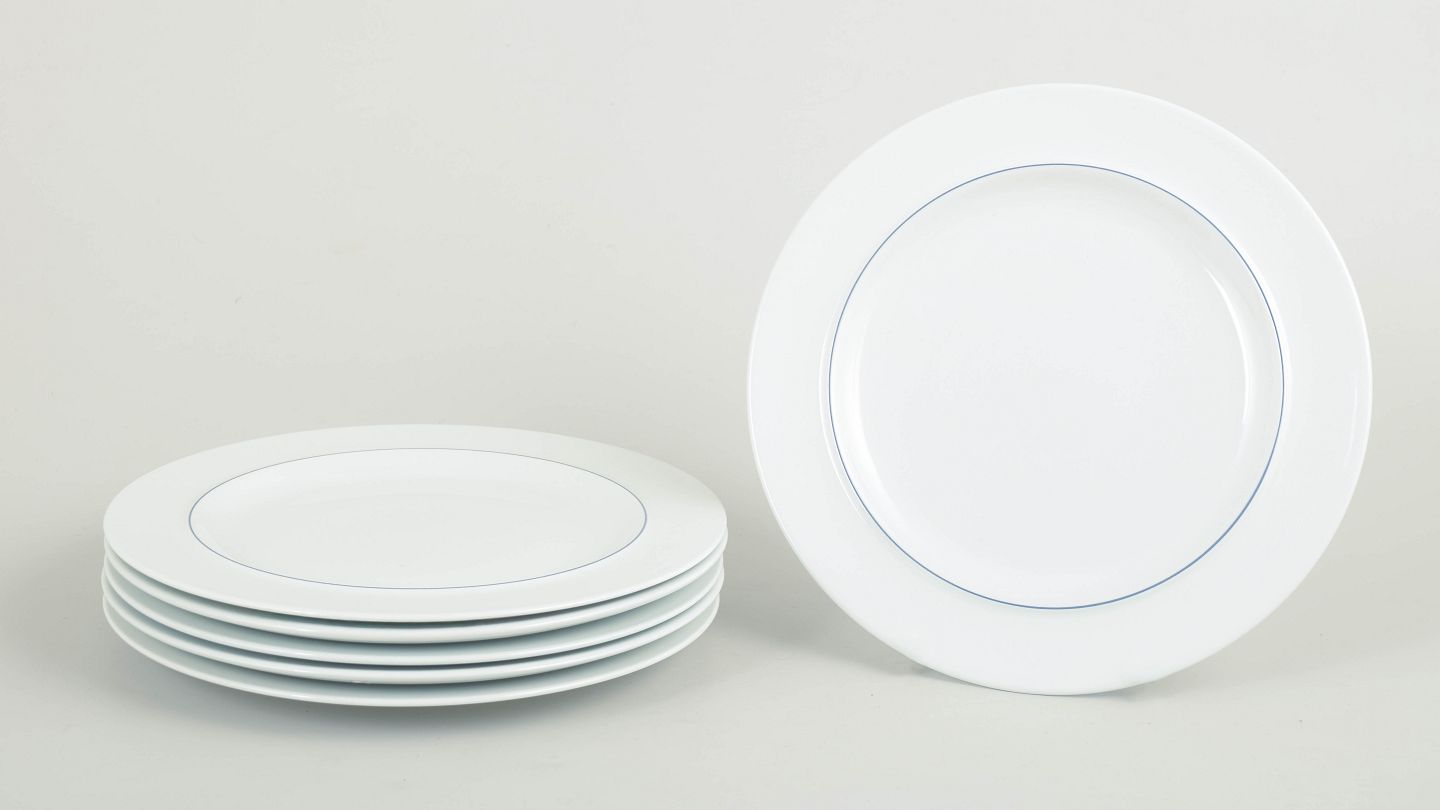 Grethe Meyer for Royal Copenhagen, sæt af seks frokosttallerkener, Blåkant.Seks runde tallerkener model 621 i hvid fajance med enkel blå rand langs fanen. En del af Blåkant-serien med sit stringente og funktionelle formsprog. Fremstillet 1992–1999. 1. sortering.