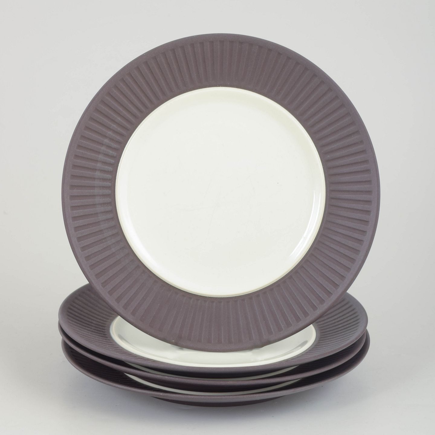 Jens Harald Quistgaard for Dansk Designs, sæt på 4 tallerkener.Sæt bestående af fire tallerkener i stentøj med hvid glasur og rillet fane samt lys glasur i spejlet.