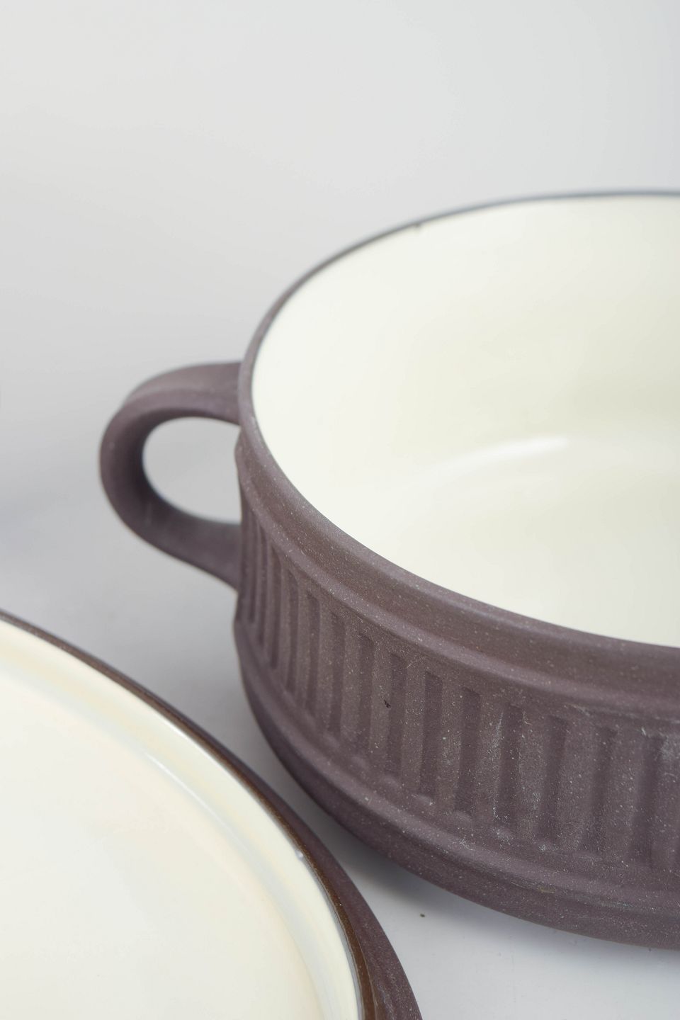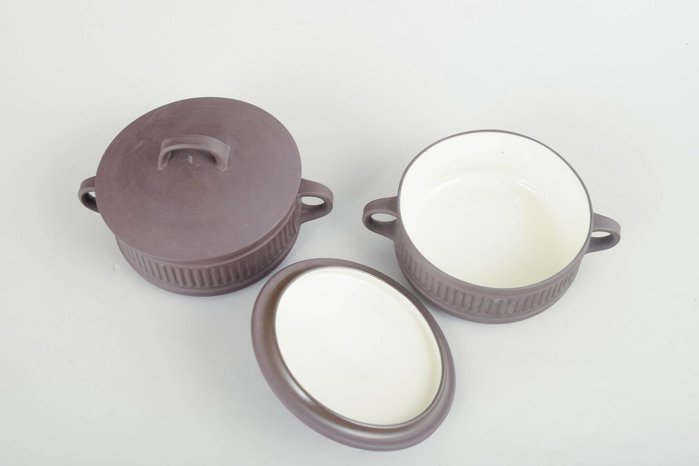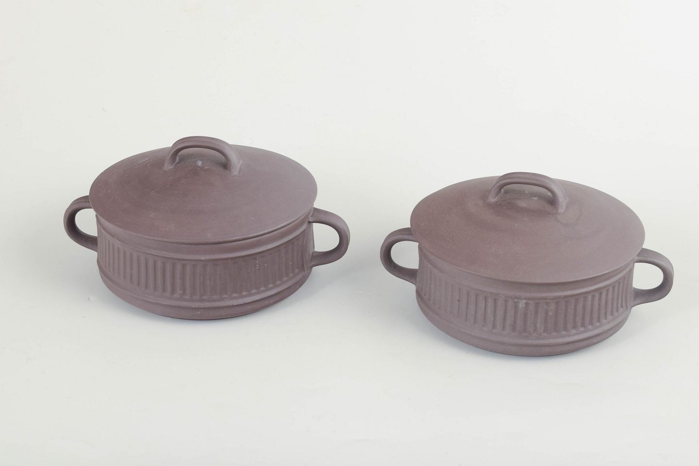 Jens Harald Quistgaard for Dansk Designs, sæt på 2 bouillonkopper med tilhørende låg.To bouillonkopper i stentøj med låg og sidehanke, udført i hvid glasur med rillet dekoration.