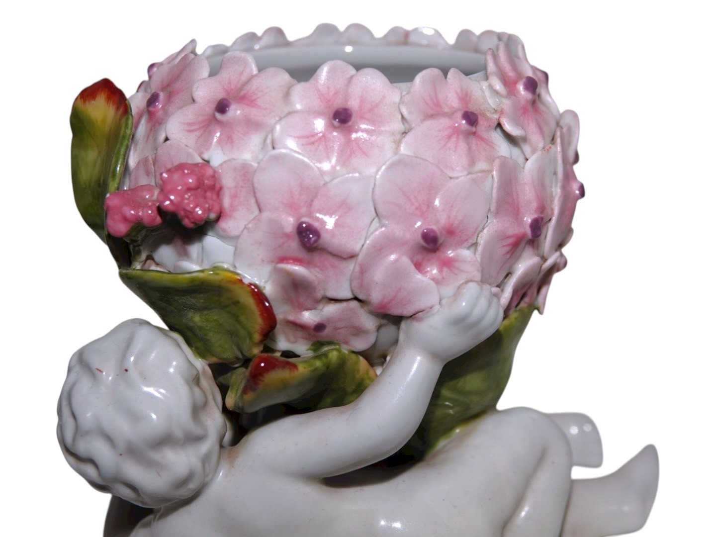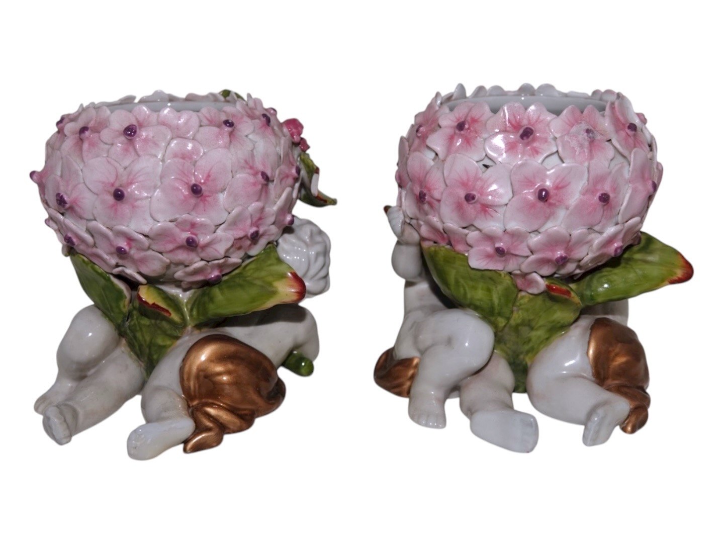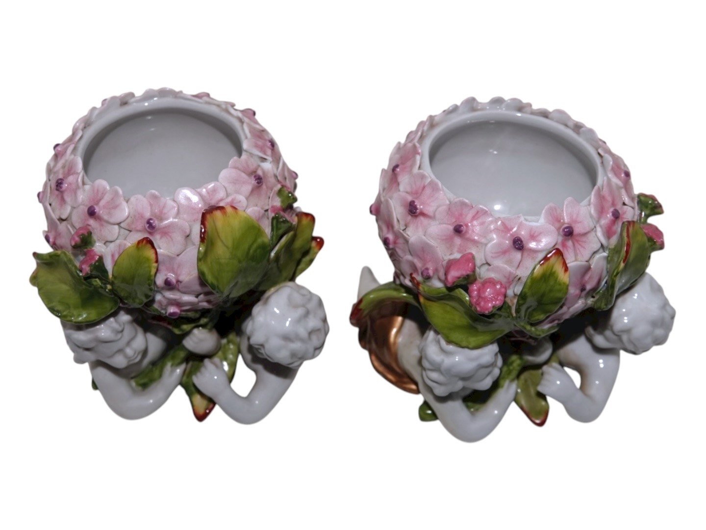 Tysk porcelænPar små urtepotter med hortensia og engle fra ca. 1900