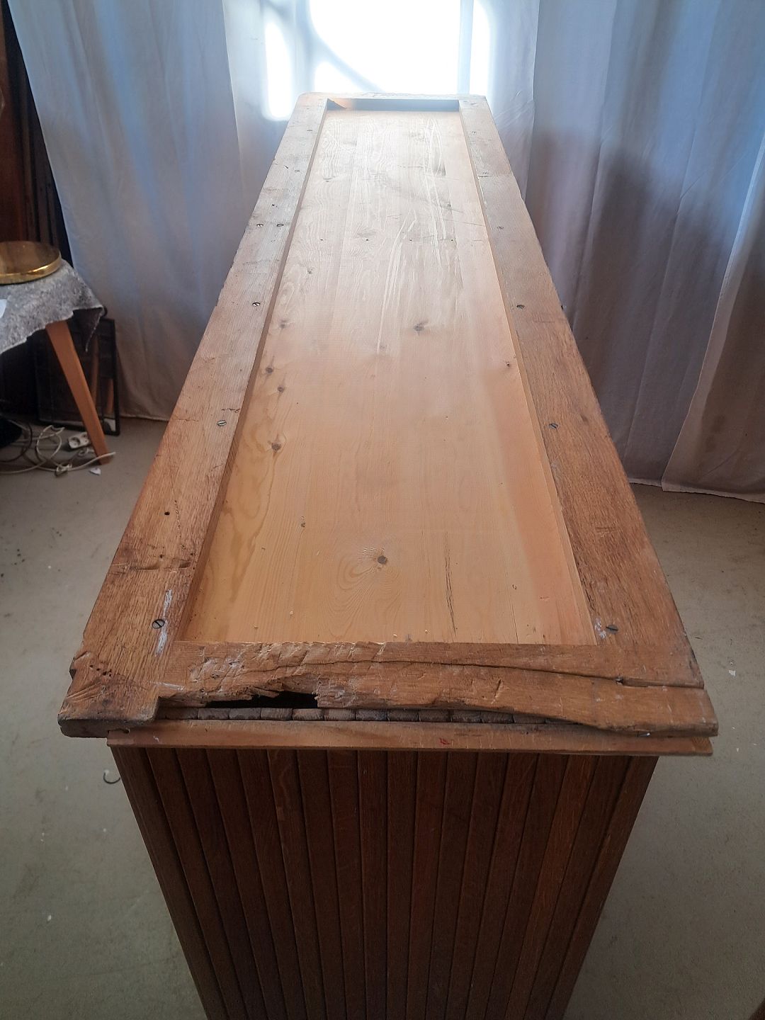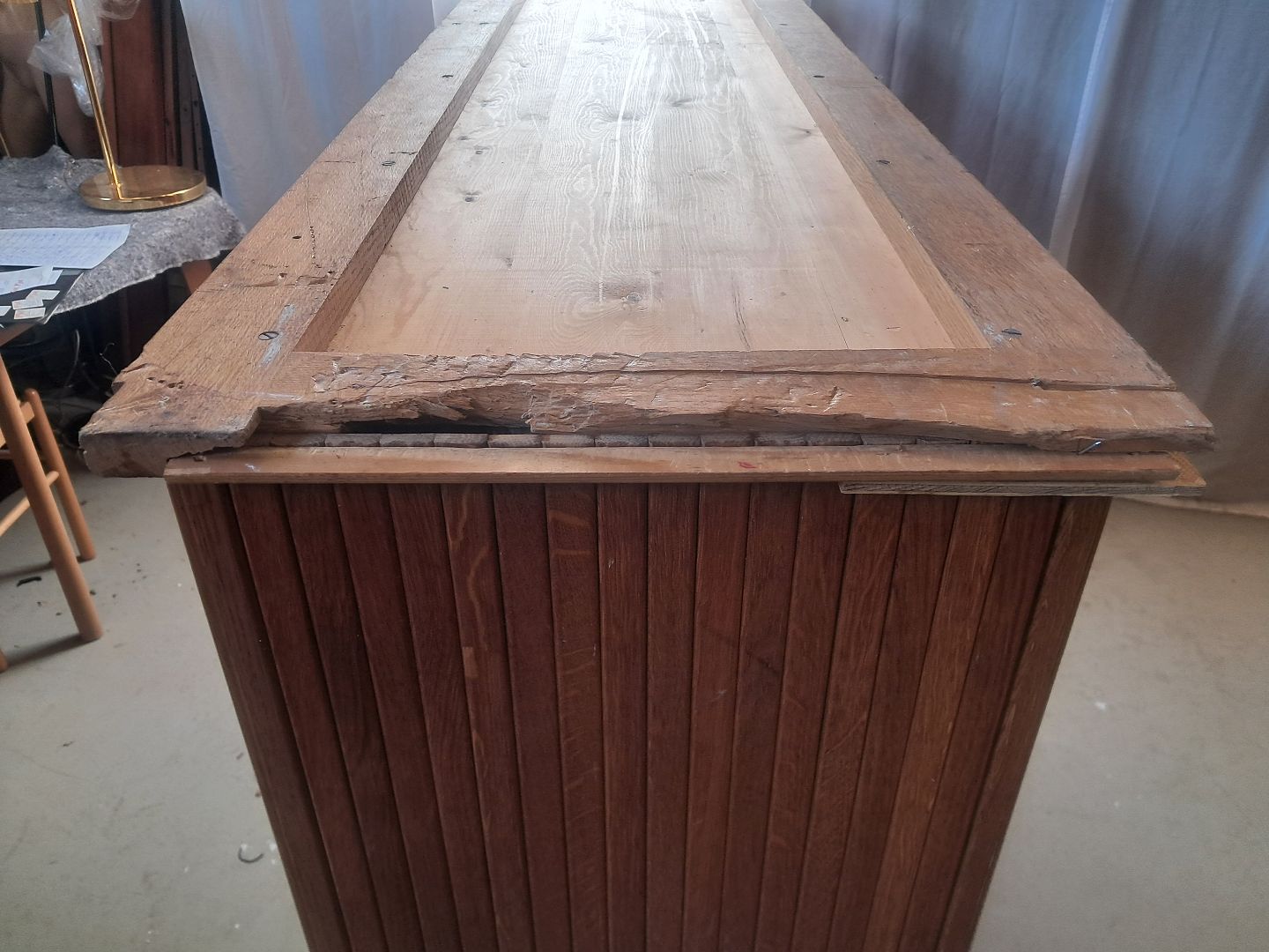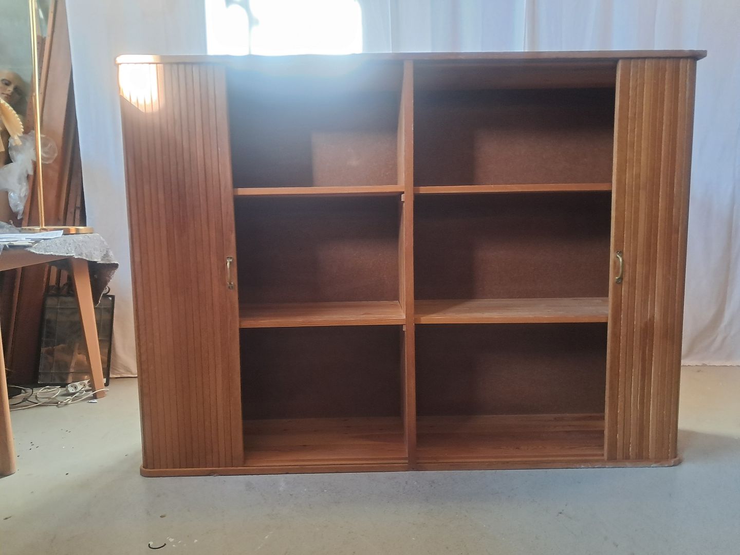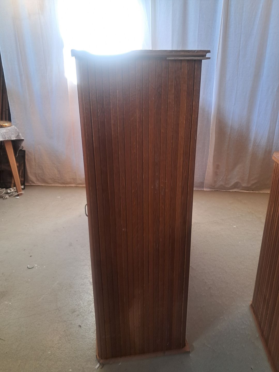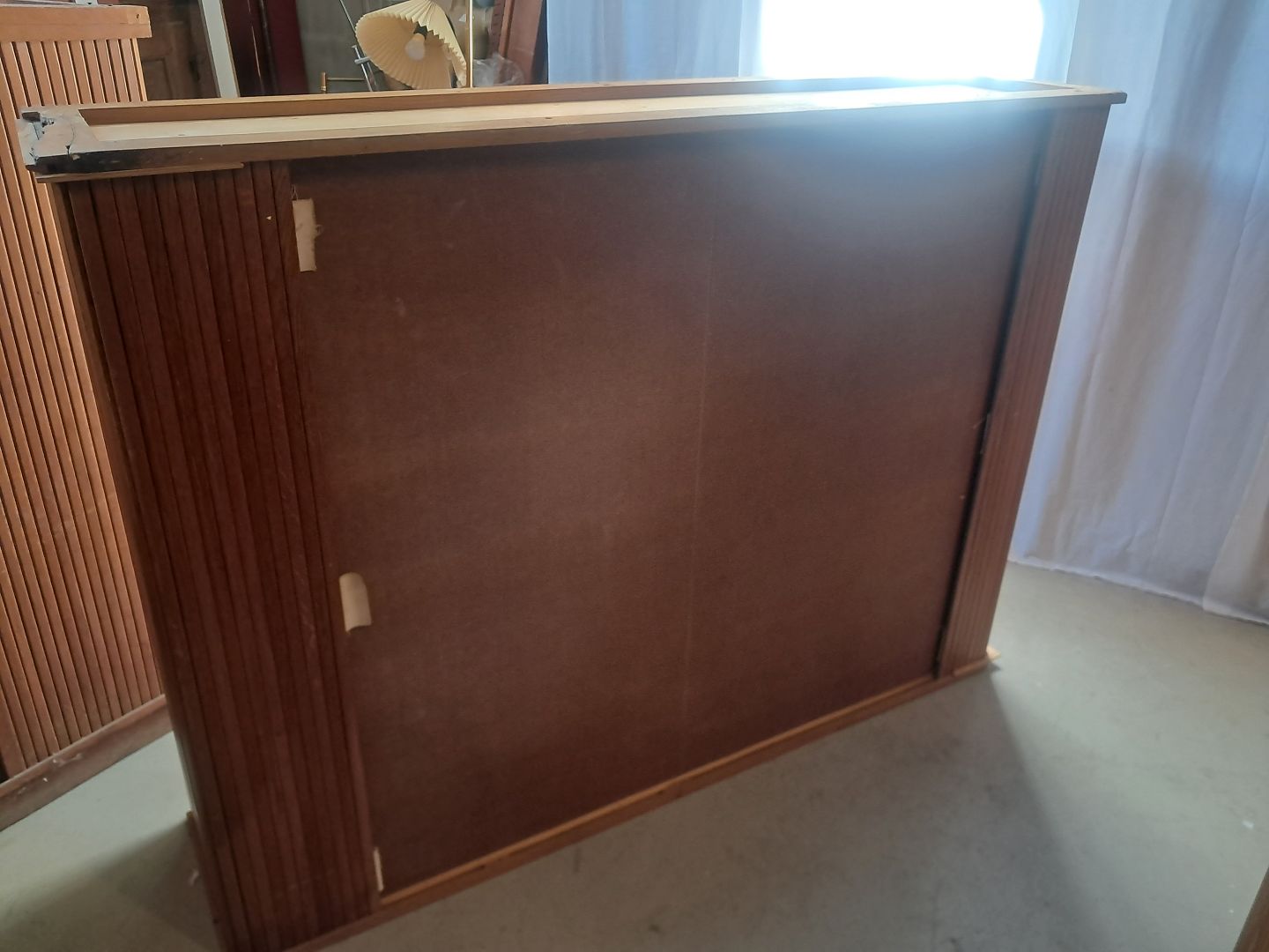 Jalousiskab i fineret egetræ, fra 1950erne.Det har brugsspor og defekter.