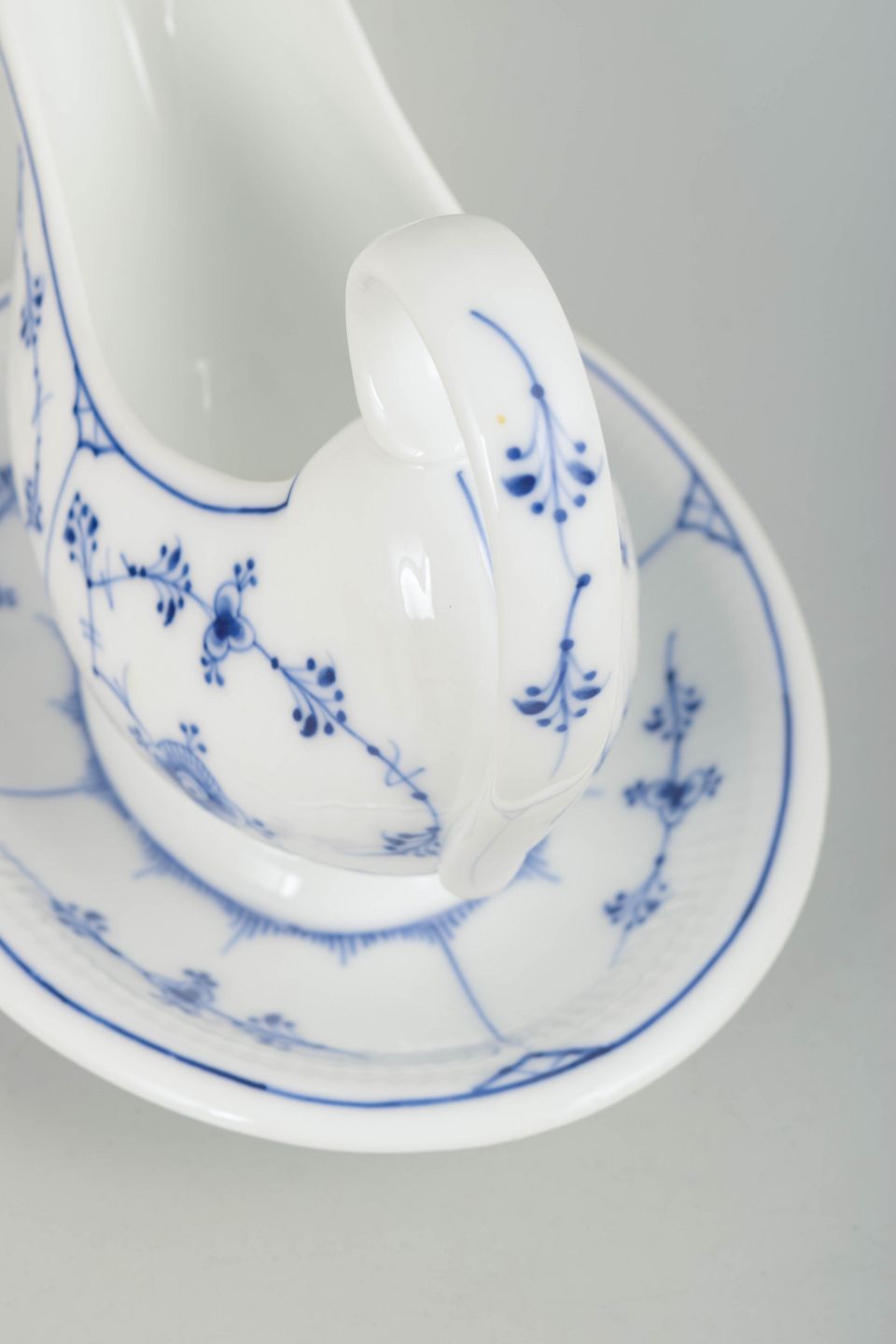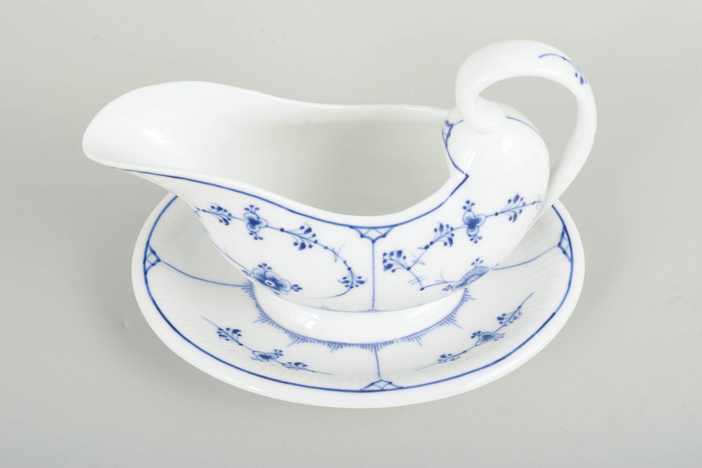 Royal Copenhagen Musselmalet Riflet, sjælden antik sauceskål.Sjælden antik sauceskål i håndmalet porcelæn fra Musselmalet Riflet med klassisk underglasurdekoration i koboltblå. Model 1/201. Med fast integreret underdel udført i ét stykke sammen med skålen. Første sortering. Fremstillet i 1890’erne.