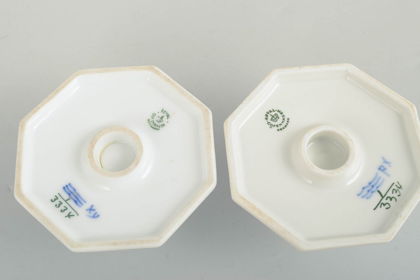 Royal Copenhagen Musselmalet Riflet, par lysestager.Par lysestager i håndmalet porcelæn fra Musselmalet Riflet med klassisk underglasurdekoration i koboltblå. Model 1/3334. Den ene er første sortering, den anden annulleret med én indridset streg under bunden. Fremstillet 1963.