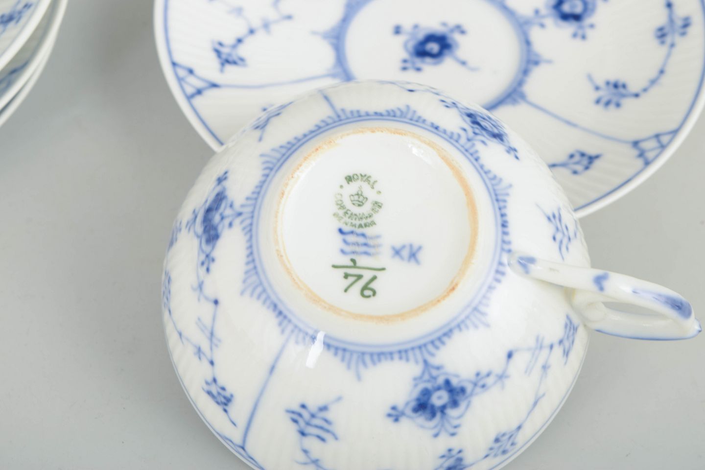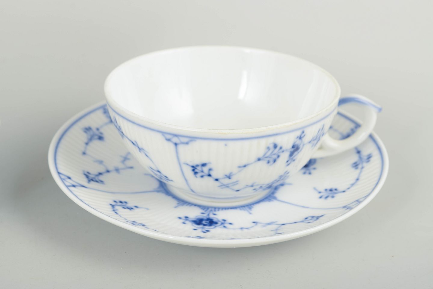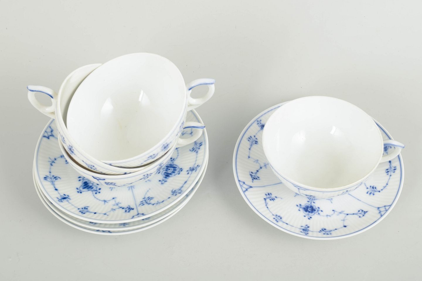 Royal Copenhagen Musselmalet Riflet, sæt af fire tekopper med tilhørende underkopper.