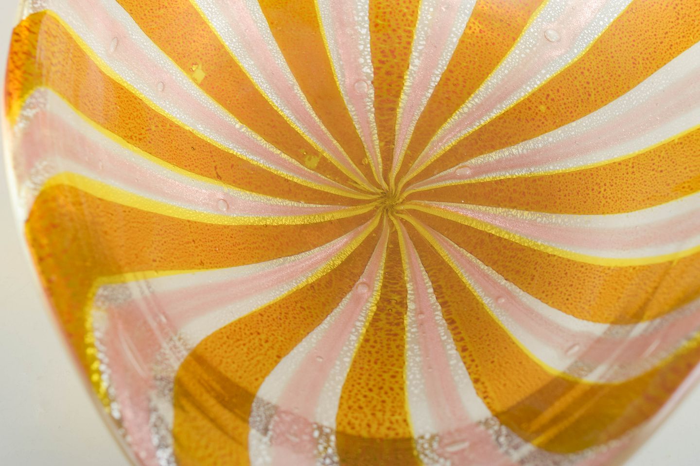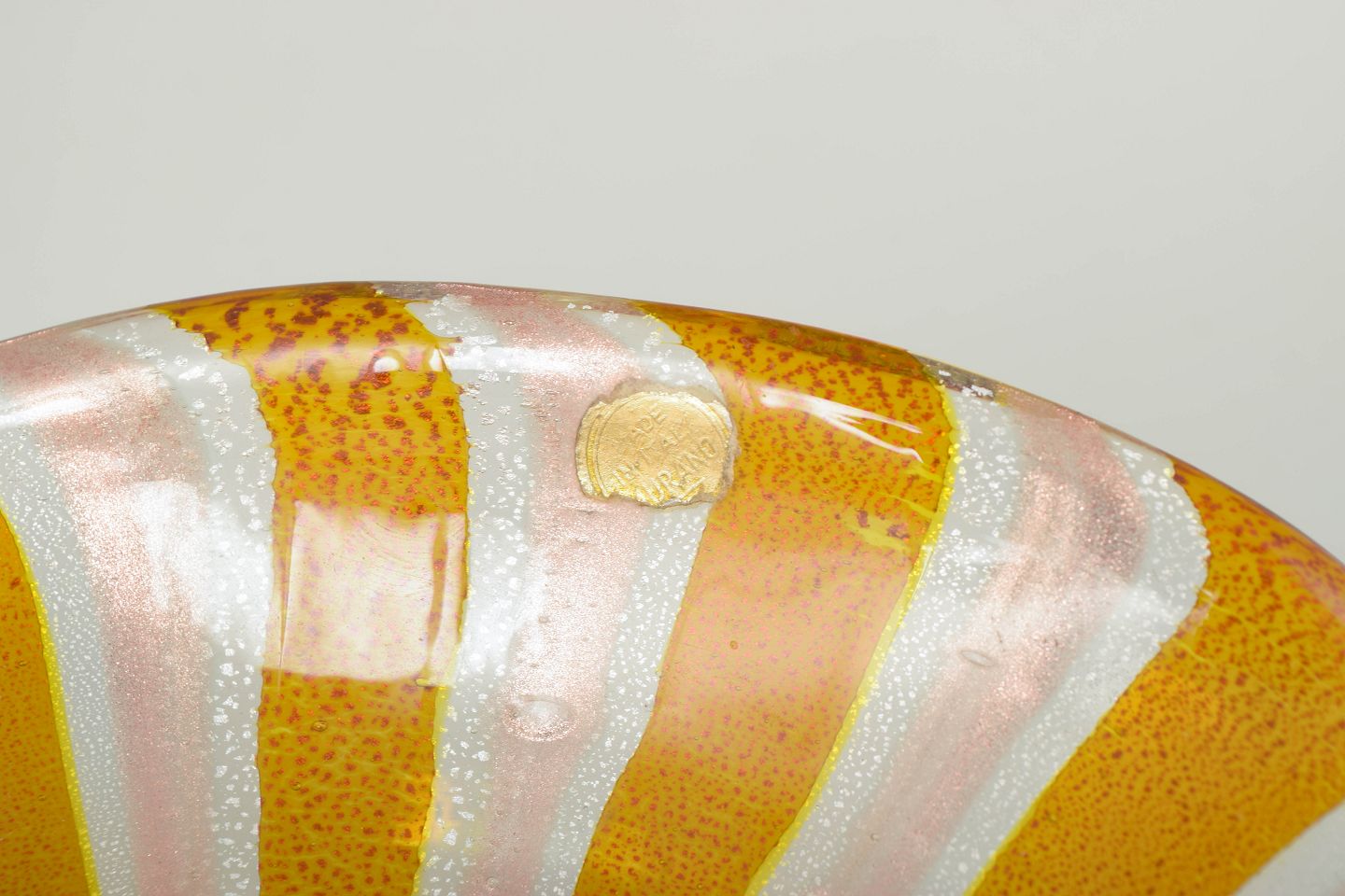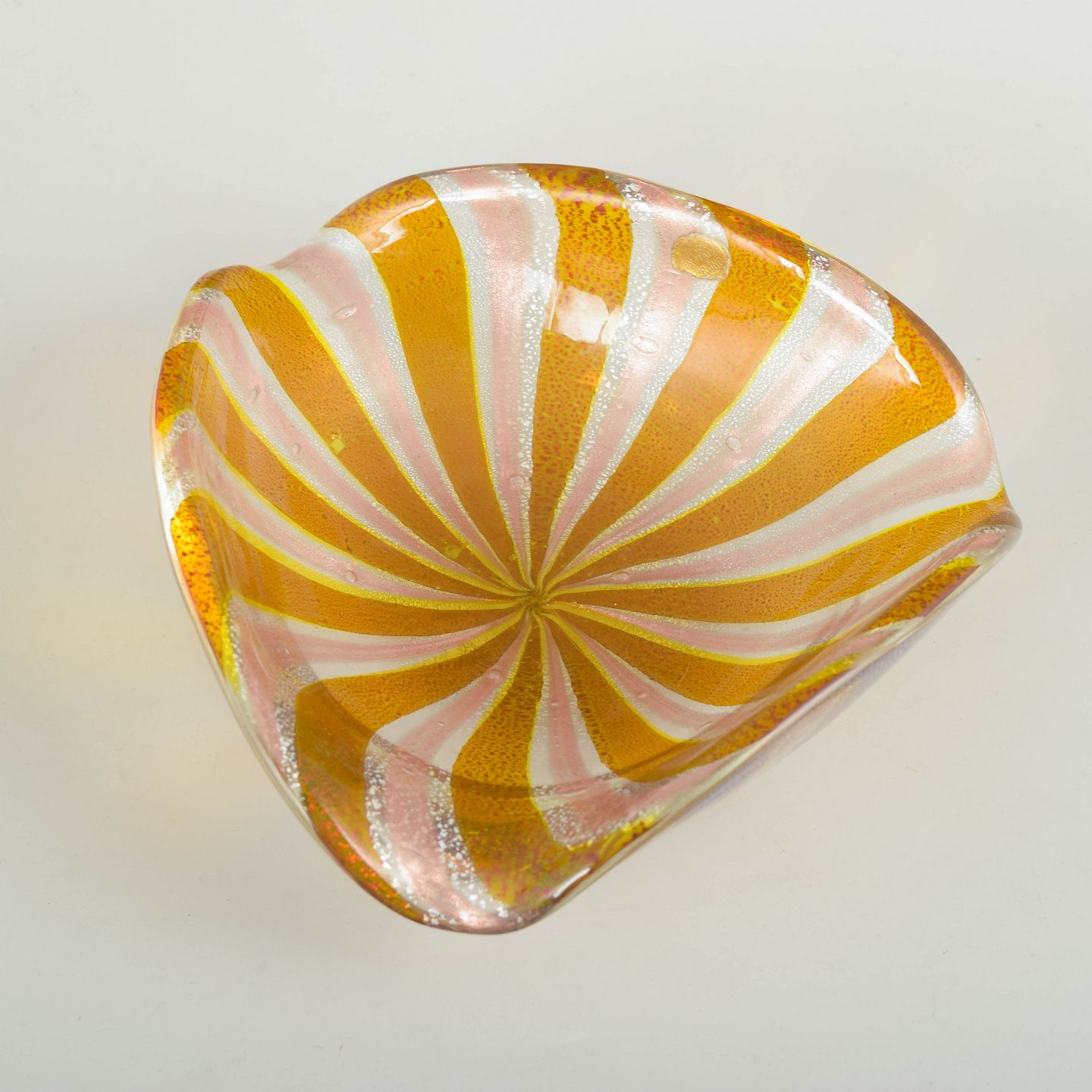 Murano skål, organisk form.Organisk formet skål i mundblæst glas med snoet rand. Udført i varme gule og hvide striber, aventurin teknik, og iriserende effekt. Mærkat bevaret. Fremstillet på Murano i 1960’erne/70’erne.