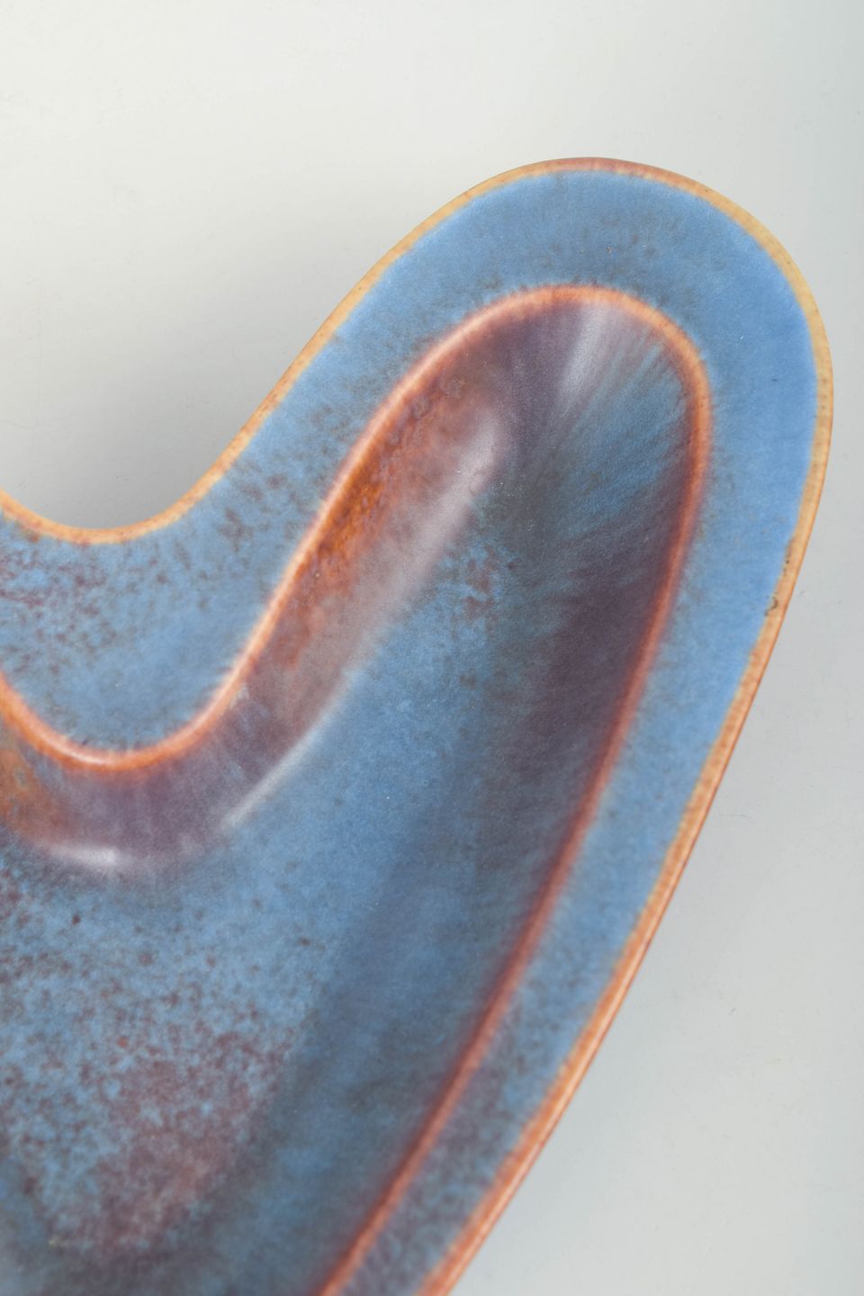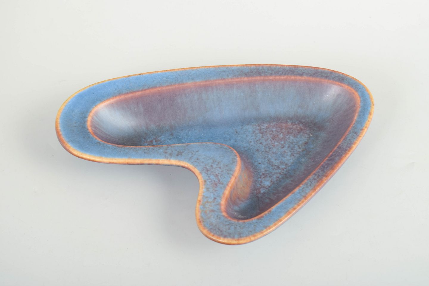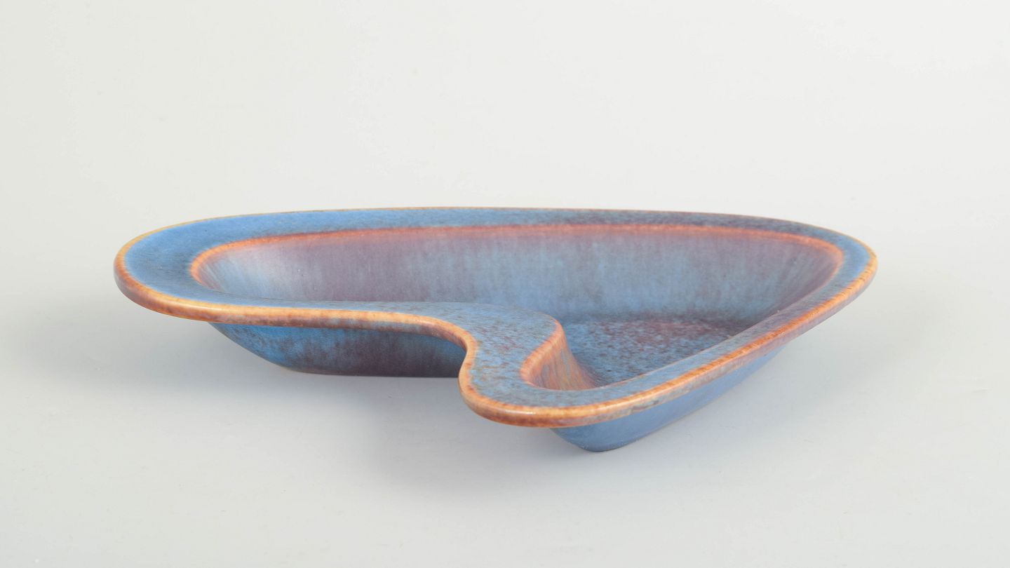 Gunnar Nylund for Rörstrand, skål.Organisk formet skål i stentøj med asymmetrisk, frit formet silhuet. Dekoreret med blå og violet glasur med varmtonet kant, typisk for Gunnar Nylunds eksperimenterende glasurer hos Rörstrand i midten af det 20. århundrede. Første sortering.