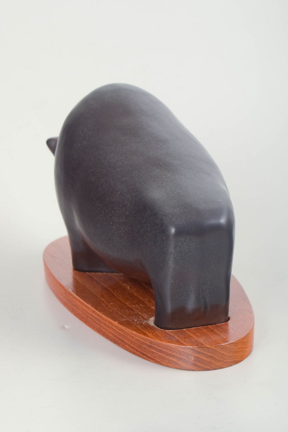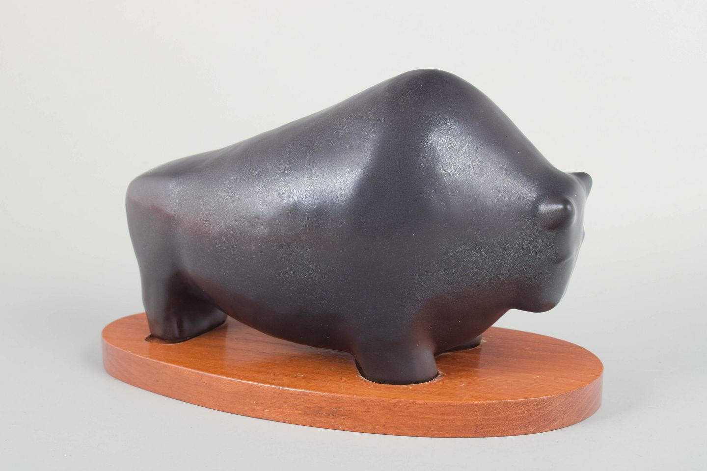 Lillemor Petersson for Rörstrand, figur af tyr på træfod.Kraftfuldt udformet tyr i mørk, matglaseret stentøj med kompakt, stiliseret form og markant volumen. Figuren er monteret på en oval træfod og fremstår med en enkel og modernistisk formgivning typisk for Rörstrands produktion i midten af det 20. århundrede. Første sortering.