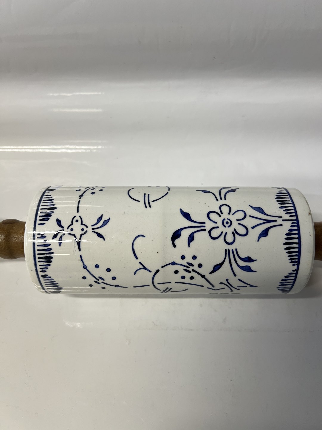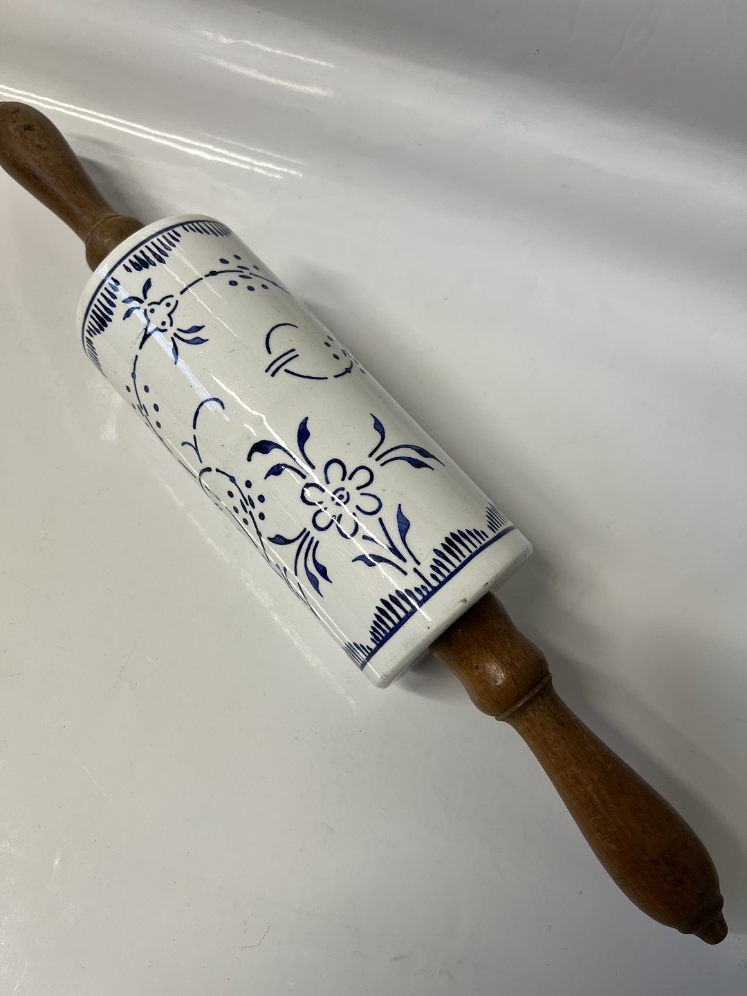 Kagerulle Musselmalet fajance med træ hank. Længde 41 cm.