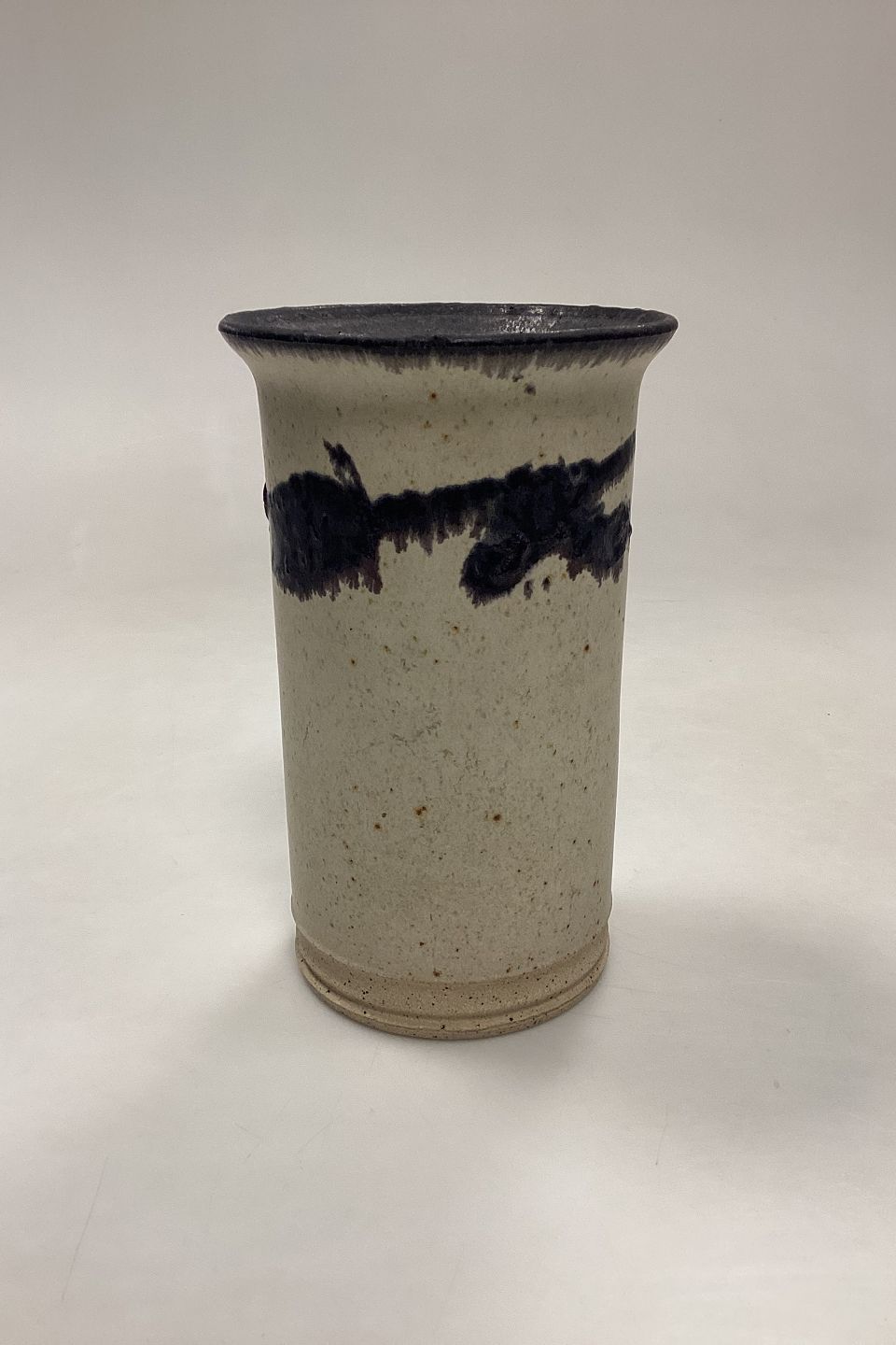 Bjørn Keramik Stentøjsvase. Nistret råhvid bund med mørk blålilla grafisk dekoration.Måler 18,5 cm / 7,28 in.