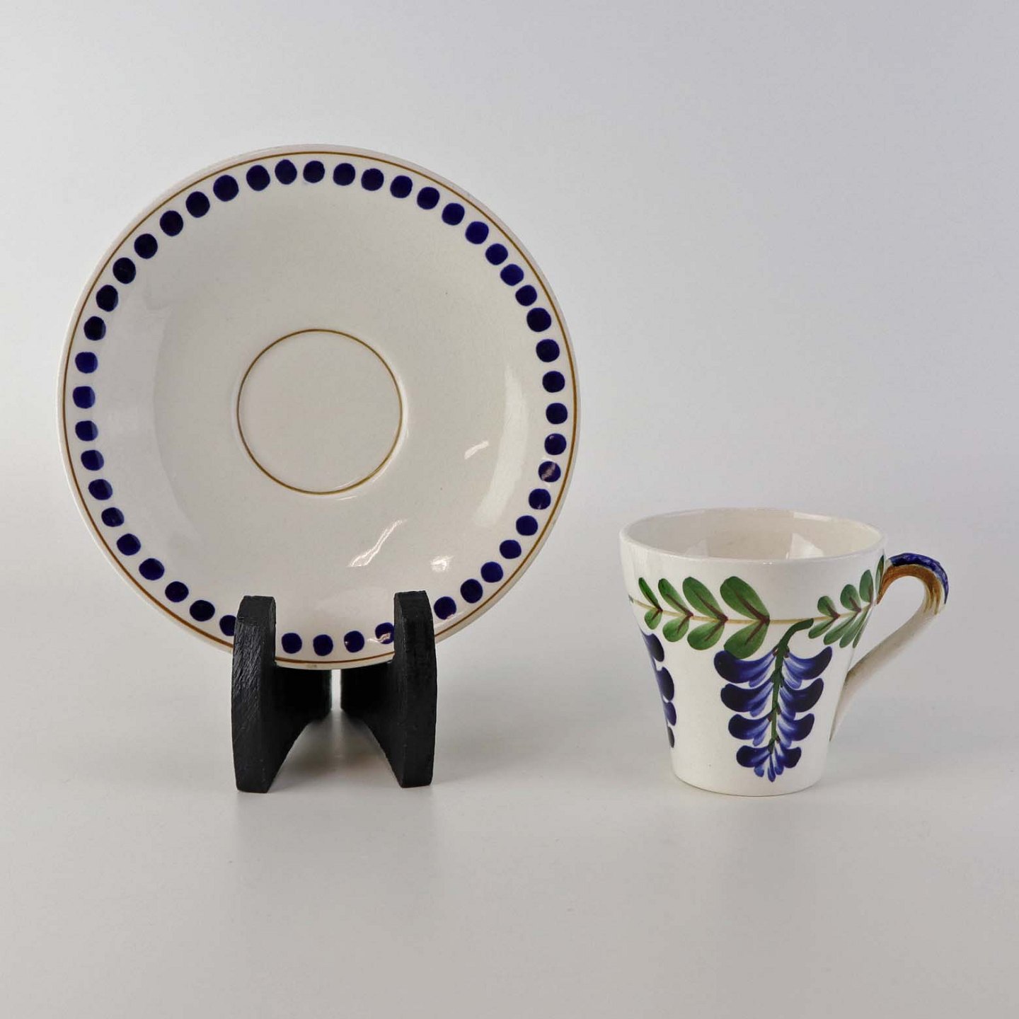 Fajancestel med dekoration af ranker af blåregn og blade på lys baggrund afsluttet med kant af runde blå pletter.
