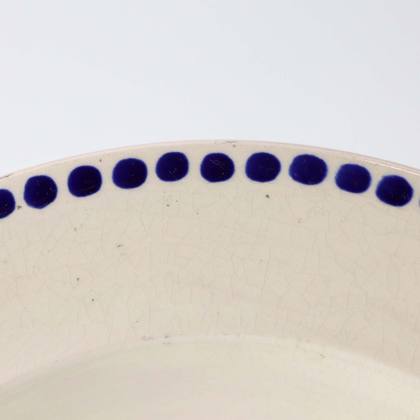 Fajancestel med dekoration af ranker af blåregn og blade på lys baggrund afsluttet med kant af runde blå pletter.