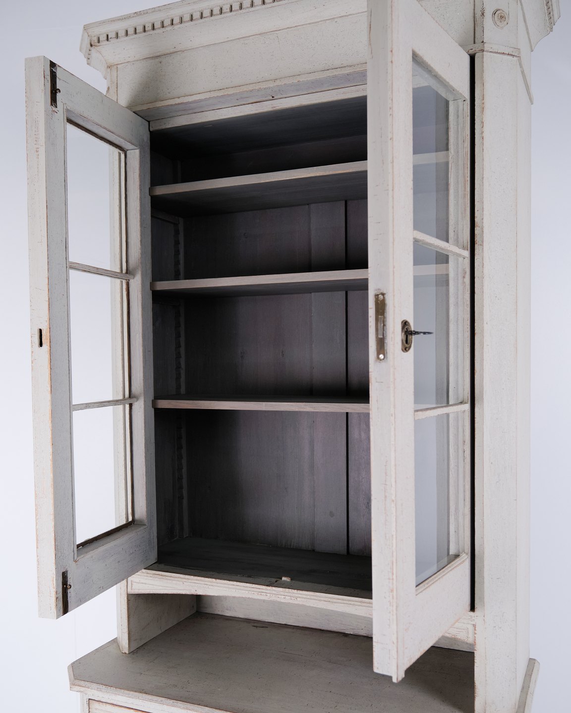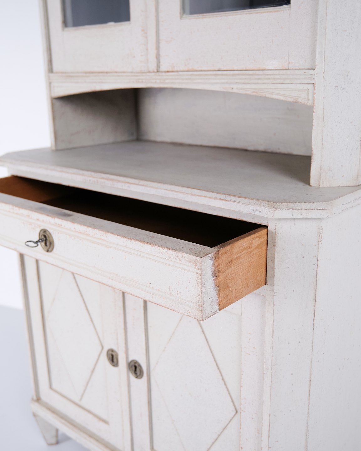 Großer schwedischer Vitrinenschrank aus der gustavianischen Periode, um die 1790er Jahre. Glastüren, Regale und Schublade.Der Schrank steht auf eleganten, konischen Beinen und besitzt einen oberen Teil mit Glastüren, der ihm ein leichtes und klassisches Erscheinungsbild verleiht. Im Inneren befinden sich vier Regalböden im Vitrinenteil, während der untere Teil sowohl eine praktische Schublade als auch Stauraum bietet.