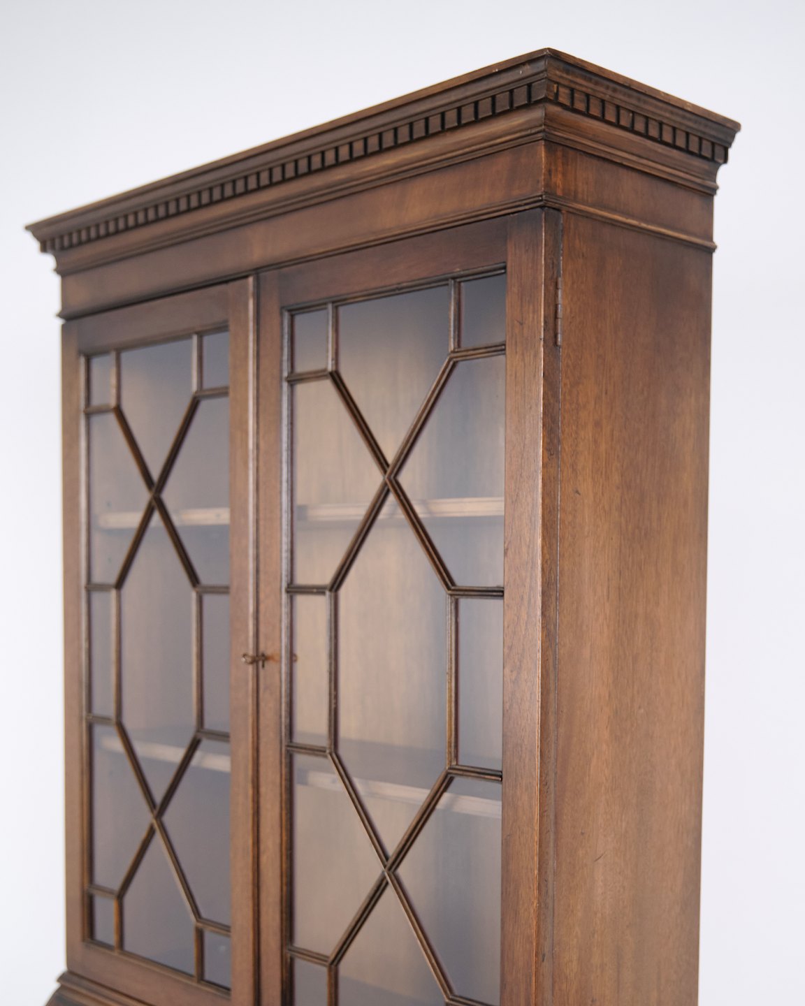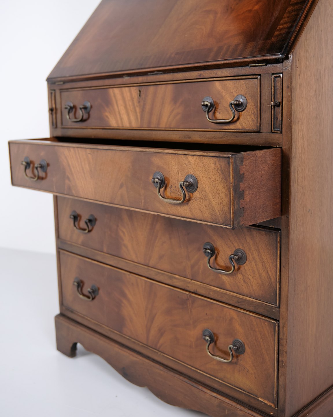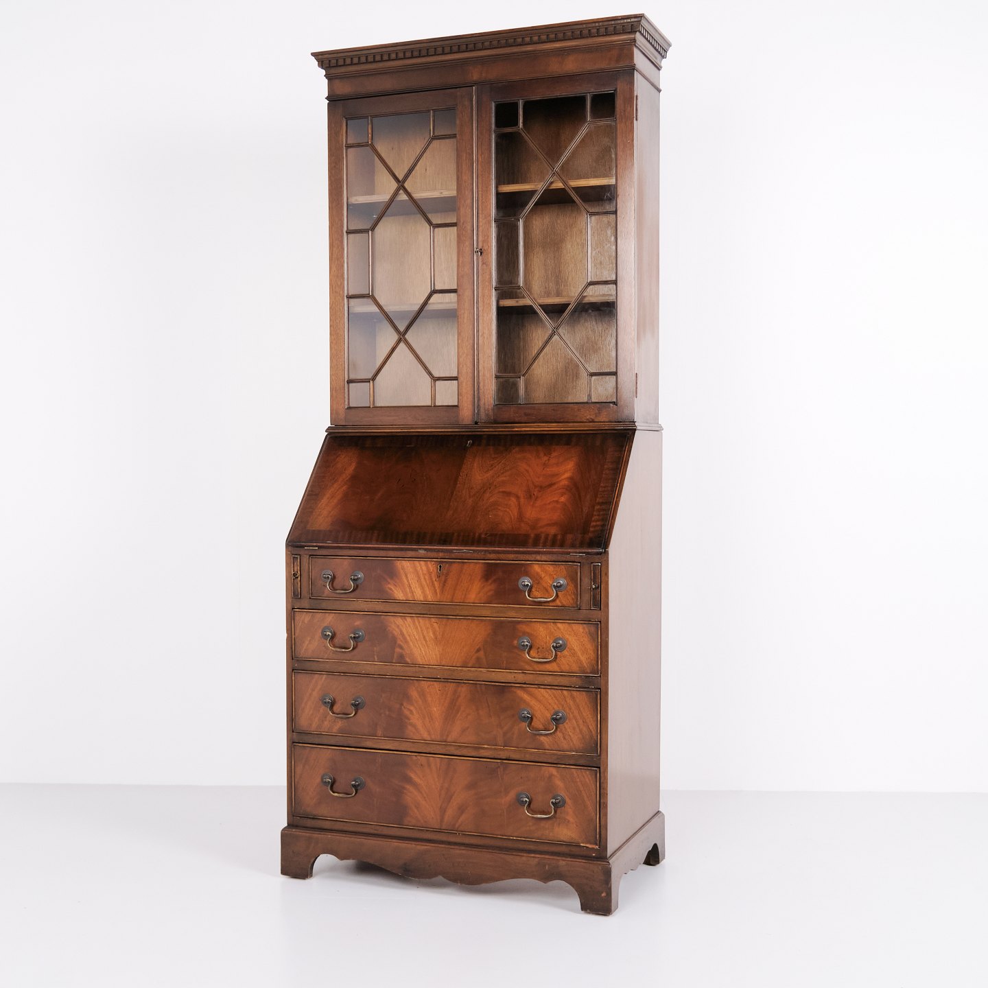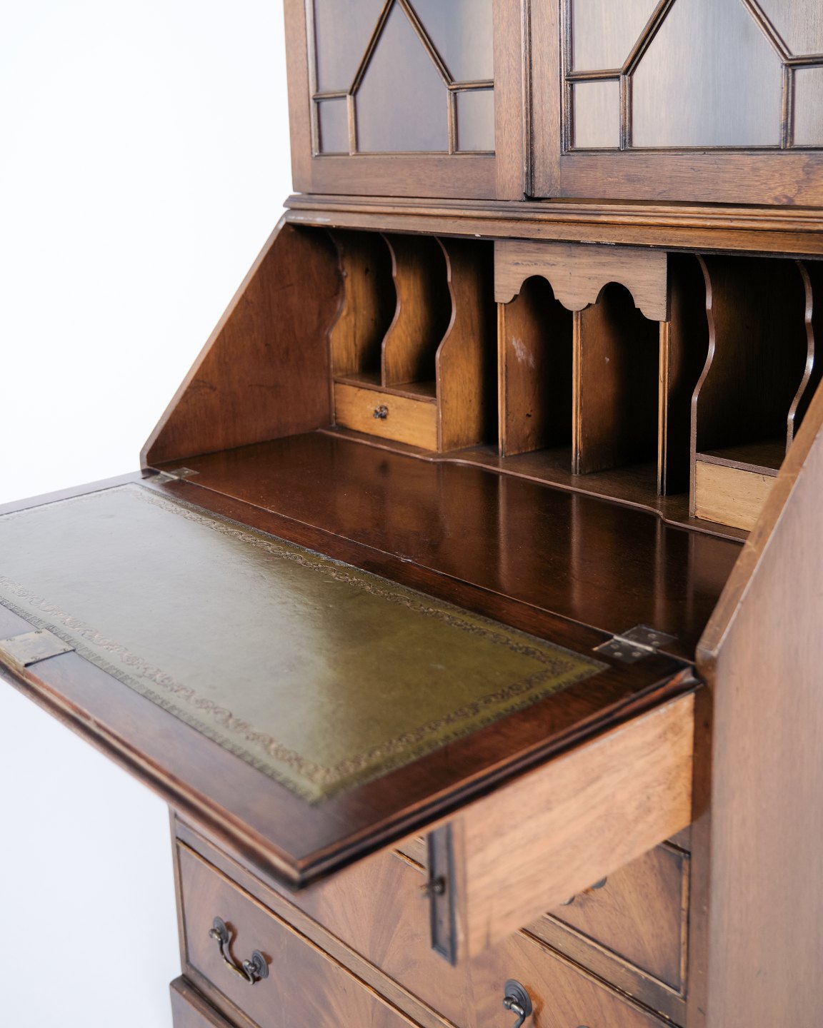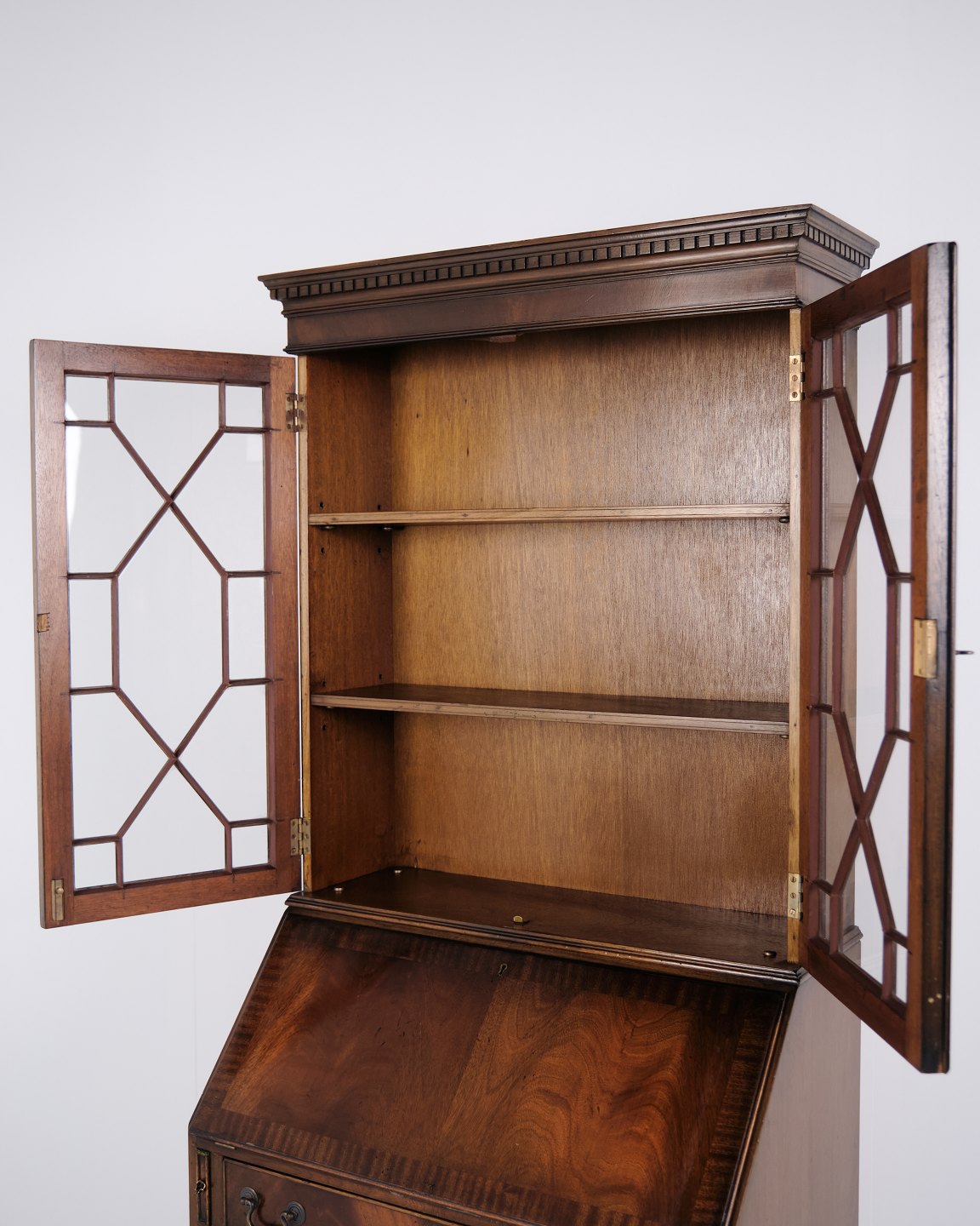 Sekretär aus Mahagoni mit Schreibklappe und Vitrine im klassischen englischen Stil aus etwa 1890. Elegantes und funktionales antikes Möbel.— Herkunft: England / Europa