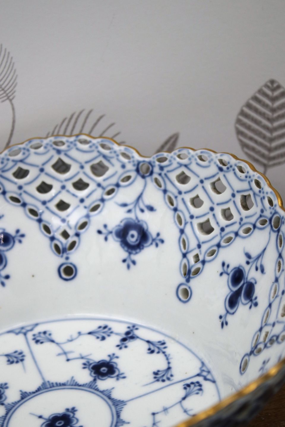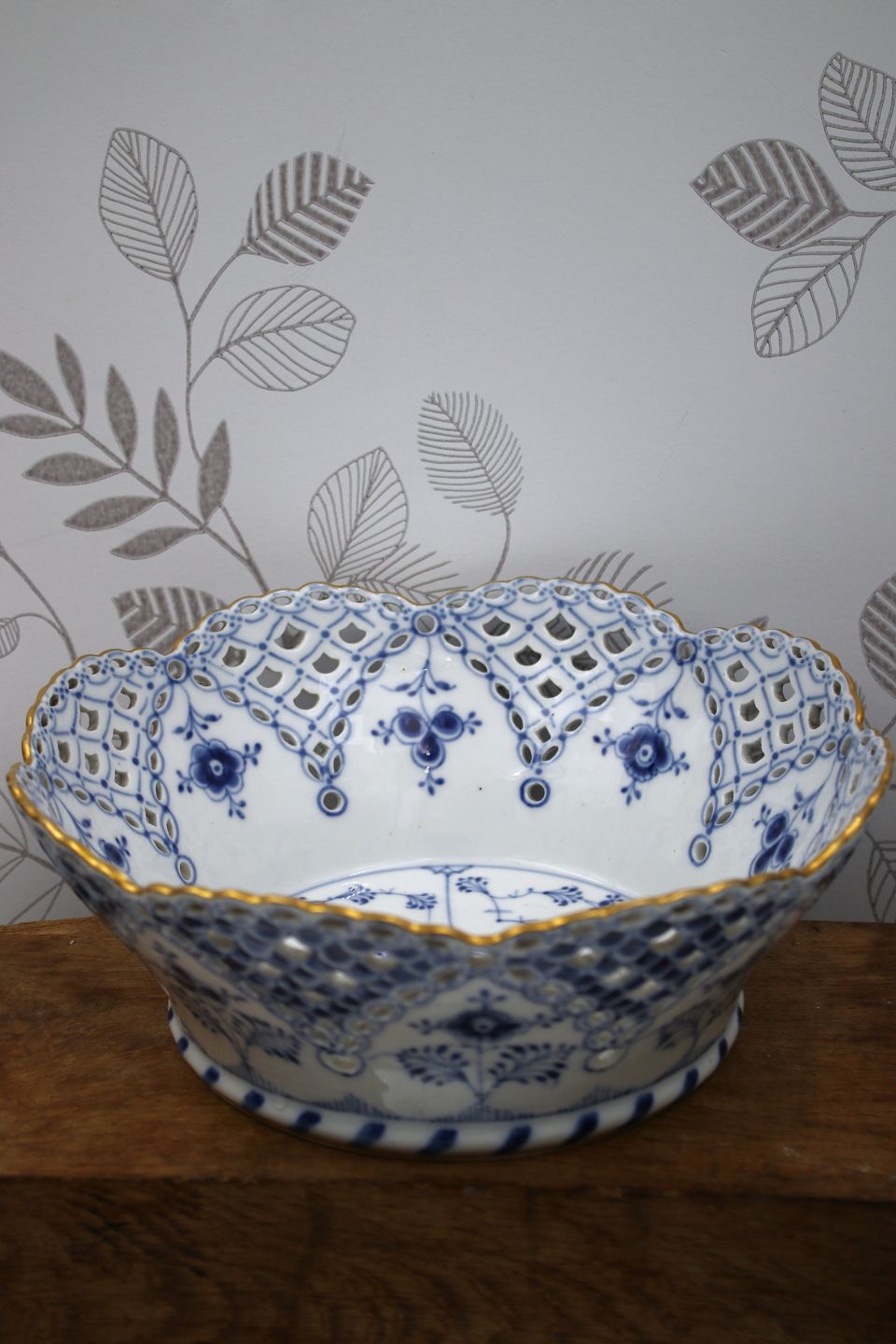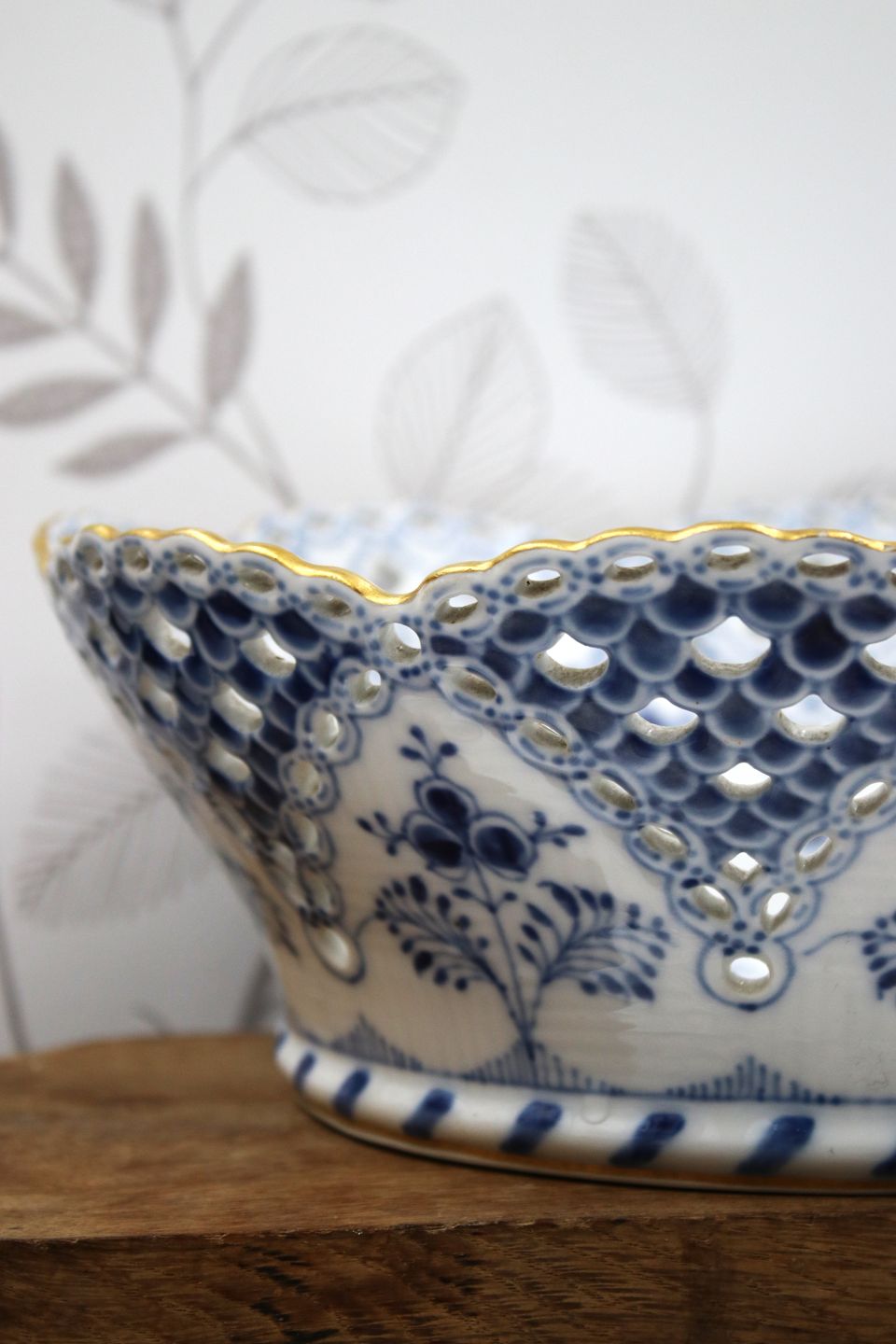 Antik Musselmalet frugtskål med gennembrudt kant og guldkant.1898-1923...