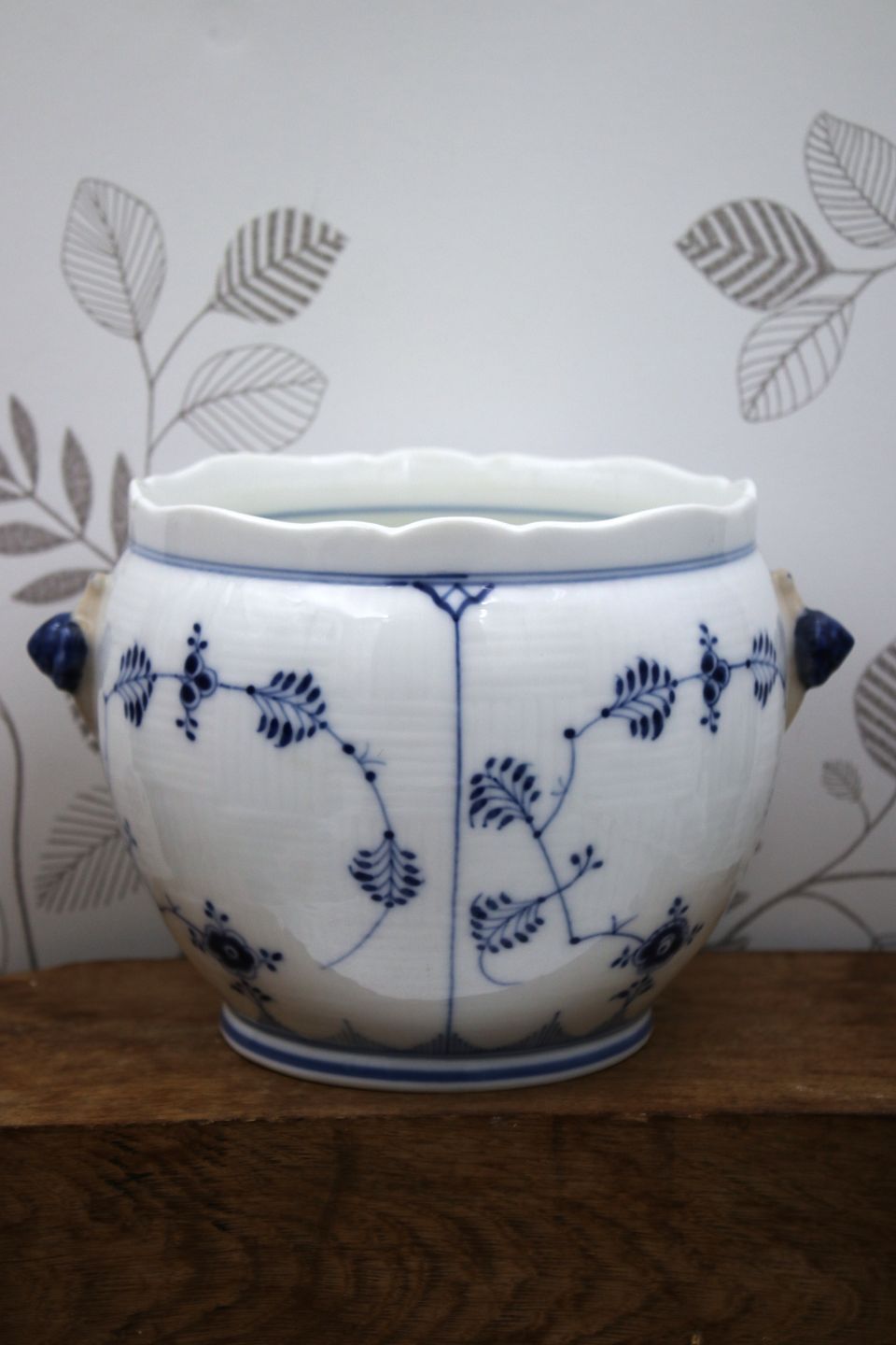 Sjælden Musselmalet Riflet blomsterpotteskjuler fra Royal Copenhagen.Dekorationsnummer: 1/125. 1.sort. 1898-1923.