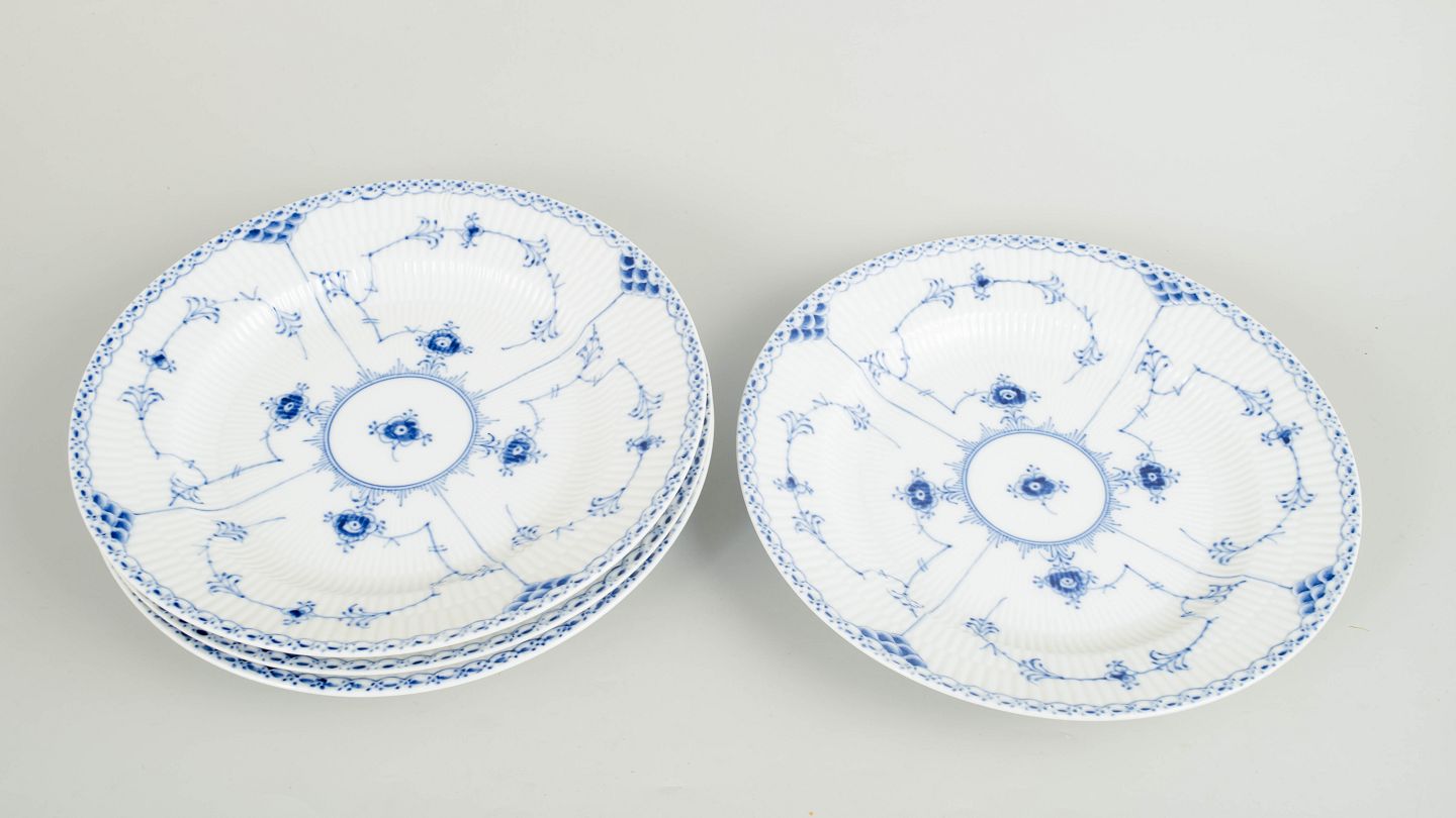 Royal Copenhagen Musselmalet Halvblonde, sæt af fire middagstallerkener.